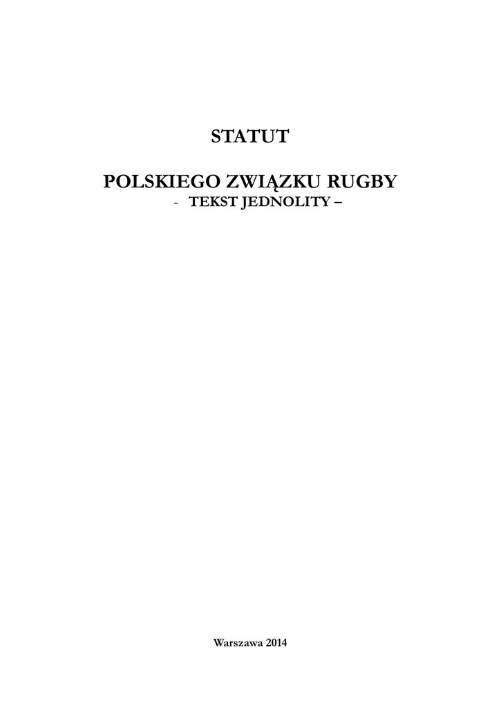 STATUT POLSKIEGO ZWIĄZKU RUGBY - TEKST JEDNOLITY – Warszawa 2014 STATUT POLSKIEGO ZWIĄZKU RUGBY Rozdział I Postanowienia ogólne §1. Polski Związek Rugby (w skrócie PZR), zwany dalej „Związkiem”, jest polskim związkiem sportowym w rozumieniu art. 7 ustawy z dnia 25 czerwca 2010 r. (Dz. U. 2010 nr 127 poz. 857 z późn. zm.), zrzeszającym kluby sportowe, związki sportowe oraz inne osoby prawne działające w sporcie rugby §2. Terenem działania Związku jest obszar Rzeczypospolitej Polskiej, a siedzibą władz miasto stołeczne Warszawa. Dla właściwego realizowania swoich celów Związek może prowadzić działalność poza granicami Rzeczypospolitej Polskiej. §3. 1. Związek samodzielnie określa swoje cele, programy działania i struktury organizacyjne oraz uchwala akty wewnętrzne określające jego działalność. 2. Związek posiada osobowość prawną i jest jedynym reprezentantem rugby w kraju i zagranicą. 3. Związek działa w zakresie rugby 15-osobowego, 7-osobowego oraz wszystkich innych odmian, w tym dotyczących kobiet, mężczyzn, dzieci i młodzieży. §4. 1. Związek działa zgodnie z porządkiem prawnym Rzeczypospolitej Polskiej w tym: ustawą z dnia 25 czerwca 2010 r. o sporcie (Dz.U. 2010 nr 127 poz. 857 z późn. zm.), ustawą z dnia 7 kwietnia 1989 r. - Prawo o stowarzyszeniach (Dz.U. 1989 nr 20 poz. 104 z późn. zm.) oraz niniejszym statutem. 2. W zakresie swojej działalności Związek podlega nadzorowi ministra właściwego do spraw kultury fizycznej. 3. Związek podlega rejestracji w Krajowym Rejestrze Sądowym. 4. Związek może być organizacją pożytku publicznego. §5. Związek w ramach swojej działalności współpracuje z okręgowymi związkami rugby, klubami sportowymi oraz innymi organizacjami sportowymi, bądź instytucjami. §6. Związek jest członkiem Europejskiego Stowarzyszenia Rugby (FIRA-AER) i Ogólnoświatowej Federacji Rugby (IRB) oraz może być członkiem innych organizacji międzynarodowych o podobnym profilu działania. §7. Związek może posiadać sztandar, flagę i odznaki organizacyjne oraz używać pieczęci zgodnie z obowiązującymi w tym zakresie przepisami. §8. Związek opiera swą działalność na pracy społecznej członków i działaczy. Do prowadzenia swoich spraw Związek może zatrudniać pracowników. Rozdział II Cele i sposoby realizacji §9. Celem związku jest: 1) organizacja, popularyzacja i rozwój współzawodnictwa sportowego w sporcie rugby w Polsce; 2) reprezentowanie interesu sportu rugby w organizacjach krajowych i międzynarodowych; 3) podejmowanie działań na rzecz promocji i rozwój rugby w formie amatorskiej i profesjonalnej; 4) reprezentowanie, ochrona praw i interesów oraz koordynacja działań wszystkich jego członków; 5) popularyzacja i rozwój kultury fizycznej oraz sportu, wśród dzieci i młodzieży szkolnej, a także młodzieży akademickiej; 6) koordynacja działalności członków w nim zrzeszonych. §10. Związek realizuje swoje cele w szczególności poprzez: 1) opracowywanie kierunków i programów rozwoju sportu rugby w kraju; 2) prowadzenie szkolenia i doszkalania zawodników, kadry szkoleniowej oraz sędziów we współdziałaniu z odpowiednimi instytucjami i organizacjami; 3) współpraca i nadzór nad okręgowymi związkami rugby; 4) sprawowanie wszechstronnej opieki szkoleniowej i wychowawczej nad członkami Związku oraz kontroli nad przestrzeganiem przez nich statutu, postanowień i regulaminów oraz przepisów i zasad uprawiania sportu; 5) organizacja i prowadzenie współzawodnictwa sportowego w sporcie rugby, w tym współzawodnictwa o tytuł Mistrza Polski i Puchar Polski; 6) reprezentowanie polskiego rugby w międzynarodowych organizacjach sportowych oraz organizowanie udziału w międzynarodowym współzawodnictwie sportowym; 7) powoływanie i przygotowywanie kadry narodowej do uczestnictwa w międzynarodowym współzawodnictwie sportowym; 8) realizacja całokształtu spraw związanych z przyznawaniem i pozbawianiem licencji dla: a) zawodników, b) sędziów, c) szkoleniowców, d) klubów sportowych; 9) określanie szczegółowych praw i obowiązków zawodników; 10) ustanawianie: a) reguł sportowych, organizacyjnych i dyscyplinarnych, dotyczących współzawodnictwa sportowego w sporcie rugby; b) zasad i trybu zmian barw klubowych przez zawodników, c) wewnętrznych przepisów dotyczących zwalczania dopingu; 11) prowadzenie postępowania dyscyplinarnego, w tym nakładanie kar dyscyplinarnych i sankcji regulaminowych na członków Związku, zawodników, szkoleniowców, sędziów i działaczy dopuszczających się naruszenia postanowień niniejszego Statutu, regulaminów, uchwał oraz innych przepisów i zasad obowiązujących w sporcie rugby; 12) rozstrzyganie sporów powstałych między członkami Związku w wyniku ich działalności statutowej w sporcie rugby; 13) prowadzenie działalności w zakresie publicznych oraz niepublicznych szkół sportowych, a także szkół mistrzostwa sportowego, 14) wspomaganie działalności uczniowskich klubów sportowych 15) organizowanie zawodów, imprez sportowych i rekreacyjnych, dla dzieci i młodzieży, w tam także międzynarodowych i międzypaństwowych; 16) organizowanie kursów, konferencji, seminariów szkoleniowych dla zawodników, szkoleniowców oraz sędziów i działaczy sportowych; 17) organizowanie koloni i obozów dla dzieci oraz młodzieży szkolnej; 18) realizacja ogólnokrajowego systemu współzawodnictwa, w tym rozgrywek mistrzowskich w rugby 15osobowym i rugby 7- osobowym, mających na celu wyłonienie Mistrzów Polski w określonych kategoriach i grupach wiekowych; 19) prowadzenie ewidencji, statystyki, dokumentacji, zasobów archiwalnych oraz wydawanie sprawozdań rocznych i materiałów informacyjnych dotyczących działalności Związku; 20) podejmowanie różnorodnych działań mających na celu uzyskaniu środków finansowych na realizację zadań statutowych; 21) zrzeszanie stowarzyszeń