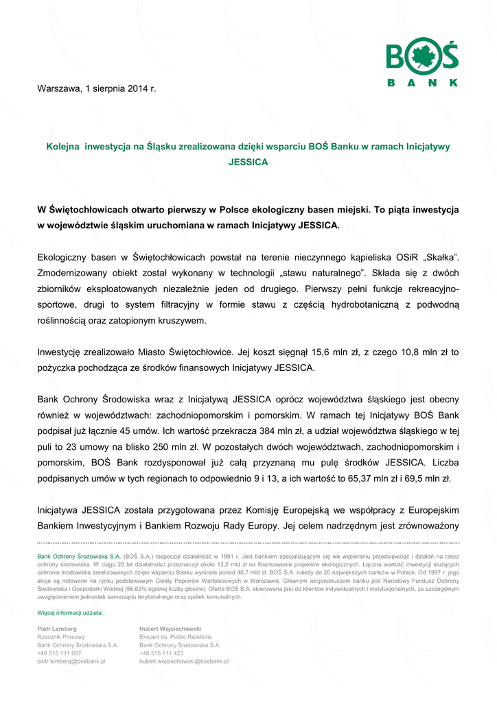 Warszawa, 1 sierpnia 2014 r. Kolejna inwestycja na Śląsku zrealizowana dzięki wsparciu BOŚ Banku w ramach Inicjatywy JESSICA W Świętochłowicach otwarto pierwszy w Polsce ekologiczny basen miejski. To piąta inwestycja w województwie śląskim uruchomiana w ramach Inicjatywy JESSICA. Ekologiczny basen w Świętochłowicach powstał na terenie nieczynnego kąpieliska OSiR „Skałka”. Zmodernizowany obiekt został wykonany w technologii „stawu naturalnego”. Składa się z dwóch zbiorników eksploatowanych niezależnie jeden od drugiego. Pierwszy pełni funkcje rekreacyjnosportowe, drugi to system filtracyjny w formie stawu z częścią hydrobotaniczną z podwodną roślinnością oraz zatopionym kruszywem. Inwestycję zrealizowało Miasto Świętochłowice. Jej koszt sięgnął 15,6 mln zł, z czego 10,8 mln zł to pożyczka pochodząca ze środków finansowych Inicjatywy JESSICA. Bank Ochrony Środowiska wraz z Inicjatywą JESSICA oprócz województwa śląskiego jest obecny również w województwach: zachodniopomorskim i pomorskim. W ramach tej Inicjatywy BOŚ Bank podpisał już łącznie 45 umów. Ich wartość przekracza 384 mln zł, a udział województwa śląskiego w tej puli to 23 umowy na blisko 250 mln zł. W pozostałych dwóch województwach, zachodniopomorskim i pomorskim, BOŚ Bank rozdysponował już całą przyznaną mu pulę środków JESSICA. Liczba podpisanych umów w tych regionach to odpowiednio 9 i 13, a ich wartość to 65,37 mln zł i 69,5 mln zł. Inicjatywa JESSICA została przygotowana przez Komisję Europejską we współpracy z Europejskim Bankiem Inwestycyjnym i Bankiem Rozwoju Rady Europy. Jej celem nadrzędnym jest zrównoważony Bank Ochrony Środowiska S.A. (BOŚ S.A.) rozpoczął działalność w 1991 r. Jest bankiem specjalizującym się we wspieraniu przedsięwzięć i działań na rzecz ochrony środowiska. W ciągu 23 lat działalności przeznaczył około 13,2 mld zł na finansowanie projektów ekologicznych. Łączna wartość inwestycji służących ochronie środowiska zrealizowanych dzięki wsparciu Banku wyniosła ponad 40,7 mld zł. BOŚ S.A. należy do 20 największych banków w Polsce. Od 1997 r. jego akcje są notowane na rynku podstawowym Giełdy Papierów Wartościowych w Warszawie. Głównym akcjonariuszem banku jest Narodowy Fundusz Ochrony Środowiska i Gospodarki Wodnej (56,62% ogólnej liczby głosów). Oferta BOŚ S.A. skierowana jest do klientów indywidualnych i instytucjonalnych, ze szczególnym uwzględnieniem jednostek samorządu terytorialnego oraz spółek komunalnych. Więcej informacji udziela: Piotr Lemberg Rzecznik Prasowy Bank Ochrony Środowiska S.A. +48 515 111 087 [email protected] Hubert Wojciechowski Ekspert ds. Public Relations Bank Ochrony Środowiska S.A. +48 515 111 423 [email protected] rozwój obszarów miejskich, w tym ich rewitalizacja. Środki JESSICA, w postaci niskooprocentowanych pożyczek, finansują różnego rodzaju projekty spełniające kryteria wybranych działań Regionalnych Programów Operacyjnych. Więcej informacji: www.bosbank.pl Bank Ochrony Środowiska S.A. (BOŚ S.A.) rozpoczął działalność w 1991 r. Jest bankiem specjalizującym się we wspieraniu przedsięwzięć i działań na rzecz ochrony środowiska. W ciągu 23 lat działalności przeznaczył około 13,2 mld zł na finansowanie projektów ekologicznych. Łączna wartość inwestycji służących ochronie środowiska zrealizowanych dzięki wsparciu Banku wyniosła ponad 40,7 mld zł. BOŚ S.A. należy do 20 największych banków w Polsce. Od 1997 r. jego akcje są notowane na rynku podstawowym Giełdy Papierów Wartościowych w Warszawie. Głównym akcjonariuszem banku jest Narodowy Fundusz Ochrony Środowiska i Gospodarki Wodnej (56,62% ogólnej liczby głosów). Oferta BOŚ S.A. skierowana jest do klientów indywidualnych i instytucjonalnych, ze szczególnym uwzględnieniem jednostek samorządu terytorialnego oraz spółek komunalnych. Więcej informacji udziela: Piotr Lemberg Rzecznik Prasowy Bank Ochrony Środowiska S.A. +48 515 111 087 [email protected] Hubert Wojciechowski Ekspert ds. Public Relations Bank Ochrony Środowiska S.A. +48 515 111 423 [email protected]