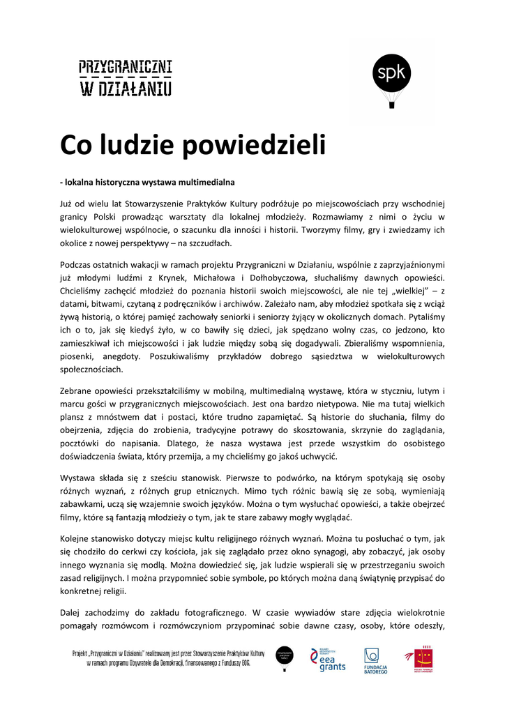 Co ludzie powiedzieli - lokalna historyczna wystawa multimedialna Już od wielu lat Stowarzyszenie Praktyków Kultury podróżuje po miejscowościach przy wschodniej granicy Polski prowadząc warsztaty dla lokalnej młodzieży. Rozmawiamy z nimi o życiu w wielokulturowej wspólnocie, o szacunku dla inności i historii. Tworzymy filmy, gry i zwiedzamy ich okolice z nowej perspektywy – na szczudłach. Podczas ostatnich wakacji w ramach projektu Przygraniczni w Działaniu, wspólnie z zaprzyjaźnionymi już młodymi ludźmi udźmi z Krynek, Michałowa i Dołhobyczowa, słuchaliśmy dawnych opowieści. Chcieliśmy zachęcić młodzież do poznania historii swoich miejscowości, ale nie tej „wielkiej” – z datami, bitwami, czytaną z podręczników i archiwów. Zależało nam, aby młodzież spotkała spotka się z wciąż żywą historią, o której pamięć zachowały seniorki i seniorzy żyjący w okolicznych domach. Pytaliśmy ich o to, jak się kiedyś żyło, w co bawiły się dzieci, jak spędzano wolny czas, co jedzono, kto zamieszkiwał ich miejscowości i jak ludzie między mi sobą się dogadywali. Zbieraliśmy bieraliśmy wspomnienia, piosenki, anegdoty. Poszukiwaliśmy przykładów dobrego sąsiedztwa w wielokulturowych społecznościach. Zebrane opowieści przekształciliśmy w mobilną, multimedialną wystawę, która w styczniu, lutym i marcu gości ści w przygranicznych miejscowościach. miejscowościach Jest ona bardzo nietypowa. Nie ma tutaj wielkich plansz z mnóstwem dat i postaci, które trudno zapamiętać. Są historie do słuchania, filmy do obejrzenia, zdjęcia do zrobienia, tradycyjne potrawy do skosztowania, skrzynie skrzy do zaglądania, pocztówki do napisania. Dlatego, że nasza wystawa jest przede wszystkim do osobistego doświadczenia świata, który przemija, a my chcieliśmy go jakoś uchwycić. Wystawa składa się z sześciu stanowisk. Pierwsze to podwórko, na którym spotykają spoty się osoby różnych wyznań, z różnych grup etnicznych. Mimo tych różnic bawią się ze sobą, wymieniają zabawkami, uczą się wzajemnie swoich języków. Można o tym wysłuchać opowieści, a także obejrzeć filmy, które są fantazją młodzieży o tym, jak te stare zabawy mogły wyglądać. Kolejne stanowisko dotyczy miejsc kultu religijnego różnych wyznań. Można tu posłuchać o tym, jak się chodziło do cerkwi czy kościoła, jak się zaglądało przez okno synagogi, aby zobaczyć, jak osoby innego wyznania się modlą. Można dowiedzieć dowiedzieć się, jak ludzie wspierali się w przestrzeganiu swoich zasad religijnych. I można przypomnieć sobie symbole, po których można daną świątynię przypisać do konkretnej religii. Dalej zachodzimy do zakładu fotograficznego. W czasie wywiadów stare zdjęcia zdjęc wielokrotnie pomagały rozmówcom i rozmówczyniom przypominać sobie dawne czasy, osoby, które odeszły, stroje, w których kiedyś się chodziło. Okazywały się świetnym tłem dla opowieści. Młodzież przekonała się o tym, że zdjęcia współczesne i stare to dwie różne rzeczywistości. Dzisiaj każdy z nas ma aparat w telefonie, możemy zrobić sobie fotografię w każdej chwili, w naturalnej pozycji, znienacka, samemu czy samej sobie. Kiedyś przyjazd fotografa był szczególną okazją, na którą ludzie się specjalnie szykowali ali i ładnie ubierali. W czasie robienia zdjęcia nie zachowywali się naturalnie, tylko pozowali. Dlatego chcieliśmy udostępnić zwiedzającym możliwość poczucia się jak kiedyś. kiedyś Przywieźliśmy rzywieźliśmy ze sobą stare stroje i zachęcamy ich do przebierania się i robienia sobie „starych” zdjęć. Oczywiście po wysłuchaniu opowieści. Następnie przechodzimy do kuchni. Każda grupa etniczna, narodowa czy wyznaniowa ma swoje tradycyjne dania. Jednak, gdy mieszkają one obok siebie, te potrawy zaczynają się mieszać, przenikać do innych nych grup, inspirują się sobą wzajemnie. O tym są historie do wysłuchania na tym stanowisku. Można też nauczyć się przyrządzania tradycyjnych potraw dzięki filmom instruktażowym oraz spróbować macy, tradycyjnej dla kultury żydowskiej. Z pełnym brzuchem przechodzimy echodzimy do stanowiska dotyczącego migracji. Tak jak dzisiaj, kiedyś ludzie wyjeżdżali za pracą, aby poprawić swój byt, albo po to, by ratować swoje życie, ponieważ tam, gdzie żyli, toczyła się wojna. I o tym opowiadali nasi rozmówcy i rozmówczynie, o wyjazdach, wyj urwanych przyjaźniach, ale też o powrotach, często bardzo wzruszających. Na koniec można obejrzeć film „Znikające Krynki”. Jest to fantazja o tym, co by było, gdyby nie wydarzyła się II wojna światowa i holokaust. Jakie grupy etniczne zamieszkiwałyby zamieszkiwały kryneckie domy? Czy byliby wśród nich Żydzi i Żydówki? Jak by się nazywali? Czym by się zajmowali? Czy lubiliby chodzić do synagogi? Czy przyjaźniliby się z prawosławnymi, katolickimi i muzułmańskimi mieszkańcami i mieszkankami okolic? Młodzież biorąca udział w projekcie wybrała się na miejscowy kirkut, by poznać imiona i nazwiska Żydów i Żydówek pochowanych w Krynkach. W tym samym celu poszła na cmentarze katolicki i prawosławny. I uruchomiła wyobraźnię: jak by to mogło być… Film można obejrzeć pod tym linkiem: Wystawa stara się uchwycić przemijającą historię, umierające języki, a także dawną wielokulturowość, aby zrobić dla niej miejsce na nowo. Wystawę można obejrzeć jeszcze w Hajnówce (22-26.02.2016), (22 26.02.2016), Włodawie (29.02.-05.03.2016) (29.02. oraz Michałowie (04-09.03.2016). Przyjdź, zobacz, wysłuchaj.
