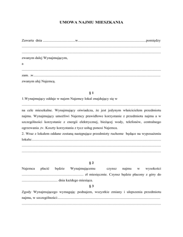 UMOWA NAJMU MIESZKANIA Zawarta dnia ...................................w..........................................................................pomiędzy ....................................................................................................................................................... ....................................................................................................................................................... zwanym dalej Wynajmującym, a ....................................................................................................................................................... zam. .w.......................................................................................................................................... zwanym alej Najemcą. §1 1.Wynajmujący oddaje w najem Najemcy lokal znajdujący się w ....................................................................................................................................................... na cele mieszkalne. Wynajmujący oświadcza, że jest jedynym właścicielem przedmiotu najmu. Wynajmujący umożliwi Najemcy prawidłowe korzystanie z przedmiotu najmu a w szczególności korzystanie z energii elektrycznej, bieżącej wody, telefonów, centralnego ogrzewania ,tv. Koszty korzystania z tycz usług ponosi Najemca. 2. Wraz z lokalem oddane zostaną następujące przedmioty ruchome będące na wyposażeniu lokalu:............................................................................................................................................ ....................................................................................................................................................... ....................................................................................................................................................... §2 Najemca płacić będzie Wynajmującemu czynsz najmu w wysokości ................................................................... zł miesięcznie. Czynsz będzie płacony z góry do ....................................... dnia każdego miesiąca. §3 Zgody Wynajmującego wymagają: podnajem, wszystkie zmiany i ulepszenia przedmiotu najmu, w szczególności:............................................................................................................... ....................................................................................................................................................... §4 Wynajmujący może podnieść czynsz najmu po uprzednim zawiadomieniu o tym Najemcy na ..................................................... naprzód. Jednorazowo nie można podnieść czynszu o więcej jak .......................... % umówionej miesięcznej stawki czynszu. §5 Najemca dokona we własnym zakresie konserwacji lokalu oraz napraw bieżących. §6 Umowa zostaje zawarta na czas .................................................................... Po okresie umowy Najemca zwolni lokal, opróżni go na własny koszt z wniesionych tam jego rzeczy. Zwróci również w stanie nie pogorszonym rzeczy wymienione w § 2 pkt 2 niniejszej umowy. §7 Każda ze stron może umowę wypowiedzieć z zachowaniem ...................................................... okresu wypowiedzenia. §8 1. Wynajmujący może rozwiązać umowę bez zachowania terminów wypowiedzenia, jeżeli Najemca zalega z należnym czynszem za ........................ pełne okresy płatności lub narusza inne postanowienia umowy. W przypadku zaistnienia okoliczności, o którym mowa wyżej, Najemca obowiązany jest rozliczyć się z Wynajmującym i opuścić przedmiot najmu w terminie .......................... dni. 2. Wynajmujący może wypowiedzieć Najemcy, bez zachowania terminów wypowiedzenia, umowę również wtedy gdy Najemca przez swoje niewłaściwe zachowanie czyni uciążliwym korzystanie z innych lokali znajdujących się w jego sąsiedztwie. 3. Wynajmujący może też wypowiedzieć umowę bez zachowania terminów wypowiedzenia jeżeli stwierdzi, że Najemca używa przedmiotów wymienionych w § 1 pkt 2 niezgodnie z ich przeznaczeniem, bądź też dewastuje je. §9 1. Na zabezpieczenie roszczeń Wynajmującego przysługujących mu w dniu zakończenia najmu Najemca wpłaci do jego rąk kaucję w wysokości równej ........................... miesięcznym czynszom. 2. Niewykorzystana kwota kaucji zostanie zwrócona Najemcy w dniu zakończenia najmu. Kaucja nie podlega oprocentowaniu. § 10 Zmiany umowy będą dokonywane w formie pisemnej pod rygorem nieważności. § 11 Opłatę skarbową z tytułu tejże umowy uiści Najemca. § 12 W sprawach nie uregulowanych w niniejszej umowie będą miał zastosowanie przepisy Kodeksu cywilnego. § 13 Umowa zostaje sporządzona w dwóch jednakowych egzemplarzach, po jednym dla każdej ze stron. ................................................... Wynajmujący ...................................................... Najemca
