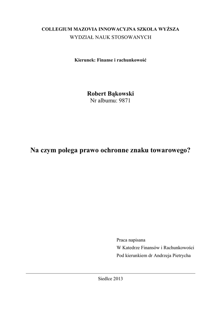 COLLEGIUM MAZOVIA INNOWACYJNA SZKOŁA WYŻSZA WYDZIAŁ NAUK STOSOWANYCH Kierunek: Finanse i rachunkowość Robert Bąkowski Nr albumu: 9871 Na czym polega prawo ochronne znaku towarowego? Praca napisana W Katedrze Finansów i Rachunkowości Pod kierunkiem dr Andrzeja Pietrycha Siedlce 2013 Znaki towarowe w równej mierze z nazwami własnymi lub produktami stały się wizytówkami przedsiębiorców. Wiele znaków towarowych rozpoznawalnych jest na całym świecie, natomiast prawidłowa, właściwa nazwa producenta jest nieznana. Można powiedzieć, że znaki towarowe stały się niezależnym produktem. Umieszczenie rozpoznawalnego znaku towarowego na produkcie gwarantuje potencjalnym nabywcom jakość, asortyment lub ilość produktów odpowiednią dla danego przedsiębiorcy. Niejednokrotnie znak towarowy stanowi najistotniejszą część majątku przedsiębiorstwa, czasami zaś jest jego wielopokoleniowym dziedzictwem, które nie ma swego realnego odzwierciedlenia w pieniądzu. W związku z tym prawna ochrona znaku towarowego staje się jednym z najistotniejszych elementów światowej gospodarki. Globalizacja, Internet oraz coraz szybsza wymiana informacji oraz ostrzeżeń ułatwiają, lecz jednocześnie utrudniają prawną ochronę znaku towarowego. Z jednej strony łatwiejsze jest przekazywanie wartości intelektualnych, jednoczesna praca ze sobą osób będących w różnych częściach świata, kontrolowanie jakości produktów i wprowadzanie nowych norm prawnych. Z drugiej strony nie stanowi problemu zdobycie, a później nieuprawnione użytkowanie, znaku towarowego jakiegokolwiek przedsiębiorstwa. Na całym świecie ochroną znaków towarowych zajmują się instytucje powołane, nadzorowane i podlegające administracji państwowej. W Polsce takim organem jest Urząd Patentowy Rzeczypospolitej Polskiej, który został utworzony 28 grudnia 1918 r.1. Prawo ochronne znaku towarowego unormowane jest przede wszystkim Ustawą Prawo własności przemysłowej2 oraz rozporządzeniem Prezesa Rady Ministrów w sprawie dokonywania i rozpatrywania zgłoszeń znaków towarowych3. Zgodnie art. 120 ww. Ustawy4 znakiem towarowym może być każde oznaczenie, które można przedstawić w sposób graficzny, jeżeli oznaczenie takie nadaje się do odróżnienia towarów jednego przedsiębiorstwa od towarów innego przedsiębiorstwa. Znakiem towarowym, może być wyraz, rysunek, ornament, kompozycja kolorystyczna, forma przestrzenna, w tym forma towaru lub opakowania, a także melodia lub inny sygnał dźwiękowy. Znak towarowy powinien być możliwy do odróżnienia i posiadać cechy indywidualne wyeksponowane w taki sposób, aby niemożliwa była pomyłka w identyfikacji znaku towarowego. Znak towarowy podobnie jak wynalazki, wzory użytkowe, wzory przemysłowe, oznaczenia geograficzne i topografie układów scalonych powinny zostać zgłoszone w Urzędzie Patentowym Rzeczypospolitej Polskiej, który jest organem odpowiedzialnym za realizację zadań związanych z ochroną własności przemysłowej. Ustawodawca zastrzega jednak, że pomimo rejestracji znaku towarowego ochrona prawna znaku towarowego nie będzie udzielana oznaczeniom, które nie mogą być znakiem towarowym lub nie mają wystarczających znamion odróżniających5. Ponadto prawa ochronne nie będą udzielane m.in. oznaczeniom6: - naruszającym m.in. prawa osobiste i majątkowe osób trzecich lub sprzecznych z porządkiem publicznym lub dobrymi obyczajami, oraz które ze swojej istoty mogą wprowadzić odbiorów w błąd; - zgłoszonym w złej wierze do Urzędu Patentowego celu uzyskania ochrony; - zawierającym nazwę lub skrót nazwy Rzeczypospolitej Polskiej bądź symboli narodowych Polski (godło, barwy lub hymn); 1 http://www.uprp.pl/o-urzedzie/Lead03,14,56,1,index,pl,text/ z dnia 30 czerwca 2000 r. (tekst jednolity ze zmianami Dz.U. 2013 poz. 1410) 3 z dnia 08 lipca 2002roku (Dz.U. z 2002 r. Nr 115, poz. 998 i z 2005roku Dz.U. Nr 109, poz. 911) 4 Ustawa „Prawo własności przemysłowej” opublikowana vide przypis 2 5 Tamże, art. 129 6 Tamże, art. 131 2 1 - zawierającym skróty nazw lub symbole (herby, flagi, godła) obcych państw lub organizacji międzynarodowych; - zawierają elementy będące symbolami, w szczególności o charakterze religijnym, patriotycznym lub kulturowym, a których używanie obrażałoby uczucia religijne, patriotyczne lub tradycję narodową. Również udzielenie prawa ochronnego na znak towarowy jest ograniczone dla towarów identycznych lub podobnych7. Po dokonaniu zgłoszenia znaku towarowego w Urzędzie Patentowym RP możliwe jest złożenie wniosku udzielenia prawa ochronnego. Warunkiem udzielenia prawa ochronnego oprócz złożenia stosownego wniosku jest uiszczenie stosownej opłaty za okres ochrony8. Oprócz graficznej prezentacji znaku towarowego należy również przedstawić listę towarów, na których umieszczany będzie znak towarowy, oraz usług jakie wykonywane będą w ramach prowadzonej działalności firmowanych znakiem towarowym. Prawo ochronne na znaki towarowe to prawo do wyłącznego używania znaku towarowego w sposób zarobkowy lub zawodowy na całym obszarze Rzeczypospolitej Polskiej przez okres 10 lat z możliwością przedłużenia ochrony na kolejne okresy dziesięcioletnie9. Ochrona obejmuje listę towarów i usług załączonych do wniosku o udzielenie prawa ochronnego. Za pośrednictwem Urzędu Patentowego RP można dokonać zgłoszenia i rejestracji znaku towarowego w krajach członkowskich Związku Madryckiego10. Zgłaszający, w wyniku jednej rejestracji, bądź jednego zgłoszenia znaku bazowego w kraju pochodzenia, uzyskuje możliwość uzyskania ochrony we wszystkich krajach członkowskich, przy czym ochrona ta jest taka sama, jak ta uzyskana bezpośrednio w poszczególnych państwach11. Informacje te zgromadzone są w systemie administrowanym przez Światową Organizację Własności Intelektualnej (WIPO=World Intellectual Property Organization) w Genewie. Na