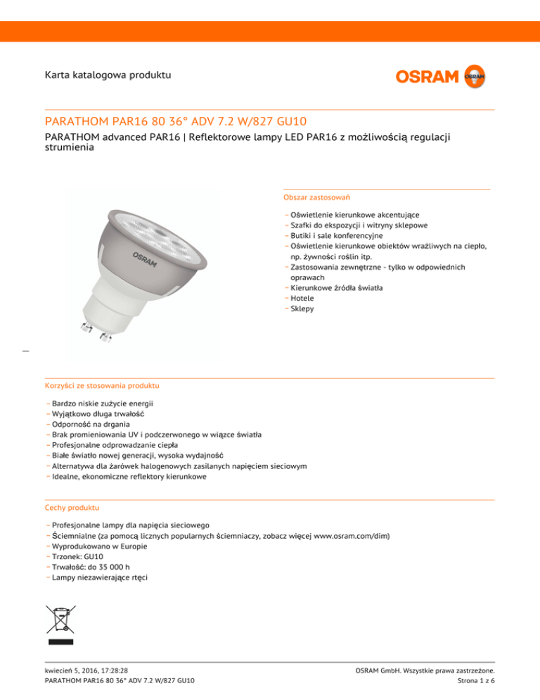 Karta katalogowa produktu PARATHOM PAR16 80 36° ADV 7.2 W/827 GU10 PARATHOM advanced PAR16 | Reflektorowe lampy LED PAR16 z możliwością regulacji strumienia Obszar zastosowań _ Oświetlenie kierunkowe akcentujące _ Szafki do ekspozycji i witryny sklepowe _ Butiki i sale konferencyjne _ Oświetlenie kierunkowe obiektów wrażliwych na ciepło, np. żywności roślin itp. _ Zastosowania zewnętrzne - tylko w odpowiednich oprawach _ Kierunkowe źródła światła _ Hotele _ Sklepy __ Korzyści ze stosowania produktu _ Bardzo niskie zużycie energii _ Wyjątkowo długa trwałość _ Odporność na drgania _ Brak promieniowania UV i podczerwonego w wiązce światła _ Profesjonalne odprowadzanie ciepła _ Białe światło nowej generacji, wysoka wydajność _ Alternatywa dla żarówek halogenowych zasilanych napięciem sieciowym _ Idealne, ekonomiczne reflektory kierunkowe Cechy produktu _ Profesjonalne lampy dla napięcia sieciowego _ Ściemnialne (za pomocą licznych popularnych ściemniaczy, zobacz więcej www.osram.com/dim) _ Wyprodukowano w Europie _ Trzonek: GU10 _ Trwałość: do 35 000 h _ Lampy niezawierające rtęci kwiecień 5, 2016, 17:28:28 PARATHOM PAR16 80 36° ADV 7.2 W/827 GU10 OSRAM GmbH. Wszystkie prawa zastrzeżone. Strona 1 z 6 Karta katalogowa produktu _ Wysoka stałość barw; SDCM: < 5 (PARATHOM PRO) __ kwiecień 5, 2016, 17:28:28 PARATHOM PAR16 80 36° ADV 7.2 W/827 GU10 OSRAM GmbH. Wszystkie prawa zastrzeżone. Strona 2 z 6 Karta katalogowa produktu Dane techniczne Dane elektryczne Moc znamionowa 7,20 W Moc znamionowy 7.20 W Napięcie znamionowy 220…240 V Ekwiwalentna moc żarówki 80 W Liczba cykli włączeniowych 100000 Częstotliwość pracy 50…60 Hz Współczynnik mocy λ 0,92 Dane fotometryczne __ Światłość 1439 cd Znamionowy strumień świetlny 575 lm Znamionowy strumień świetlny 575 lm Temperatura barwowa 2700 K Ogólny wskaźnik oddawania barw Ra 80 Barwa światła (oznaczenie) Warm White Standardowe odchylenie dopasowania barw ≤5 sdcm Nominalny użyteczny strumień świetln 90° 575 lm Znamionowy użyteczny strumień świetl 90° 575 lm Znamionowa maksymalna światłość 1439 cd Dane świetlne Kąt rozsyłu światła 36 ° Czas startu (60 %) 0,30 s Czas startu 0,1 s Nominalny kąt rozsyłu światła 36 ° Znamionowy kąt rozsyłu (kąt użyteczny) 36,00 ° kwiecień 5, 2016, 17:28:28 PARATHOM PAR16 80 36° ADV 7.2 W/827 GU10 OSRAM GmbH. Wszystkie prawa zastrzeżone. Strona 3 z 6 Karta katalogowa produktu Wymiary i waga Długość całkowita 58,0 mm Średnica 49,5 mm Bańka zewnętrzna PAR51 Długość 58,0 mm Maksymalna średnica 50,0 mm Trwałość __ Znamionowa trwałość 25000 h Trwałość 25000 h Wsp. zachowania str. świetlnego 0,70 Dodatkowe dane produktu Trzonek (standardowe rozwiązanie) GU10 Nominalna zawartość rtęci 0,0 mg Nie zawiera rtęci Tak Zgodnie z Dyrektywą WEEE Tak Uwaga dotycząca produktu Wszystkie parametry techniczne odnoszą się do kompletnej lampy/Ze względu na skomplikowany proces produkcji diod elektroluminescencyjnych (LED), typowe podawane wartości parametrów technicznych LED są czysto statystycznymi wartościami, które mogą się różnić od rzeczywistych parametrów technicznych poszczególnych produktów. Możliwości Ściemnianie Tak Certyfikaty i Normy Klasa efektywności energetycznej kwiecień 5, 2016, 17:28:28 PARATHOM PAR16 80 36° ADV 7.2 W/827 GU10 A+ OSRAM GmbH. Wszystkie prawa zastrzeżone. Strona 4 z 6 Karta katalogowa produktu Zużycie energii 8 kWh/1000h Kraj - specyficzna kategoryzacja Międzynarodowy system kodowania DRPAR-7,2/827-230-GU10-50/36 Oznaczenie produktu PPAR16D80367,2W Gwarancja Dane logistyczne Kod produktu Opis produktu Opakowanie (liczba produktów / opakowanie) Wymiary (długość x szerokość x wysokość) Objętość Waga brutto 4052899944015 PARATHOM PAR16 80 36° ADV 7.2 W/827 GU10 Karton wysylkowy 10 267 mm x 111 mm x 77 mm 2.28 dm³ 898.00 g __ Wymieniony kod produktu oznacza najmniejszą ilość produktu, jaka może być zamówiona. Jednostka transportowa może zawierać jedną sztukę lub więcej. Składając zamówienie prosimy o zamawianie ilości odpowiadających jednej lub wielokrotności jednostki transportowej. Odnośniki/łącza Kompatybilność funkcji ściemniania, patrz www.osram.com/DIM Więcej produktów i aktualne informacje na temat lamp LED na stronie www.osram.pl/ledlamps Gwarancja, patrz www.osram.pl/gwarancja Oświadczenie kwiecień 5, 2016, 17:28:28 PARATHOM PAR16 80 36° ADV 7.2 W/827 GU10 OSRAM GmbH. Wszystkie prawa zastrzeżone. Strona 5 z 6 Karta katalogowa produktu Zastrzega się możliwość zmian bez uprzedzenia. Błędy i ominięcia są możliwe. Należy zawsze upewnić się czy korzystasz z najnowszej wersji katalogu. __ kwiecień 5, 2016, 17:28:28 PARATHOM PAR16 80 36° ADV 7.2 W/827 GU10 OSRAM GmbH. Wszystkie prawa zastrzeżone. Strona 6 z 6