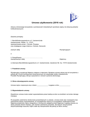 Umowa użytkowania (2016 rok) dotyczy okresowego korzystania z pomieszczeń mieszkalnych (poniższe zapisy nie dotyczą pobytów krótkookresowych) Zawarta pomiędzy 1. Berufsförderungszentrum e.V. Ueckermünde Ueckermünde, Feldstr. 7c, 17373 reprezentowane przez I. Schultz, Prezesa oraz działającej w jego imieniu p. Schultz, Kierownik zwanym dalej - Wynajmującym- a 2. Panią/Panem………………………………….., zwaną/zwanym dalej - Najemcą - w internacie Berufsförderungszentrum e.V. Ueckermünde, Usedomer Str. 5a, 17373 Ueckermünde 1. Przedmiot umowy Wynajmujący wynajmuje Najemcy miejsce w internacie. Niniejsza umowa odnosi się do korzystania z pokoju jak i innych pomieszczeń przeznaczonych do wspólnego użytku mieszkańców. Ponadto Wynajmujący oferuje wyżywienie w ramach żywienia zbiorowego. 2. Okres obowiązywania umowy Umowa najmu rozpoczyna się z dniem _____________ i wygasa w dniu _____________ 3. Wypowiedzenie umowy Zasadniczo umowa może zostać wypowiedziana przez każdą ze stron ze skutkiem na koniec danego miesiąca. W przypadku zaistnienia okoliczności przewidzianych w ustawie, umowa może ulec rozwiązaniu bez zachowania okresu wypowiedzenia. W szczególności dotyczy to przypadków użytkowania przez Najemcę przedmiotu najmu niezgodnie z Umową lub zalegania przez Najemcę z zapłatą czynszu za okres powyżej dwóch miesięcy, jak również zaistnienia powodów, dla których utrzymywanie dotychczasowego stosunku najmu stało się niewykonalne dla jednej ze Stron umowy. Po zakończeniu stosunku najmu, Najemca przed przekazaniem pokoju zobowiązany jest do opróżnienia pokoju oraz do wydania go Wynajmującemu w należytym stanie i porządku. Obowiązek zapłaty czynszu ustaje z chwilą pisemnego potwierdzenia odbioru pokoju przez Wynajmującego. 4. Opłata za korzystanie z bursy i koszty wyżywienia Czynsz (opłata za pobyt łącznie z kosztami dodatkowymi) wynosi od osoby 13,20 € za dobę. Obowiązkiem zapłaty czynszu objęty jest okres od poniedziałku do piątku. Oprócz czynszu należy wnieść opłatę za wyżywienie w wysokości 9,50 € za dobę. Łącznie należy zapłacić za każdy dzień rozliczeniowy opłatę w wysokości 22,70 €. Opłata za korzystanie z lokalu obejmuje również wyposażenie pokoju, meble, opłaty za wodę, ogrzewanie i elektryczność, jak również koszty związane z zagospodarowaniem działki. Wynajmujący zobowiązuje się wykonywać na własny koszt prace porządkowe wewnątrz i na zewnątrz budynku oraz na terenie działki. 5. Sposób płatności Czynsz oraz opłaty za wyżywienie są płatne miesięcznie, nie później niż w terminie 14 dni roboczych od daty wystawienia rachunku, na konto w Sparkasse Uecker-Randow: 321 0000 629, BLZ (kod bankowy): 15050400 (SEPA DE 34 150504003210000629, BIC- NOLADE 21PSW). Wpłaty można dokonać w banku bez ponoszenia dodatkowych kosztów lub przelewem za pośrednictwem Urzędu Pracy (Arbeitsagentur). W razie opóźnienia w zapłacie czynszu, Wynajmujący może żądać zwrotu kosztów poniesionych w związku z wystosowaniem upomnienia dla Najemcy w wysokości 2,50 € za każde upomnienie. Ponadto Wynajmujący zastrzega sobie prawo dochodzenia dalszych roszczeń o odszkodowanie. 6. Zasady korzystania z pokoju Stan pokoju został opisany w protokole zdawczo-odbiorczym, który dołączono do niniejszej umowy w postaci załącznika. Protokół ten jest bezpośrednią częścią umowy. Najemcy nie wolno: - trzymać zwierząt domowych w pokoju; - przygotowywać posiłków w pokoju; - oddawać lokalu osobom trzecim w podnajem lub do korzystania (także tymczasowego); - usuwać lub w jakikolwiek sposób zmieniać umeblowania oraz wyposażenia lokalu; - wstawiać do pokoju własnych mebli oraz przedmiotów wyposażenia lokalu (jedynie po uprzednim zapytaniu); - używać w pokoju urządzeń elektrycznych, w szczególności: grzejników, urządzeń do grillowania, płyt elektrycznych, ekspresów do kawy i herbaty, zamrażarek i szaf chłodniczych; - wyrabiać dodatkowych kluczy lub/oraz przekazywać kluczy osobom trzecim. Najemca zobowiązuje się do przestrzegania regulaminu budynku oraz regulaminu ochrony przeciwpożarowej zgodnie z załącznikiem nr 2 niniejszej umowy. Powyższe regulaminy są częścią niniejszej umowy najmu. 7. Odpowiedzialność Najemcy Najemca zobowiązany jest niezwłocznie powiadomić administrację domu lub zarząd BFZ Ueckermünde e.V o zaistniałych szkodach lub usterkach. Najemca ponosi odpowiedzialność za straty i szkody powstałe w pokoju, w przedmiotach wyposażenia lokalu oraz w częściach nieruchomości wspólnej, jak również za szkody poczynione przez osoby go odwiedzające. W przypadku zagubienia kluczy, Najemca ponosi koszty dorobienia kluczy zapasowych. O fakcie zagubienia kluczy należy niezwłocznie poinformować właściwe osoby. Najemca zobowiązany jest do utrzymania swojego pokoju, przedmiotów wyposażenia lokalu i części nieruchomości wspólnej w należytej czystości i porządku. W przypadku wystąpienia zabrudzeń i zanieczyszczeń, bądź w przypadku niewłaściwego używania przedmiotu najmu, Wynajmujący może żądać przywrócenia stanu pierwotnego, określonego w umowie. Jeśli Najemca nie wypełni tego obowiązku w ciągu 24 godzin od wezwania, Wynajmujący ma prawo wykonać niezbędne prace samodzielnie bądź zlecić ich wykonanie osobom trzecim na koszt Najemcy. 8. Obowiązek meldunkowy Odwiedzający goście zobowiązani są do wypełnienia formularza potwierdzającego zameldowanie się i wymeldowanie. 9. Prawo Wynajmującego do wejścia na teren wynajmowanych pomieszczeń Kierownik lub upoważniona przez niego osoba może wejść do pomieszczeń bursy w zwykłych godzinach pracy, po uprzednim zgłoszeniu tego zamiaru (w nagłych przypadkach także bez wcześniejszego zgłoszenia). Jeżeli wystąpi taka konieczność, Wynajmujący ma prawo wejść do pokoju Najemcy bez wcześniejszego zgłoszenia w celu pr
