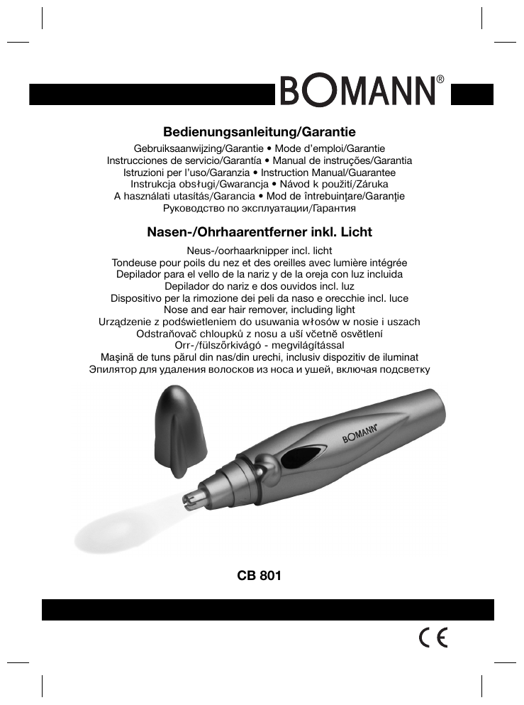 ® Bedienungsanleitung/Garantie Gebruiksaanwijzing/Garantie • Mode d’emploi/Garantie Instrucciones de servicio/Garantía • Manual de instruções/Garantia Istruzioni per l’uso/Garanzia • Instruction Manual/Guarantee Instrukcja obsługi/Gwarancja • Návod k použití/Záruka A használati utasítás/Garancia • Mod de întrebuinflare/Garanflie Руководство по эксплуатации/Гарантия Nasen-/Ohrhaarentferner inkl. Licht Neus-/oorhaarknipper incl. licht Tondeuse pour poils du nez et des oreilles avec lumière intégrée Depilador para el vello de la nariz y de la oreja con luz incluida Depilador do nariz e dos ouvidos incl. luz Dispositivo per la rimozione dei peli da naso e orecchie incl. luce Nose and ear hair remover, including light Urządzenie z podświetleniem do usuwania włosów w nosie i uszach Odstraňovač chloupků z nosu a uší včetně osvětlení Orr-/fülszőrkivágó - megvilágítással Maøinæ de tuns pærul din nas/din urechi, inclusiv dispozitiv de iluminat Эпилятор для удаления волосков из носа и ушей, включая подсветку CB 801 Allgemeine Sicherheitshinweise D • • • • • • • • Lesen Sie vor Inbetriebnahme dieses Gerätes die Bedienungsanleitung sehr sorgfältig durch und bewahren Sie diese inkl. Garantieschein, Kassenbon und nach Möglichkeit den Karton mit Innenverpackung gut auf. Benutzen Sie das Gerät ausschließlich für den privaten und den dafür vorgesehenen Zweck. Dieses Gerät ist nicht für den gewerblichen Gebrauch bestimmt. Benutzen Sie es nicht im Freien (außer es ist für den bedingten Einsatz im Freien vorgesehen). Halten Sie es vor Hitze, direkter Sonneneinstrahlung, Feuchtigkeit (auf keinen Fall in Flüssigkeiten tauchen) und scharfen Kanten fern. Benutzen Sie das Gerät nicht mit feuchten Händen. Bei feucht oder nass gewordenem Gerät sofort den Netzstecker ziehen. Nicht ins Wasser greifen. Schalten Sie das Gerät aus und ziehen Sie immer den Stecker aus der Steckdose (ziehen Sie am Stecker, nicht am Kabel) wenn Sie das Gerät nicht benutzen, Zubehörteile anbringen, zur Reinigung oder bei Störung. Betreiben Sie das Gerät nicht unbeaufsichtigt. Sollten Sie den Arbeitsplatz verlassen, schalten Sie das Gerät bitte immer aus, bzw. ziehen Sie den Stecker aus der Steckdose (ziehen Sie am Stecker, nicht am Kabel). Um Kinder vor Gefahren elektrischer Geräte zu schützen, sorgen Sie bitte dafür, dass das Kabel nicht herunter hängt und Kinder keinen Zugriff auf das Gerät haben. Prüfen Sie Gerät und Kabel regelmäßig auf Schäden. Ein beschädigtes Gerät bitte nicht in Betrieb nehmen. Reparieren Sie das Gerät nicht selbst, sondern suchen Sie bitte einen autorisierten Fachmann auf. Um Gefährdungen zu vermeiden, ein defektes Netzkabel bitte nur vom Hersteller, unserem Kundendienst oder einer ähnlich qualifizierten Person durch ein gleichwertiges Kabel ersetzen lassen. Verwenden Sie nur Original-Zubehör. Benutzung des Gerätes • • • • • • • Legen Sie eine 1,5 V Batterie in das Batteriefach. Entfernen Sie die Schutzkappe. Schalten Sie das Gerät ein. Die Lampe leuchtet. Halten Sie die Spitze des Scherkopfes an das Nasenloch bzw. Ohrmuschel. Entfernen Sie bitte nur Haare die über das Nasenloch bzw. Ohrmuschel herausragen. Schalten Sie das Gerät aus und nehmen Sie den Reinigungspinsel zu Hilfe. Zur gründlichen Reinigung, entnehmen Sie bitte die Batterie und lösen Sie den Scherkopf, indem Sie diesen gegen den Uhrzeigersinn drehen. Entnehmen Sie das Scherblatt (Vorsicht scharf). Streichen Sie mit dem Reinigungspinsel sternförmig über Scherkopf und Halterung. Setzen Sie das Gerät in umgekehrter Reihenfolge wieder zusammen. Achtung: Batterien gehören nicht in den Hausmüll. Bitte geben Sie verbrauchte Batterien bei zuständigen Sammelstellen oder beim Händler ab. 2 Werfen Sie Batterien niemals ins Feuer. D Garantie Wir übernehmen für das von uns vertriebene Gerät eine Garantie von 24 Monaten ab Kaufdatum (Kassenbon). Innerhalb der Garantiezeit beseitigen wir unentgeltlich die Mängel des Gerätes oder des Zubehörs*), die auf Material- oder Herstellungsfehler beruhen, durch Reparatur oder, nach unserem Ermessen, durch Umtausch. Garantieleistungen bewirken weder eine Verlängerung der Garantiefrist, noch beginnt dadurch ein Anspruch auf eine neue Garantie! Als Garantienachweis gilt der Kaufbeleg. Ohne diesen Nachweis kann ein kostenloser Austausch oder eine kostenlose Reparatur nicht erfolgen. Im Garantiefall geben Sie bitte das komplette Gerät in der Originalverpackung zusammen mit dem Kassenbon an Ihren Händler. *) Schäden an Zubehörteilen führen nicht automatisch zum kostenlosen Umtausch des kompletten Gerätes. Wenden Sie sich in diesem Fall bitte an unsere Hotline! Glasbruchschäden bzw. Brüche von Kunststoffteilen sind grundsätzlich kostenpflichtig! Sowohl Defekte an Verbrauchszubehör bzw. Verschleißteilen (z.B. Motorkohlen, Knethaken, Antriebsriemen, Ersatzfernbedienung, Ersatzzahnbürsten, Sägeblättern usw.), als auch Reinigung, Wartung oder der Austausch von Verschleißteilen, fallen nicht unter die Garantie und sind deshalb kostenpflichtig! Die Garantie erlischt bei Fremdeingriff. Nach der Garantie Nach Ablauf der Garantiezeit können Reparaturen kostenpflichtig vom entsprechenden Fachhandel oder Reparaturservice ausgeführt werden. Service für unsere Haushaltsartikel und Unterhaltungselektronik Zu technischen Fragen oder zur Bestellung von Verschleißteilen (soweit diese nicht vom Fachmann ausgewechselt werden müssen), wie z.B. Ersatzkannen, Staubsaugerfilterbeutel, Fernbedienung usw. können Sie sich, mit Angabe des Gerätetyps, an unsere Hotline-Adresse wenden: [email protected] Interessieren Sie sich für weitere Bomann-Produkte? Besuchen Sie doch einmal unsere Homepage unter www.bomann.de oder www.bomann.com 3 Algemene veiligheidsinstructies NL • • • • • • • • Lees vóór de 