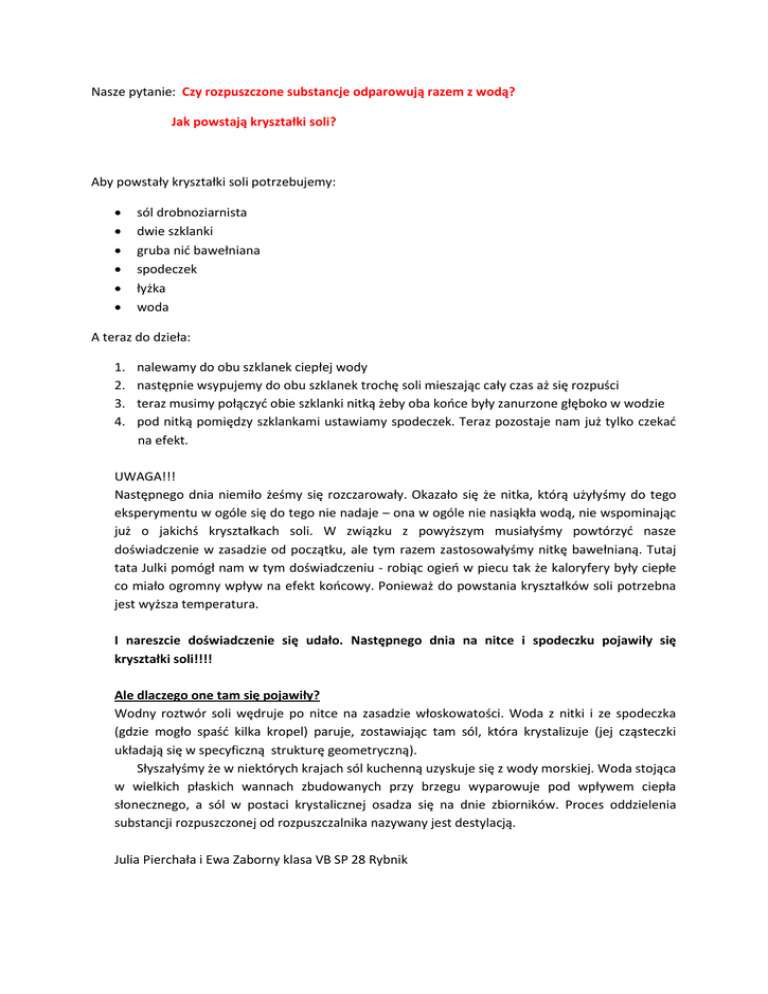 Nasze pytanie: Czy rozpuszczone substancje odparowują razem z wodą? Jak powstają kryształki soli? Aby powstały kryształki soli potrzebujemy: sól drobnoziarnista dwie szklanki gruba nić bawełniana spodeczek łyżka woda A teraz do dzieła: 1. 2. 3. 4. nalewamy do obu szklanek ciepłej wody następnie wsypujemy do obu szklanek trochę soli mieszając cały czas aż się rozpuści teraz musimy połączyć obie szklanki nitką żeby oba końce były zanurzone głęboko w wodzie pod nitką pomiędzy szklankami ustawiamy spodeczek. Teraz pozostaje nam już tylko czekać na efekt. UWAGA!!! Następnego dnia niemiło żeśmy się rozczarowały. Okazało się że nitka, którą użyłyśmy do tego eksperymentu w ogóle się do tego nie nadaje – ona w ogóle nie nasiąkła wodą, nie wspominając już o jakichś kryształkach soli. W związku z powyższym musiałyśmy powtórzyć nasze doświadczenie w zasadzie od początku, ale tym razem zastosowałyśmy nitkę bawełnianą. Tutaj tata Julki pomógł nam w tym doświadczeniu - robiąc ogień w piecu tak że kaloryfery były ciepłe co miało ogromny wpływ na efekt końcowy. Ponieważ do powstania kryształków soli potrzebna jest wyższa temperatura. I nareszcie doświadczenie się udało. Następnego dnia na nitce i spodeczku pojawiły się kryształki soli!!!! Ale dlaczego one tam się pojawiły? Wodny roztwór soli wędruje po nitce na zasadzie włoskowatości. Woda z nitki i ze spodeczka (gdzie mogło spaść kilka kropel) paruje, zostawiając tam sól, która krystalizuje (jej cząsteczki układają się w specyficzną strukturę geometryczną). Słyszałyśmy że w niektórych krajach sól kuchenną uzyskuje się z wody morskiej. Woda stojąca w wielkich płaskich wannach zbudowanych przy brzegu wyparowuje pod wpływem ciepła słonecznego, a sól w postaci krystalicznej osadza się na dnie zbiorników. Proces oddzielenia substancji rozpuszczonej od rozpuszczalnika nazywany jest destylacją. Julia Pierchała i Ewa Zaborny klasa VB SP 28 Rybnik