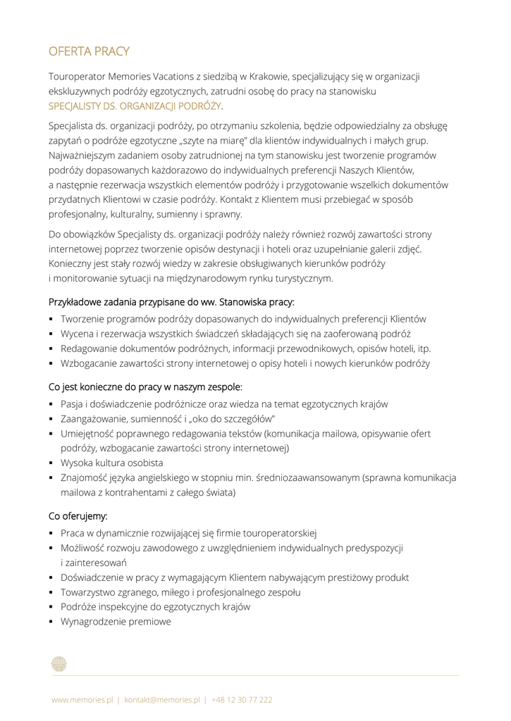 OFERTA PRACY Touroperator Memories Vacations z siedzibą w Krakowie, specjalizujący się w organizacji ekskluzywnych podróży egzotycznych, zatrudni osobę do pracy na stanowisku SPECJALISTY DS. ORGANIZACJI PODRÓŻY. Specjalista ds. organizacji podróży, po otrzymaniu szkolenia, będzie odpowiedzialny za obsługę zapytań o podróże egzotyczne „szyte na miarę” dla klientów indywidualnych i małych grup. Najważniejszym zadaniem osoby zatrudnionej na tym stanowisku jest tworzenie programów podróży dopasowanych każdorazowo do indywidualnych preferencji Naszych Klientów, a następnie rezerwacja wszystkich elementów podróży i przygotowanie wszelkich dokumentów przydatnych Klientowi w czasie podróży. Kontakt z Klientem musi przebiegać w sposób profesjonalny, kulturalny, sumienny i sprawny. Do obowiązków Specjalisty ds. organizacji podróży należy również rozwój zawartości strony internetowej poprzez tworzenie opisów destynacji i hoteli oraz uzupełnianie galerii zdjęć. Konieczny jest stały rozwój wiedzy w zakresie obsługiwanych kierunków podróży i monitorowanie sytuacji na międzynarodowym rynku turystycznym. Przykładowe zadania przypisane do ww. Stanowiska pracy: Tworzenie programów podróży dopasowanych do indywidualnych preferencji Klientów Wycena i rezerwacja wszystkich świadczeń składających się na zaoferowaną podróż Redagowanie dokumentów podróżnych, informacji przewodnikowych, opisów hoteli, itp. Wzbogacanie zawartości strony internetowej o opisy hoteli i nowych kierunków podróży Co jest konieczne do pracy w naszym zespole: Pasja i doświadczenie podróżnicze oraz wiedza na temat egzotycznych krajów Zaangażowanie, sumienność i „oko do szczegółów” Umiejętność poprawnego redagowania tekstów (komunikacja mailowa, opisywanie ofert podróży, wzbogacanie zawartości strony internetowej) Wysoka kultura osobista Znajomość języka angielskiego w stopniu min. średniozaawansowanym (sprawna komunikacja mailowa z kontrahentami z całego świata) Co oferujemy: Praca w dynamicznie rozwijającej się firmie touroperatorskiej Możliwość rozwoju zawodowego z uwzględnieniem indywidualnych predyspozycji i zainteresowań Doświadczenie w pracy z wymagającym Klientem nabywającym prestiżowy produkt Towarzystwo zgranego, miłego i profesjonalnego zespołu Podróże inspekcyjne do egzotycznych krajów Wynagrodzenie premiowe www.memories.pl | [email protected] | +48 12 30 77 222 Poszukujemy osób chętnych do pracy pn-pt w godzinach 9-17 w biurze w centrum Krakowa. Jesteśmy gotowi rozważyć zatrudnienie kandydatów poszukujących pracy na część etatu oraz kandydatów poszukujących elastycznych godzin pracy. Chętnych uprzejmie prosimy o przesłanie CV wraz z listem motywacyjnym uwzględniającym informacje na temat odwiedzonych dotychczas krajów na adres [email protected]. Uprzedzamy, że skontaktujemy się wyłącznie z wybranymi kandydatami. www.memories.pl | [email protected] | +48 12 30 77 222