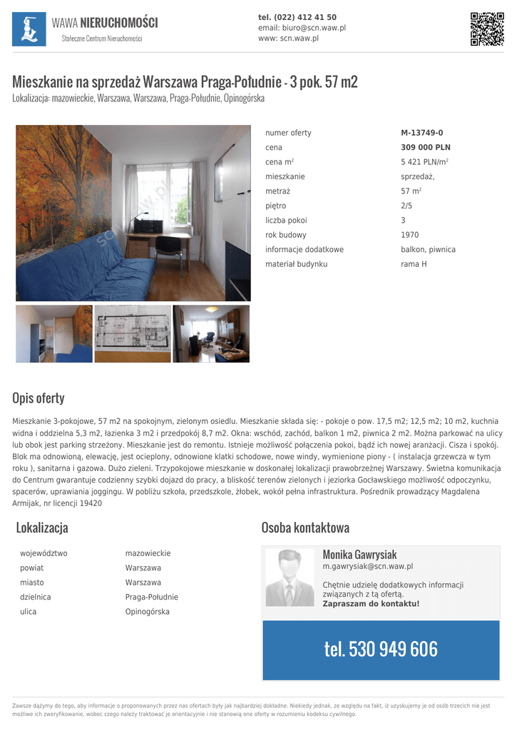 tel. (022) 412 41 50 email: [email protected] www: scn.waw.pl Mieszkanie na sprzedaż Warszawa Praga-Południe - 3 pok. 57 m2 Lokalizacja: mazowieckie, Warszawa, Warszawa, Praga-Południe, Opinogórska numer oferty M-13749-0 cena 309 000 PLN cena m 5 421 PLN/m2 mieszkanie sprzedaż, metraż 57 m2 piętro 2/5 liczba pokoi 3 rok budowy 1970 informacje dodatkowe balkon, piwnica materiał budynku rama H 2 Opis oferty Mieszkanie 3-pokojowe, 57 m2 na spokojnym, zielonym osiedlu. Mieszkanie składa się: - pokoje o pow. 17,5 m2; 12,5 m2; 10 m2, kuchnia widna i oddzielna 5,3 m2, łazienka 3 m2 i przedpokój 8,7 m2. Okna: wschód, zachód, balkon 1 m2, piwnica 2 m2. Można parkować na ulicy lub obok jest parking strzeżony. Mieszkanie jest do remontu. Istnieje możliwość połączenia pokoi, bądź ich nowej aranżacji. Cisza i spokój. Blok ma odnowioną, elewację, jest ocieplony, odnowione klatki schodowe, nowe windy, wymienione piony - ( instalacja grzewcza w tym roku ), sanitarna i gazowa. Dużo zieleni. Trzypokojowe mieszkanie w doskonałej lokalizacji prawobrzeżnej Warszawy. Świetna komunikacja do Centrum gwarantuje codzienny szybki dojazd do pracy, a bliskość terenów zielonych i jeziorka Gocławskiego możliwość odpoczynku, spacerów, uprawiania joggingu. W pobliżu szkoła, przedszkole, żłobek, wokół pełna infrastruktura. Pośrednik prowadzący Magdalena Armijak, nr licencji 19420 Lokalizacja Osoba kontaktowa Monika Gawrysiak województwo mazowieckie powiat Warszawa [email protected] miasto Warszawa dzielnica Praga-Południe ulica Opinogórska Chętnie udzielę dodatkowych informacji związanych z tą ofertą. Zapraszam do kontaktu! tel. 530 949 606 Zawsze dążymy do tego, aby informacje o proponowanych przez nas ofertach były jak najbardziej dokładne. Niekiedy jednak, ze względu na fakt, iż uzyskujemy je od osób trzecich nie jest możliwe ich zweryfikowanie, wobec czego należy traktować je orientacyjnie i nie stanowią one oferty w rozumieniu kodeksu cywilnego.
