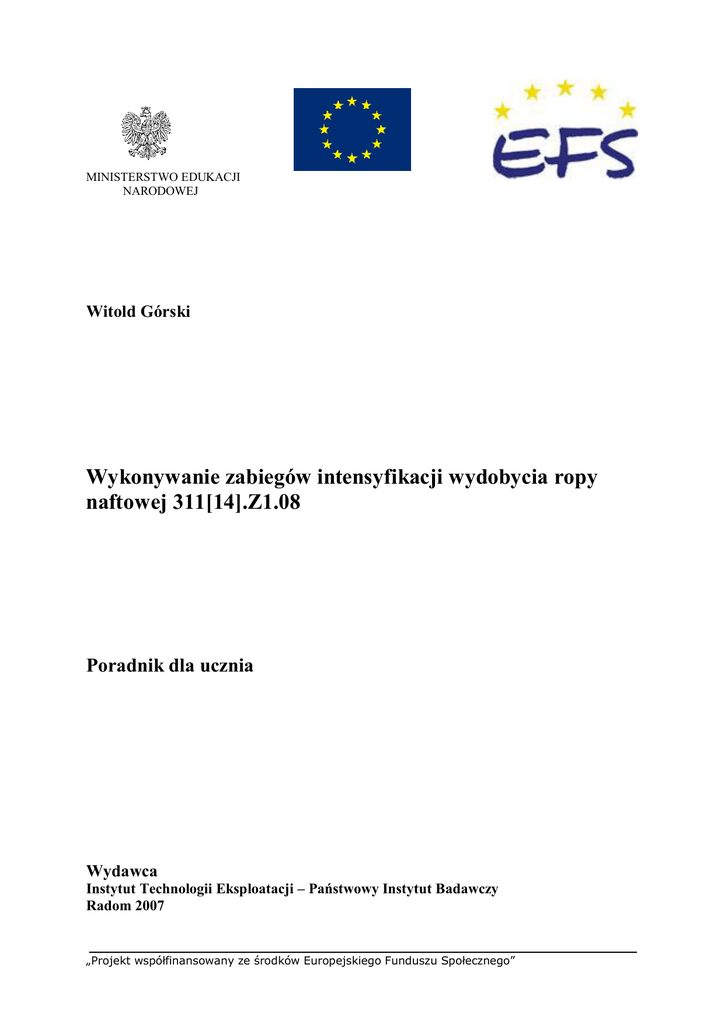 MINISTERSTWO EDUKACJI NARODOWEJ Witold Górski Wykonywanie zabiegów intensyfikacji wydobycia ropy naftowej 311[14].Z1.08 Poradnik dla ucznia Wydawca Instytut Technologii Eksploatacji – Państwowy Instytut Badawczy Radom 2007 „Projekt współfinansowany ze środków Europejskiego Funduszu Społecznego” Recenzenci: dr inż. Czesław Rybicki mgr inż. Henryk Rospond Opracowanie redakcyjne: mgr inż. Witold Górski Konsultacja: mgr inż. Teresa Sagan Poradnik stanowi obudowę dydaktyczną programu jednostki modułowej 311[14].Z1.08 „Wykonywanie zabiegów intensyfikacji wydobycia ropy naftowej”, zawartego w modułowym programie nauczania dla zawodu technik górnictwa otworowego. Wydawca Instytut Technologii Eksploatacji – Państwowy Instytut Badawczy Radom 2007 „Projekt współfinansowany ze środków Europejskiego Funduszu Społecznego” 1 SPIS TREŚCI 1. 2. 3. 4. 5. 6. Wprowadzenie Wymagania wstępne Cele kształcenia Materiał nauczania 4.1. Cel stosowania i rodzaje metod intensyfikacji wydobycia ropy naftowej 4.1.1. Materiał nauczania 4.1.2. Pytania sprawdzające 4.1.3. Ćwiczenia 4.1.4. Sprawdzian postępów 4.2. Szczelinowanie hydrauliczne odwiertów i jego odmiany 4.2.1. Materiał nauczania 4.2.2. Pytania sprawdzające 4.2.3. Ćwiczenia 4.2.4. Sprawdzian postępów 4.3. Kwasowanie odwiertów eksploatacyjnych 4.3.1. Materiał nauczania 4.3.2. Pytania sprawdzające 4.3.3. Ćwiczenia 4.3.4. Sprawdzian postępów 4.4. Intensyfikacja wydobycia przy pomocy materiałów wybuchowych 4.4.1. Materiał nauczania 4.4.2. Pytania sprawdzające 4.4.3. Ćwiczenia 4.4.4. Sprawdzian postępów 4.5. Metody termiczne intensyfikacji wydobycia ropy naftowej 4.5.1. Materiał nauczania 4.5.2. Pytania sprawdzające 4.5.3. Ćwiczenia 4.5.4. Sprawdzian postępów Sprawdzian osiągnięć Literatura „Projekt współfinansowany ze środków Europejskiego Funduszu Społecznego” 2 3 5 6 7 7 7 9 9 10 11 11 19 19 23 24 24 29 30 31 32 32 35 36 37 39 39 41 41 42 43 49 1. WPROWADZENIE Poradnik ten pomoże Ci w przyswajaniu wiedzy i kształtowaniu umiejętności z zakresu intensyfikacji wydobycia kopalin eksploatowanych za pomocą otworów wiertniczych, ujętych w modułowym programie nauczania dla zawodu technik górnictwa otworowego. W poradniku zamieszczono: – wymagania wstępne – wykaz umiejętności, jakie powinieneś posiadać przed przystąpieniem do nauki w tej jednostce modułowej, – cele kształcenia – wykaz umiejętności jakie ukształtujesz podczas pracy z tym poradnikiem, – materiał nauczania – czyli zestaw wiadomości, które powinieneś posiadać, aby samodzielnie wykonać ćwiczenia, – pytania sprawdzające – zestawy pytań, które pomogą Ci sprawdzić, czy opanowałeś podane treści i możesz już rozpocząć realizację ćwiczeń, – ćwiczenia – mają one na celu ukształtowanie Twoich umiejętności praktycznych, – sprawdzian postępów – zestaw pytań, na podstawie których sam możesz sprawdzić, czy potrafisz samodzielnie poradzić sobie z zadaniami, które wykonywałeś wcześniej, – sprawdzian osiągnięć – zawiera zestaw zadań testowych (test wielokrotnego wyboru), – literaturę – wykaz pozycji, z jakich możesz korzystać podczas nauki. W materiale nauczania zostały przedstawione zagadnienia dotyczące zastosowania różnych metod intensyfikacji czyli zwiększenia wydobycia ropy naftowej. Przy wykonywaniu ćwiczeń powinieneś korzystać z instrukcji stanowiskowych, wskazówek i poleceń nauczyciela, zwracając szczególną uwagę na przestrzeganie warunków bezpieczeństwa i przepisów przeciwpożarowych. Po wykonaniu ćwiczeń sprawdź poziom swoich postępów rozwiązując test „Sprawdzian postępów” zamieszczony po ćwiczeniach, zaznaczając w odpowiednim miejscu, jako właściwą Twoim zdaniem, odpowiedź TAK albo NIE. Odpowiedzi TAK wskazują Twoje mocne strony, natomiast odpowiedzi NIE wskazują na luki w Twojej wiedzy i nie w pełni opanowane umiejętności, które musisz nadrobić. Po zrealizowaniu programu jednostki modułowej nauczyciel sprawdzi poziom Twoich umiejętności i wiadomości. Otrzymasz do samodzielnego rozwiązania test pisemny. Nauczyciel oceni sprawdzian i na podstawie określonych kryteriów podejmie decyzję o tym, czy zaliczyłeś program jednostki modułowej. „Projekt współfinansowany ze środków Europejskiego Funduszu Społecznego” 3 311[14].Z1 Eksploatacja kopalin otworami wiertniczymi 311[14].Z1.01 Rozpoznawanie złóż ropy naftowej i gazu ziemnego 311[14].Z1.02 Wykonywanie pomiarów wgłębnych i pomiarów wydobycia kopalin 311[14].Z1.04 Eksploatowanie samoczynne i gazodźwigiem ropy naftowej 311[14].Z1.03 Badanie właściwości kopalin płynnych 311[14].Z1.05 Eksploatowanie złóż gazu ziemnego 311[14].Z1.07 Wydobywanie soli kamiennej i siarki otworami wiertniczymi 311[14].Z1.06 Wydobywanie ropy naftowej przy użyciu pomp wgłębnych 311[14].Z1.08 Wykonywanie zabiegów intensyfikacji wydobycia ropy naftowej 311[14].Z1.09 Prowadzenie wtórnych metod eksploatacji złóż ropy naftowej 311[14].Z1.10 Stosowanie przepisów prawa geologicznego i górniczego 311[14].Z1.11 Prowadzenie dokumentacji ruchu zakładu górnictwa otworowego Schemat układu jednostek modułowych „Projekt współfinansowany ze środków Europejskiego Funduszu Społecznego” 4 2. WYMAGANIA WSTĘPNE – – – – – – – – – – – – – – – – Przystępując do realizacji programu jednostki modułowej powinieneś umieć: definiować i omawiać własności złożowe skał zbiornikowych ropy naftowej takie jak: porowatość, szczelinowatość, przepuszczalność, wytrzymałość skał, rozpoznawać rodzaje skał zbiornikowych, definiować i charakteryzować ciśnienia występujące w złożu i w odwiercie eksploatacyjnym takie jak: ciśnienie złożowe, ciśnienie denne statyczne, ciśnienie denne dynamiczne, ciśnienie głowicowe, wyznaczać ciśnienia występujące w złożu i odwiercie eksploatacyjnym, 