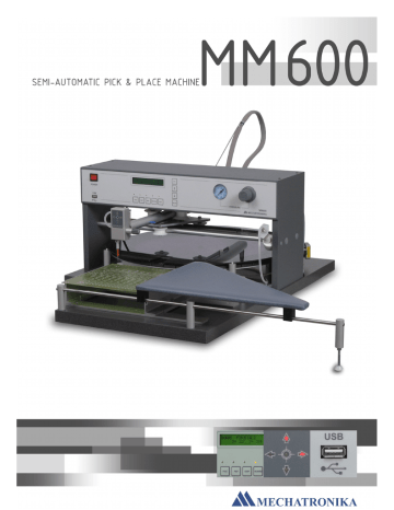 MM600 Opis Manipulator montaŜowy MM600 jest uniwersalnym urządzeniem do nakładania kleju, pasty lutowniczej i elementów SMD na płytki obwodów drukowanych i podłoŜa ceramiczne układów hybrydowych.Urządzenie zapewnia duŜą wydajność i niezawodność procesu układania dzięki wbudowanemu systemowi kontroli poprawności układania elementów (eliminuje błędne ułoŜenie elementu lub jego pominięcie). Wbudowany system sterowania umoŜliwia opanowanie programowania i obsługi urządzenia w ciągu kilku godzin. Manipulator montaŜowy MM600 dedykowany jest do działów badawczo-rozwojowych i do produkcji małoseryjnej. Cechy charakterystyczne Praca w cyklu półautomatycznym System ACCUPLACE eliminujący błędy układania elementów 45- pozycyjny podajnik karuzelowy Wbudowany dozownik ciśnieniowy pasty lub kleju Wbudowany system sterujący z portem USB do przyłączenia przenośnych urządzeń pamięci masowej Uczenie metodą TEACH–IN lub transfer danych z CAD MoŜliwość pracy z automatycznym podajnikiem elementów w taśmach 8, 12, 16, 24 mm Korzystny stosunek ceny do jakości i wydajności Dane techniczne PCB Pole układania: max 240 x 280 mm Magazyny elementów Elementy luzem: automatycznie sterowany podajnik karuzelowy (45 – 90 róŜnych elementów) ręcznie indeksowany podajnik taśmowy 8, 12, 16, 24 mm (max. 10 taśm) (opcja) automatyczny podajnik taśmowy(max 16 taśm 8mm) (opcja) Układanie elementów Wskazywanie punktów pobierania I układania elementów przez system ACCUPLACE WyposaŜenie dodatkowe Automatyczne podajniki taśmowe Ręcznie indeksowane podajniki taśmowe Import danych z CAD Wymiary i waga 590 x 750 x 350 mm, 20 kg Zasilanie 230V, 50Hz, 25W Zasilanie spręŜonym powietrzem 0.6Mpa, 20l/min _____________________________________________________________________________ MECHATRONIKA Borsucza 9, 02-213 Warszawa, Polska http://www.mechatronika.com.pl e-mail: [email protected]