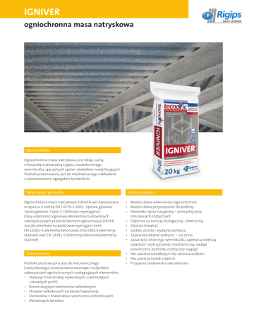 IGNIVER ogniochronna masa natryskowa Opis produktu Ogniochronna masa natryskowa jest lekką, suchą mieszanką wytwarzaną z gipsu, rozdrobnionego wermikulitu, specjalnych spoiw i dodatków modyfikujących. Produkt przeznaczony jest do mechanicznego nakładania z zastosowaniem agregatów tynkarskich. Właściwości produktu Ogniochronna masa natryskowa IGNIVER jest wytwarzana w oparciu o normę EN 13279-1:2005 „Spoiwa gipsowe i tynki gipsowe. Część 1: Definicje i wymagania”. Klasy odporności ogniowej elementów budowlanych zabezpieczonych przed działaniem ognia masą IGNIVER zostały określone na podstawie wymagań norm: EN 13381-3 (elementy betonowe), EN13381-4 (elementy stalowe) oraz EN 13381-5 (elementy betonowe/elementy stalowe). Zastosowanie Produkt przeznaczony jest do mechanicznego (natryskowego) wykonywania wewnątrz budynków zabezpieczeń ogniochronnych następujących elementów: •Stalowych konstrukcji wykonanych z zamkniętych i otwartych profili •Konstrukcyjnych elementów żelbetowych •Stropów żelbetowych na blasze trapezowej •Elementów z materiałów ceramiczno-cementowych •Metalowych kanałów Zalety produktu •Bardzo dobre właściwości ogniochronne •Bardzo dobra przyczepność do podłoży •Niewielki ciężar nasypowy – pomijalny przy obliczeniach statycznych •Odporna na korozję biologiczną i chemiczną •Wysoka trwałość •Szybka, prosta i wydajna aplikacja •Zapewnia idealne pokrycie – szczelna •Zawartość drobnego wermikulitu zapewnia większą zwartość i wytrzymałość mechaniczną, nadaje powierzchni jednolity, estetyczny wygląd •Nie zawiera szkodliwych dla zdrowia włókien •Nie zawiera metali ciężkich •Przyjazna środowisku naturalnemu IGNIVER ogniochronna masa natryskowa Właściwości Rodzaj produktu Dokument odniesienia Wartość Jednostka miary EN 13279-1:2005 C5/20 (tynk ogniochronny) – Gęstość suchej mieszanki – 300 ± 10% [kg/m3] Gęstość stwardniałej masy – 400 ± 10% [kg/m3] Czas wiązania – 85 ± 15 [min] Teoretyczne zużycie jednostkowe – 4 [kg/1 m2/1 cm] NF-P-15-203-1 > 0,022 [N/mm2] dla blachy i betonu Przyczepność Klasa reakcji na ogień EN 13501-1 A1 – EN 6946 λ = 0,062 [W/m2 x K] NF F16-101 F0 (nie wydziela gęstego i toksycznego dymu) – Fires – CR-235-13-AUPE Fires – CR-238-13-AUPE Fires – CR-240-13-AUPE R(EI)15 do R(EI)240 [min] – od 10 do 90 [mm] Współczynnik przewodzenia ciepła Wydzielanie dymu Klasa odporności ogniowej Grubość otuliny ogniochronnej Opakowanie worek 20 kg Czas przechowywania Optymalna temperatura powietrza w czasie natryskiwania Przygotowanie podłoża Podłoże powinno być suche, stabilne, nośne i oczyszczone z kurzu, resztek farb, tłustych plam i innych warstw nie związanych z podłożem. Stalowe elementy wymagają dokładnego zabezpieczenia antykorozyjnego. Podłoża bardzo chłonne należy zagruntować środkiem Rikombi Grund wyrównującym chłonność. Elementy wykonane z gładkiego betonu należy zagruntować środkiem Rikombi Kontakt, zwiększającym przyczepność masy. Bezpieczeństwo stosowania 6 miesięcy od daty produkcji - od 5 do 45 [°C] Przygotowanie zaprawy i obróbka Do wykonania zabezpieczenia ogniochronnego masą IGNIVER wykorzystywane są agregaty natryskowe powszechnie wykorzystywane w aplikacjach tynków maszynowych. Sucha masa wsypywana jest do pojemnika maszyny, zmieszana z wodą, następnie pod ciśnieniem podawana jest wężami do specjalnej dyszy natryskowej. Masę należy natryskiwać warstwami o grubości jednej warstwy nie większej niż 2 cm. Gotowa okładzina ogniochronna ma powierzchnię o fakturze „baranka”. Można ją wygładzić przed wyschnięciem lub po wyschnięciu pomalować. Bezpieczeństwo stosowania Produkt jest nietoksyczny, nieszkodliwy, niekorozyjny i niedrażniący. W takcie nakładania i eksploatacji, należy jednak zachować środki ochronne. W przypadku kontaktu z oczami, dokładnie przepłukać duża ilością czystej wody. Po kontakcie ze skórą, zanieczyszczone miejsce przemyć wodą z mydłem. W razie połknięcia przepłukać jamę ustną. Produkt należy przechowywać w miejscach niedostępnych dla dzieci. •PN-EN 13279-1 •Deklaracja właściwości użytkowych: DoP – Igniver-01 Saint-Gobain Construction Products Polska Sp. z o.o. Biuro Rigips w Warszawie ul. Cybernetyki 9 02-677 Warszawa Tel. +48 22 457 14 57 lub 8 Fax +48 22 457 14 55 Dział techniczny 801 328 788 www.rigips.pl Dane zawarte w niniejszej ulotce stanowią wyłącznie opis produktu. Są to ogólne wskazówki oparte na naszej wiedzy i doświadczeniach i nie odnoszą się do konkretnych zastosowań. Stale ulepszając i rozwijając oferowane przez naszą firmę produkty, zastrzegamy sobie prawo do zmiany parametrów bez uprzedniego informowania. Prezentowane dane nie mogą stanowić podstawy do jakichkolwiek roszczeń. W razie potrzeby prosimy zwrócić się do Działu Technicznego Rigips. styczeń 2014 produkt: Igniver – ogniochronna masa natryskowa – str. 2/2