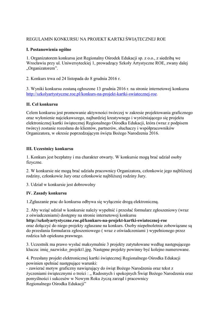 REGULAMIN KONKURSU NA PROJEKT KARTKI ŚWIĄTECZNEJ ROE I. Postanowienia ogólne 1. Organizatorem konkursu jest Regionalny Ośrodek Edukacji sp. z o.o., z siedzibą we Wrocławiu przy ul. Uniwersyteckiej 1, prowadzący Szkoły Artystyczne ROE, zwany dalej „Organizatorem”. 2. Konkurs trwa od 24 listopada do 8 grudnia 2016 r. 3. Wyniki konkursu zostaną ogłoszone 13 grudnia 2016 r. na stronie internetowej konkursu http://szkolyartystyczne.roe.pl/konkurs-na-projekt-kartki-swiatecznej-roe. II. Cel konkursu Celem konkursu jest promowanie aktywności twórczej w zakresie projektowania graficznego oraz wyłonienie najciekawszego, najbardziej kreatywnego i wyróżniającego się projektu elektronicznej kartki świątecznej Regionalnego Ośrodka Edukacji, która (wraz z podpisem twórcy) zostanie rozesłana do klientów, partnerów, słuchaczy i współpracowników Organizatora, w okresie poprzedzającym święta Bożego Narodzenia 2016. III. Uczestnicy konkursu 1. Konkurs jest bezpłatny i ma charakter otwarty. W konkursie mogą brać udział osoby fizyczne. 2. W konkursie nie mogą brać udziału pracownicy Organizatora, członkowie jego najbliższej rodziny, członkowie Jury oraz członkowie najbliższej rodziny Jury. 3. Udział w konkursie jest dobrowolny IV. Zasady konkursu 1.Zgłaszanie prac do konkursu odbywa się wyłącznie drogą elektroniczną. 2. Aby wziąć udział w konkursie należy wypełnić i przesłać formularz zgłoszeniowy (wraz z oświadczeniami) dostępny na stronie internetowej konkursu http://szkolyartystyczne.roe.pl/konkurs-na-projekt-kartki-swiatecznej-roe oraz dołączyć do niego projekty zgłaszane na konkurs. Osoby niepełnoletnie zobowiązane są do przesłania formularza zgłoszeniowego ( wraz z oświadczeniami ) wypełnionego przez rodzica lub opiekuna prawnego. 3. Uczestnik ma prawo wysłać maksymalnie 3 projekty zatytułowane według następującego klucza: imię_nazwisko_projekt1.jpg. Następne projekty powinny być kolejno numerowane. 4. Przesłany projekt elektronicznej kartki świątecznej Regionalnego Ośrodka Edukacji powinien spełniać następujące warunki: - zawierać motyw graficzny nawiązujący do świąt Bożego Narodzenia oraz tekst z życzeniami świątecznymi o treści : „ Radosnych i spokojnych Świąt Bożego Narodzenia oraz pomyślności i sukcesów w Nowym Roku życzą zarząd i pracownicy Regionalnego Ośrodka Edukacji” - zawierać logotyp Regionalnego Ośrodka Edukacji – do pobrania w wersji JPG ze strony internetowej konkursu http://szkolyartystyczne.roe.pl/konkurs-na-projekt-kartkiswiatecznej-roe - zawierać podpis twórcy ( imię i nazwisko lub pseudonim artystyczny), - być niepowtarzalny i oryginalny, - uwzględniać specyfikę firmy i charakter oraz jej działalności w zakresie szeroko rozumianej edukacji. 5. Wysyłany projekt powinien być zapisany w formacie JPG i nie powinien przekraczać 180 kB. Maksymalne rozmiary projektu to 800 pikseli na szerokość i 600 pikseli na wysokość, a minimalne to 300 pikseli w każdym z wymiarów. 6. Uczestnik konkursu, któremu zostanie przyznana nagroda , zobowiązany jest do przesłania wypełnionego i podpisanego formularza zgłoszeniowego (wraz z oświadczeniami) pocztą tradycyjną na adres: Regionalny Ośrodek Edukacji, ul. Ruska 47/48 a, 50-079 Wrocław z dopiskiem: ”konkurs kartka świąteczna”, w ciągu 5 dni od ogłoszenia wyników konkursu. Osoby niepełnoletnie zobowiązane są do przesłania wypełnionego formularza (wraz z oświadczeniami) podpisanego przez rodzica lub opiekuna prawnego. Formularz zgłoszeniowy w wersji edytowalnej można pobrać na stronie konkursowej od dnia 24 listopada 2016 r. Zwycięzca konkursu zobowiązany jest dodatkowo do podpisania z Organizatorem umowy przeniesienia autorskich praw majątkowych do projektu elektronicznej kartki świątecznej Regionalnego Ośrodka Edukacji. W imieniu osoby niepełnoletniej umowę zobowiązany jest podpisać rodzic lub opiekun prawny. Niedopełnienie powyższych formalności przez zwycięzcę konkursu i uczestnika, któremu zostanie przyznana nagroda skutkuje utratą przez niego prawa do odbioru nagrody oraz upoważnia Organizatora to przekazania nagrody innemu uczestnikowi konkursu. 7. Uczestnictwo w konkursie warunkowane jest złożeniem oświadczeń o treści zamieszczonej w formularzu zgłoszeniowym. 8. Wszelkie koszty związane z przygotowaniem oraz dostarczeniem prac konkursowych ponoszą uczestnicy konkursu. 9. Organizator konkursu ma prawo wyłączyć z udziału w konkursie projekty, które nie spełniają warunków Regulaminu lub naruszają przepisy prawa. V. Prawa autorskie 1. Uczestnik konkursu oświadcza że: a) przysługują mu autorskie prawa osobiste i nieograniczone prawa majątkowe do projektu zgłaszanego w konkursie, b) przyjmuje na siebie odpowiedzialność za wszelkie roszczenia osób trzecich związane z naruszeniem ich praw autorskich. 2. Uczestnik konkursu udziela Organizatorowi nieodpłatnej licencji niewyłącznej, uprawniającej Organizatora do korzystania przez czas nieoznaczony, oraz bez ograniczeń terytorialnych z przesłanego projektu na wszystkich polach eksploatacji do działań promujących konkurs. 3. Uczestnik udziela Organizatorowi zgody na publikację projektu na stronach internetowych, portalach społecznościowych oraz materiałach drukowanych Organizatora w ramach działań promujących konkurs. 4. Zwycięzca konkursu przenosi na Organizatora konkursu majątkowe prawa autorskie do korzystania i rozporządzania zwycięskim projektem na wszystkich polach eksploatacji wskazanych w ustawie z dnia 4 lutego 1994 r. o prawie autorskim i prawach pokrewnych. Organizator będzie uprawniony do dalszego rozporządzania autorskimi prawami majątkowymi. W związku przeniesieniem autorskich praw majątkowych do zwycięskiego projektu – zwycięzcy konkursu , poza uprawnieniem do uzyskania nagród określonych w Regulaminie, nie przysługują żadne inne roszczenia do Organizato