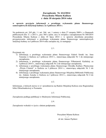 Zarządzenie Nr 414/2014 Prezydenta Miasta Kalisza z dnia 18 sierpnia 2014 roku w sprawie przyjęcia informacji o przebiegu wykonania samorządowych instytucji kultury za I półrocze 2014 r. planu finansowego Na podstawie art. 265 pkt. 1 i art. 266 ust. 1 ustawy z dnia 27 sierpnia 2009 r. o finansach publicznych (Dz. U. z 2013 r., poz. 885 z późn. zm.) w związku z zarządzeniem Nr 360/2014 Prezydenta Miasta Kalisza z dnia 10 lipca 2014 r. w sprawie określenia procedury przygotowania informacji o przebiegu wykonania planu finansowego samorządowych instytucji kultury za I półrocze 2014 roku zarządza się, co następuje: § 1. Przyjmuje się: 1) informację o przebiegu wykonania planu finansowego Galerii Sztuki im. Jana Tarasina w Kaliszu za I półrocze 2014 r., stanowiącą załącznik Nr 1 do niniejszego zarządzenia, 2) informację o przebiegu wykonania planu finansowego Filharmonii Kaliskiej za I półrocze 2014 r., stanowiącą załącznik Nr 2 do niniejszego zarządzenia, 3) informację o przebiegu wykonania planu finansowego Ośrodka Kultury Plastycznej „Wieża Ciśnień” w Kaliszu za I półrocze 2014 r., stanowiącą załącznik Nr 3 do niniejszego zarządzenia, 4) informację o przebiegu wykonania planu finansowego Miejskiej Biblioteki Publicznej im. Adama Asnyka w Kaliszu za I półrocze 2014 r., stanowiącą załącznik Nr 4 do niniejszego zarządzenia. § 2. Informacje, o których mowa w § 1 przedstawia się Radzie Miejskiej Kalisza oraz Regionalnej Izbie Obrachunkowej w Poznaniu. § 3. Zarządzenie podlega publikacji w Biuletynie Informacji Publicznej. § 4. Zarządzenie wchodzi w życie z dniem podpisania. Prezydent Miasta Kalisza /…/ dr inż. Janusz Pęcherz Załącznik Nr 1 do Zarządzenia Nr 414/2014 Prezydenta Miasta Kalisza z dnia 18 sierpnia 2014 r. INFORMACJA O PRZEBIEGU WYKONANIA PLANU FINANSOWEGO GALERII SZTUKI IM. JANA TARASINA ZA I PÓŁROCZE 2014 ROKU INFORMACJA O PRZEBIEGU WYKONANIA PLANU FINANSOWEGO GALERII SZTUKI im. JANA TARASINA W KALISZU ZA I PÓŁROCZE 2014 ROKU Lp. Wyszczególnienie 1. 2. Plan na 2014 r. /po zmianie / 3. Wykonanie za I półrocze 2014r. 4. % 4:3 5. I. PRZYCHODY OGÓŁEM 395.796,00 194.298,80 49,09 1. dotacja podmiotowa: - z budżetu powiatu 360.000,00 180.000,00 50,00 2. przychody własne 35.796,00 14.298,80 39,95 II. 395.796,00 176.316,71 44,55 1. KOSZTY OGÓŁEM z tego: Koszty operacyjne 1,00 0,05 5,00 2. Wynagrodzenia i pochodne od wynagrodzeń 256.213,00 122.411,81 47,78 3. Koszty stałe instytucji kultury 59.082,00 25.445,96 43,07 4. Koszty działalności merytorycznej 80.500,00 28.458,89 35,35 5. Remonty 0,00 0,00 x 6. Inwestycje 0,00 0,00 x 0,00 +17.982,09 III. WYNIK FINANSOWY ( I – II ) IV. Stan środków pieniężnych 17.749,00 31.641,01 178,27 V. Należności 360.000,00 180.600,00 50,14 VI. w tym: wymagalne 0,00 Zobowiązania w tym: wymagalne 13.822,00 0 600,00 x 10.214,85 0,00 73,90 X Kalisz, dnia 24 lipca 2014 r. MIROSŁAWA PANCEWICZ Główny księgowy x Małgorzata Kaźmierczak Dyrektor instytucji CZĘŚĆ OPISOWA DO INFORMACJI Z WYKONANIA PLANU FINANSOWEGO GALERII SZTUKI im. JANA TARASINA W KALISZU ZA I PÓŁROCZE 2014 R. I. Realizacja przychodów z działalności w okresie styczeń – czerwiec 2014 194.298,80 zł w tym: 1. dotacja podmiotowa z budżetu powiatu 180.000,00zł ( dotacja stanowi 92,64 % przychodów ogółem ). Otrzymane dotacje wykorzystane zostały zgodnie z przeznaczeniem tj. na realizację bieżących działań instytucji, w tym : - wypłata wynagrodzeń ze stosunku pracy + pochodne od wynagrodzeń - 122.411,81 zł - wydatki rzeczowe / koszty stałe, koszty działalności wystawienniczej i edukacyjnej/ - 57.588,19 zł 2. pozostałe źródła finansowania działalności razem 14.298,80 zł w tym: a/ przychody z prowadzonej działalności -13.996,96 zł - przychody z opłat za udział w zajęciach eduk. w pracowni "pod galerią”- 3.610,00 zł - przychody ze sprzedaży publikacji – 454,00 zł - przychody ze sprzedaży komisowej –140 ,00 zł - opłata zgłoszeniowa za udział w konkursie plastycznym „Próba 2” – 3.350,00zł - przychody uzyskane z działalności usługowej / projekt i wykonanie dekoracji Ratusza / – 2.450,00 zł - przychody z tyt. współorganizacji wystawy w Hamm -1.192,96 zł - dochód z tyt. sprzedaży pianina -2.800,00 zł c/ przychody z innych źródeł: * przychody operacyjne - 28,00 zł / wynagrodzenie płatnika podatku / * przychody finansowe – 273,84 zł / odsetki /. Przychody własne zrealizowano w 39,95 % - przeznaczone zostały na organizację działalności kulturalnej zgodnie z planem przychodów i kosztów instytucji. II. Realizacja kosztów działalności bieżącej ogółem 176.316,71 zł w tym: A. Koszty operacyjne - 0,05 zł B. Koszty pozostałe /1+2+3/ , z tego: 1. wynagrodzenia i pochodne od wynagrodzeń: a/ wynagrodzenia z osobowego funduszu płac : - wynagrodzenia ze stosunku pracy / 4,5 etatu / - 104.005,27 zł w tym oprawa emerytalna – 16.550,00 zł b/ pochodne od wynagrodzeń: - składki na ubezpieczenia społeczne – 15.575,94 zł - składki na Fundusz Pracy – 937,76 zł - świadczenia pracownicze: • wynagrodzenia urlopowe w wysokości odpisu na zakładowy fundusz św. socjalnych – 1.093,93 zł • bhp – 798,91 zł Koszty wynagrodzeń i pochodnych razem 122.411,81 zł Wykonanie wynagrodzeń osobowych i pochodnych realizowane zgodnie z planem fin. - 47,78 %. 2. koszty stałe instytucji: a) zakupy materiałów i energii, w tym: - zakup materiałów /zużycie materiałów biurowych, środków czystości, wyposażenia, mat. pomocniczych itp./ - 4.089,31 zł - zużycie energii elektrycznej, cieplnej i wody /opłaty nalicz. przez ST. Pow. i Energa SA / – 7.495,84 zł b) usługi obce : - usługi telef. i teleinf. /telefony stacjonarne i komórkowy /- 3.478,63 zł - usługi pocztowe / zakup znaczków i usług pocztowych/ - 627,41 zł - usługi komunalne / nalicz. przez ST. Pow. opłaty za ścieki, śmieci i wywóz nieczystości/ 
