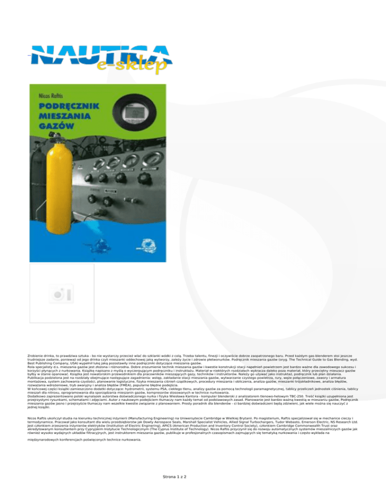 Zrobienie drinka, to prawdziwa sztuka - bo nie wystarczy przecież wlać do szklanki wódki z colą. Trzeba talentu, finezji i oczywiście dobrze zaopatrzonego baru. Przed każdym gas-blenderem stoi jeszcze trudniejsze zadanie, ponieważ od jego drinka czyli mieszanki oddechowej jaką wytworzy, zależy życie i zdrowie płetwonurków. Podręcznik mieszania gazów (oryg. The Technical Guide to Gas Blending, wyd. Best Publishing Company, USA) wypełnił lukę jaką pozostawiły inne podręczniki dotyczące mieszania gazów. Rola specjalisty d.s. mieszania gazów jest złożona i różnorodna. Dobre zrozumienie technik mieszania gazów i kwestie konstrukcji stacji napełnień powietrzem jest bardzo ważne dla zawodowego sukcesu i korzyści płynących z nurkowania. Książkę napisano z myślą o wyczerpującym podręczniku i instruktażu. Materiał w niektórych rozdziałach wykracza daleko poza materiał, który przeciętny mieszacz gazów byłby w stanie opanować. Książka jest nowatorskim przewodnikiem dla pracowników mieszających gazy, techników i instruktorów. Należy go używać jako instruktaż, podręcznik lub plan działania. Publikacja podzielona jest na rozdziały obejmujące następujące zagadnienia: wstęp, zakładanie stacji mieszania gazów, wytwarzanie czystego powietrza, rury, węże połączeniowe, zawory i armatura montażowa, system zachowania czystości, planowanie logistyczne, fizyka mieszania ciśnień cząstkowych, procedury mieszania i obliczenia, analiza gazów, mieszanki trójskładnikowe, analiza błędów, rozważania wdrożeniowe, tryb awaryjny i analiza błędów (FMEA), popularne błędne podejścia. W końcowej części książki zamieszczono dodatki dotyczące: hydrometrii, systemu PSA, ciekłego tlenu, analizy gazów za pomocą technologii paramagnetycznej, tablicy przeliczeń jednostek ciśnienia, tablicy mieszań dla nitroxu, oprogramowania dla sporządzania mieszanin gazów, kompresorów stosowanych w technice nurkowania. Dodatkowo zaprezentowano polski wynalazek autorstwa doświadczonego nurka i fizyka Wiesława Kantora - komputer blenderski z analizatorem tlenowo-helowym TBC-250. Treść książki uzupełniona jest przejrzystymi rysunkami, schematami i zdjęciami. Autor z naukowym podejściem tłumaczy nam każdy temat od podstawowych zasad. Planowanie jest bardzo ważną kwestią w mieszaniu gazów, Podręcznik mieszania gazów jasno i przejrzyście tłumaczy nam wszelkie kwestie związanie z planowaniem. Prosty poradnik dla blenderów - ci bardziej doświadczeni będą zdziwieni, jak wiele można się nauczyć z jednej książki. Nicos Raftis ukończył studia na kierunku technicznej inżynierii (Manufacturing Engineering) na Uniwersytecie Cambridge w Wielkiej Brytanii. Po magisterium, Raftis specjalizował się w mechanice cieczy i termodynamice. Pracował jako konsultant dla wielu przedsiębiorstw jak Dowty Aerospace Seals, Marshall Specialist Vehicles, Allied Signal Turbochargers, Tudor Webasto, Emerson Electric, NS Research Ltd. Jest członkiem zrzeszenia inżynierów elektryków (Institution of Electric Enginering), APICS (American Production and Inventory Control Society), członkiem Cambridge Commonwealth Trust oraz akredytowanym konsultantem przy Cypryjskim Instytucie Technologicznym (The Cyprus Institute of Technology). Nicos Raftis przyczynił się do rozwoju automatycznych systemów mieszalniczych gazów jak również wysoko wydajnych układów filtracyjnych, jest instruktorem mieszania gazów, publikuje w profesjonalnych czasopismach zajmujących się tematyką nurkowania i często wykłada na międzynarodowych konferencjach poświęconych technice nurkowania. Strona 1 z 2 Strona 2 z 2