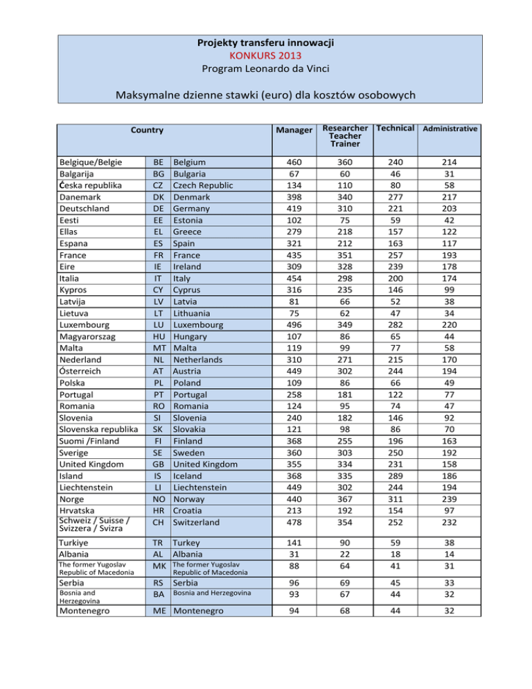 Projekty transferu innowacji KONKURS 2013 Program Leonardo da Vinci Maksymalne dzienne stawki (euro) dla kosztów osobowych Country Manager Researcher Technical Administrative Teacher Trainer Belgique/Belgie Balgarija Ćeska republika Danemark Deutschland Eesti Ellas Espana France Eire Italia Kypros Latvija Lietuva Luxembourg Magyarorszag Malta Nederland Ósterreich Polska Portugal Romania Slovenia Slovenska republika Suomi /Finland Sverige United Kingdom Island Liechtenstein Norge Hrvatska Schweiz / Suisse / Svizzera / Svizra BE BG CZ DK DE EE EL ES FR IE IT CY LV LT LU HU MT NL AT PL PT RO SI SK FI SE GB IS LI NO HR CH Belgium Bulgaria Czech Republic Denmark Germany Estonia Greece Spain France Ireland Italy Cyprus Latvia Lithuania Luxembourg Hungary Malta Netherlands Austria Poland Portugal Romania Slovenia Slovakia Finland Sweden United Kingdom Iceland Liechtenstein Norway Croatia Switzerland 460 67 134 398 419 102 279 321 435 309 454 316 81 75 496 107 119 310 449 109 258 124 240 121 368 360 355 368 449 440 213 478 360 60 110 340 310 75 218 212 351 328 298 235 66 62 349 86 99 271 302 86 181 95 182 98 255 303 334 335 302 367 192 354 240 46 80 277 221 59 157 163 257 239 200 146 52 47 282 65 77 215 244 66 122 74 146 86 196 250 231 289 244 311 154 252 214 31 58 217 203 42 122 117 193 178 174 99 38 34 220 44 58 170 194 49 77 47 92 70 163 192 158 186 194 239 97 232 Turkiye Albania TR Turkey AL Albania MK The former Yugoslav 141 31 88 90 22 64 59 18 41 38 14 31 RS Serbia BA Bosnia and Herzegovina 96 93 69 67 45 44 33 32 ME Montenegro 94 68 44 32 The former Yugoslav Republic of Macedonia Serbia Bosnia and Herzegovina Montenegro Republic of Macedonia Projekty transferu innowacji KONKURS 2013 Program Leonardo da Vinci Maksymalne dzienne stawki (euro) dla kosztów pobytu (utrzymania) Country Belgique/Belgie Balgarija Ćeska republika Danemark Deutschland Eesti Ellas Espana France Eire Italia Kypros Latvija Lietuva Luxembourg Magyarorszag Malta Nederland Ósterreich Polska Portugal Romania Slovenia Slovenska republika Suomi/Finland Sverige United Kingdom Island Liechtenstein Norge Schweiz / Suisse / Svizzera / Svizra Hrvatska - HR Turkiye Albania The former Yugoslav Republic of Macedonia Serbia Bosnia and Herzegovina Montenegro BE BG CZ DK DE EE EL ES FR IE IT CY LV LT LU HU MT NL AT PL PT RO SI SK FI SE GB IS LI NO CH Belgium Bulgaria Czech Republic Denmark Germany Estonia Greece Spain France Ireland Italy Cyprus Latvia Lithuania Luxembourg Hungary Malta Netherlands Austria Poland Portugal Romania Slovenia Slovakia Finland Sweden United Kingdom Iceland Liechtenstein Norway Switzerland HR TR AL MK Croatia Turkey Albania The former Yugoslav Republic of Macedonia RS Serbia BA Bosnia and Herzegovina ME Montenegro Daily rates (€) 232 145 195 311 220 175 220 227 269 253 247 194 172 168 232 184 191 242 246 179 197 161 208 186 277 275 312 235 340 340 340 214 190 171 158 154 170 158