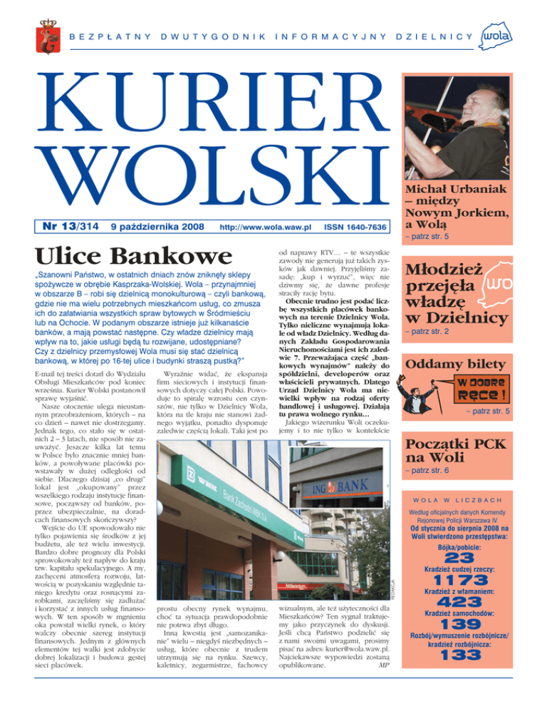 B E Z P Ł A T N Y D W U T Y G O D N I K I N F O R M A C Y J N Y D Z I E L N I C Y KURIER WOLSKI Nr 13/314 9 października 2008 http://www.wola.waw.pl ISSN 1640-7636 Michał Urbaniak – między Nowym Jorkiem, a Wolą – patrz str. 5 Ulice Bankowe „Szanowni Państwo, w ostatnich dniach znów zniknęły sklepy spożywcze w obrębie Kasprzaka-Wolskiej. Wola – przynajmniej w obszarze B – robi się dzielnicą monokulturową – czyli bankową, gdzie nie ma wielu potrzebnych mieszkańcom usług, co zmusza ich do załatwiania wszystkich spraw bytowych w Śródmieściu lub na Ochocie. W podanym obszarze istnieje już kilkanaście banków, a mają powstać następne. Czy władze dzielnicy mają wpływ na to, jakie usługi będą tu rozwijane, udostępniane? Czy z dzielnicy przemysłowej Wola musi się stać dzielnicą bankową, w której po 16-tej ulice i budynki straszą pustką?” Wyraźnie widać, że ekspansja firm sieciowych i instytucji finan− sowych dotyczy całej Polski. Powo− duje to spiralę wzrostu cen czyn− szów, nie tylko w Dzielnicy Wola, która na tle kraju nie stanowi żad− nego wyjątku, ponadto dysponuje zaledwie częścią lokali. Taki jest po Młodzież przejęła władzę w Dzielnicy – patrz str. 2 Oddamy bilety – patrz str. 5 Początki PCK na Woli – patrz str. 6 W O L A W L I C Z B A C H Według oficjalnych danych Komendy Rejonowej Policji Warszawa IV Od stycznia do sierpnia 2008 na Woli stwierdzono przestępstwa: Bójka/pobicie: 23 Kradzież cudzej rzeczy: REDAKCJA E−mail tej treści dotarł do Wydziału Obsługi Mieszkańców pod koniec września. Kurier Wolski postanowił sprawę wyjaśnić. Nasze otoczenie ulega nieustan− nym przeobrażeniom, których – na co dzień – nawet nie dostrzegamy. Jednak tego, co stało się w ostat− nich 2 – 3 latach, nie sposób nie za− uważyć. Jeszcze kilka lat temu w Polsce było znacznie mniej ban− ków, a powoływane placówki po− wstawały w dużej odległości od siebie. Dlaczego dzisiaj „co drugi” lokal jest „okupowany” przez wszelkiego rodzaju instytucje finan− sowe, począwszy od banków, po− przez ubezpieczalnie, na dorad− cach finansowych skończywszy? Wejście do UE spowodowało nie tylko pojawienia się środków z jej budżetu, ale też wielu inwestycji. Bardzo dobre prognozy dla Polski sprowokowały też napływ do kraju tzw. kapitału spekulacyjnego. A my, zachęceni atmosferą rozwoju, łat− wością w pozyskaniu względnie ta− niego kredytu oraz rosnącymi za− robkami, zaczęliśmy się zadłużać i korzystać z innych usług finanso− wych. W ten sposób w mgnieniu oka powstał wielki rynek, o który walczy obecnie szereg instytucji finansowych. Jednym z głównych elementów tej walki jest zdobycie dobrej lokalizacji i budowa gęstej sieci placówek. od naprawy RTV… – te wszystkie zawody nie generują już takich zys− ków jak dawniej. Przyjęliśmy za− sadę: „kup i wyrzuć”, więc nie dziwmy się, że dawne profesje straciły rację bytu. Obecnie trudno jest podać licz− bę wszystkich placówek banko− wych na terenie Dzielnicy Wola. Tylko nieliczne wynajmują loka− le od władz Dzielnicy. Według da− nych Zakładu Gospodarowania Nieruchomościami jest ich zaled− wie 7. Przeważająca część „ban− kowych wynajmów” należy do spółdzielni, developerów oraz właścicieli prywatnych. Dlatego Urząd Dzielnicy Wola ma nie− wielki wpływ na rodzaj oferty handlowej i usługowej. Działają tu prawa wolnego rynku… Jakiego wizerunku Woli oczeku− jemy i to nie tylko w kontekście prostu obecny rynek wynajmu, choć ta sytuacja prawdopodobnie nie potrwa zbyt długo. Inną kwestią jest „samozanika− nie” wielu – niegdyś niezbędnych – usług, które obecnie z trudem utrzymują się na rynku. Szewcy, kaletnicy, zegarmistrze, fachowcy wizualnym, ale też użyteczności dla Mieszkańców? Ten sygnał traktuje− my jako przyczynek do dyskusji. Jeśli chcą Państwo podzielić się z nami swoimi uwagami, prosimy pisać na adres: [email protected]. Najciekawsze wypowiedzi zostaną opublikowane. MP 1173 Kradzież z włamaniem: 423 Kradzież samochodów: 139 Rozbój/wymuszenie rozbójnicze/ kradzież rozbójnicza: 133 S A M O R Z Ą D O W A Urząd Dzielnicy Wola m.st. Warszawy, Al. Solidarności 90, tel. 022 504−83−00 (03) Wydział Obsługi Mieszkańców tel. 022 504−86−23 Wydział Infrastruktury tel. 022 504−84−11 Wydział Kultury tel. 022 862 29 84 Wydział Ochrony Środowiska tel. 022 862 13 60, 022 862 29 76 Wydział Oświaty i Wychowania tel. 022 504−84−33 Wydział Sportu i Rekreacji tel. 022 − 504−84−51, 022−504−84−50 Wydział Spraw Społecznych i Zdrowia tel. 022 636−21−60 Wydział Zasobów Lokalowych tel. 022 504−84−65 Delegatura Biura Administracji i Spraw Obywatelskich tel. 022 504−84−97 Ważne telefony: POLICJA: 997; Komenda Rejonowa policji Warszawa IV, ul. Żytnia 36: 0−22 632−04−73, 0−22 603−72−55 (56) STRAŻ POŻARNA: 998 Jednostka Ratownicza−Gaśnicza nr 4, ul. Chłodna 3: tel. 0−22 624−74−50 STRAŻ MIEJSKA: 986 IV Oddział Terenowy, ul. Sokołow− ska 10: 0−22 632−97−37 POGOTOWIE RATUNKOWE: 999 NR ALARMOWY Z TEL. KOM.: 112 URZĄD SKARBOWY WOLA ul. Powstańców Śląskich 2d, tel. 0−22 533−66−00 POMOC DROGOWA (24 h): 981; 022 96 33 POGOTOWIE WOD−KAN: 994 POGOTOWIE GAZOWE: 992 POGOTOWIE ENERGET.: 991 INFORMACJA TEL.: 118−913 INFORMATOR KULTURALNY: 0−22 629−84−89 INFORMACJA PKP: 94−36 INFORMACJA PKS: 0−701−37−44−44 KOMUNIKACJA MIEJSKA: 94−84 W poniedziałki inne godziny urzędowania Od poniedziałku 21 kwietnia 2008 r. zmianie uległy dotychczasowe go− dziny pracy Urzędu Dzielnicy Wola. Zgodnie z Regulaminem Urząd Mia− sta i Urzędy Dzielnic będą pracowa− ły we wszystkie dni powszednie, w godz. 8.00−16.00. Jednocześnie tak, jak do tej pory w Urzędzie Dzielnicy Wola czynne będą w poniedziałki, między 1
