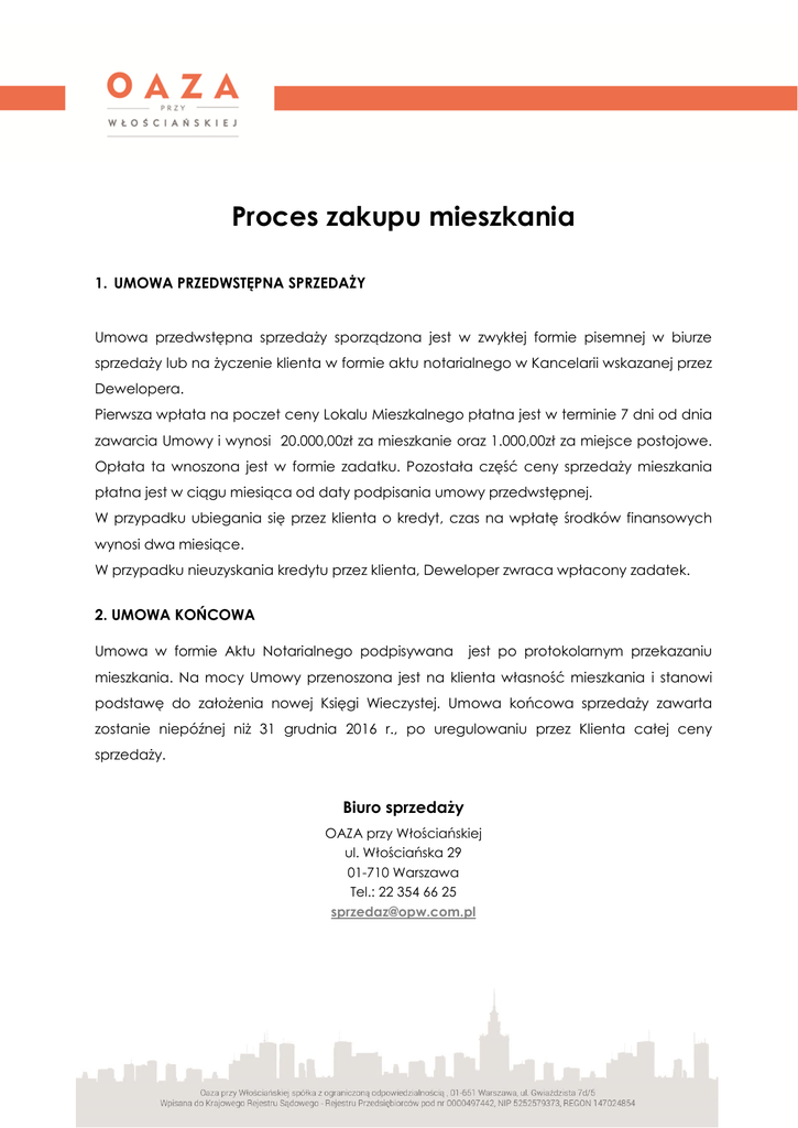 Proces zakupu mieszkania 1. UMOWA PRZEDWSTĘPNA SPRZEDAŻY Umowa przedwstępna sprzedaży sporządzona jest w zwykłej formie pisemnej w biurze sprzedaży lub na życzenie klienta w formie aktu notarialnego w Kancelarii wskazanej przez Dewelopera. Pierwsza wpłata na poczet ceny Lokalu Mieszkalnego płatna jest w terminie 7 dni od dnia zawarcia Umowy i wynosi 20.000,00zł za mieszkanie oraz 1.000,00zł za miejsce postojowe. Opłata ta wnoszona jest w formie zadatku. Pozostała część ceny sprzedaży mieszkania płatna jest w ciągu miesiąca od daty podpisania umowy przedwstępnej. W przypadku ubiegania się przez klienta o kredyt, czas na wpłatę środków finansowych wynosi dwa miesiące. W przypadku nieuzyskania kredytu przez klienta, Deweloper zwraca wpłacony zadatek. 2. UMOWA KOŃCOWA Umowa w formie Aktu Notarialnego podpisywana jest po protokolarnym przekazaniu mieszkania. Na mocy Umowy przenoszona jest na klienta własność mieszkania i stanowi podstawę do założenia nowej Księgi Wieczystej. Umowa końcowa sprzedaży zawarta zostanie niepóźnej niż 31 grudnia 2016 r., po uregulowaniu przez Klienta całej ceny sprzedaży. Biuro sprzedaży OAZA przy Włościańskiej ul. Włościańska 29 01-710 Warszawa Tel.: 22 354 66 25 [email protected]