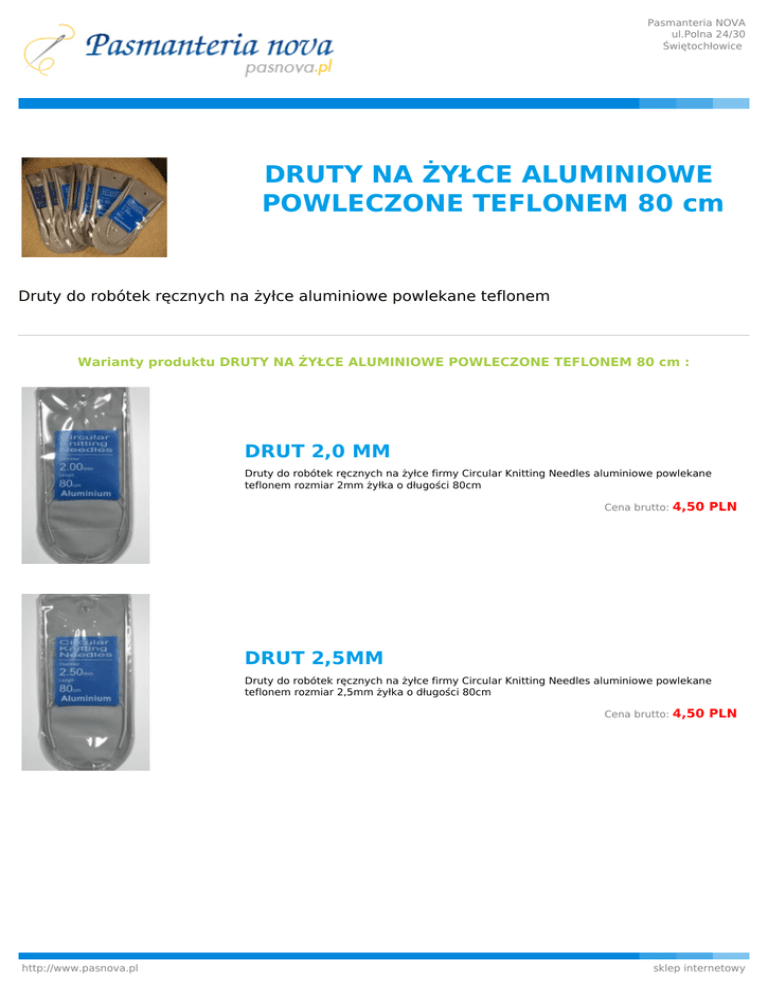 Pasmanteria NOVA ul.Polna 24/30 Świętochłowice DRUTY NA ŻYŁCE ALUMINIOWE POWLECZONE TEFLONEM 80 cm Druty do robótek ręcznych na żyłce aluminiowe powlekane teflonem Warianty produktu DRUTY NA ŻYŁCE ALUMINIOWE POWLECZONE TEFLONEM 80 cm : DRUT 2,0 MM Druty do robótek ręcznych na żyłce firmy Circular Knitting Needles aluminiowe powlekane teflonem rozmiar 2mm żyłka o długości 80cm Cena brutto: 4,50 PLN DRUT 2,5MM Druty do robótek ręcznych na żyłce firmy Circular Knitting Needles aluminiowe powlekane teflonem rozmiar 2,5mm żyłka o długości 80cm Cena brutto: http://www.pasnova.pl 4,50 PLN sklep internetowy Pasmanteria NOVA ul.Polna 24/30 Świętochłowice DRUT 3,0 MM Druty do robótek ręcznych na żyłce firmy Circular Knitting Needles aluminiowe powlekane teflonem rozmiar 3mm żyłka o długości 80cm Cena brutto: 4,80 PLN DRUT 3,5MM Druty do robótek ręcznych na żyłce firmy Circular Knitting Needles aluminiowe powlekane teflonem rozmiar 3,5mm żyłka o długości 80cm Cena brutto: 5,50 PLN DRUT 4,0 MM Druty do robótek ręcznych na żyłce firmy Circular Knitting Needles aluminiowe powlekane teflonem rozmiar 4 mm żyłka o długości 80cm Cena brutto: http://www.pasnova.pl 5,60 PLN sklep internetowy Pasmanteria NOVA ul.Polna 24/30 Świętochłowice DRUT 4,5 MM Druty do robótek ręcznych na żyłce firmy Circular Knitting Needles aluminiowe powlekane teflonem rozmiar 4,5mm żyłka o długości 80cm Cena brutto: 5,70 PLN DRUT 5,0 MM Druty do robótek ręcznych na żyłce firmy Circular Knitting Needles aluminiowe powlekane teflonem rozmiar 5 mm żyłka o długości 80cm Cena brutto: 5,70 PLN DRUT 5,50 MM Druty do robótek ręcznych na żyłce firmy Circular Knitting Needles aluminiowe powlekane teflonem rozmiar 5,5mm żyłka o długości 80cm Cena brutto: http://www.pasnova.pl 6,00 PLN sklep internetowy Pasmanteria NOVA ul.Polna 24/30 Świętochłowice DRUT 6,0 MM Druty do robótek ręcznych na żyłce firmy Circular Knitting Needles aluminiowe powlekane teflonem rozmiar 6,O mm żyłka o długości 80cm Cena brutto: 6,50 PLN DRUT 7,0 MM Druty do robótek ręcznych na żyłce firmy Circular Knitting Needles aluminiowe powlekane teflonem rozmiar 7,O mm żyłka o długości 80cm Cena brutto: 7,00 PLN DRUT 8,0 MM Druty do robótek ręcznych na żyłce firmy Circular Knitting Needles aluminiowe powlekane teflonem rozmiar 8,0 mm żyłka o długości 80cm Cena brutto: 7,00 PLN DRUT 8,0 MM INOX Druty do robótek ręcznych na żyłce firmy INOX aluminiowe powlekane teflonem rozmiar 8mm żyłka o długości 80cm Cena brutto: http://www.pasnova.pl 22,00 PLN sklep internetowy Pasmanteria NOVA ul.Polna 24/30 Świętochłowice DRUT 9,0 MM Druty do robótek ręcznych na żyłce firmy Circular Knitting Needles aluminiowe powlekane teflonem rozmiar 9,0 mm żyłka o długości 80cm Cena brutto: 7,50 PLN DRUT 9,0 MM INOX Druty do robótek ręcznych na żyłce firmy INOX aluminiowe powlekane teflonem rozmiar 9mm żyłka o długości 80cm Cena brutto: 23,00 PLN e.DRUT 10,0 MM Druty do robótek ręcznych na żyłce firmy Circular Knitting Needles aluminiowe powlekane teflonem rozmiar 10,0 mm żyłka o długości 80cm Cena brutto: 8,00 PLN e.DRUT 12.00 MM Druty do robótek ręcznych na żyłce firmy Circular Knitting Needles aluminiowe powlekane teflonem rozmiar 12mm żyłka o długości 80cm Cena brutto: http://www.pasnova.pl 9,50 PLN sklep internetowy Pasmanteria NOVA ul.Polna 24/30 Świętochłowice e.DRUT 15.00 MM Druty do robótek ręcznych na żyłce firmy MILWARD plastikowe rozmiar 15 mm żyłka o długości 80cm Cena brutto: http://www.pasnova.pl 18,90 PLN sklep internetowy