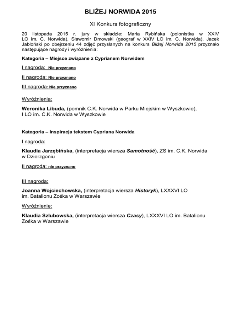 BLIŻEJ NORWIDA 2015 XI Konkurs fotograficzny 20 listopada 2015 r. jury w składzie: Maria Rybińska (polonistka w XXIV LO im. C. Norwida), Sławomir Dmowski (geograf w XXIV LO im. C. Norwida), Jacek Jabłoński po obejrzeniu 44 zdjęć przysłanych na konkurs Bliżej Norwida 2015 przyznało następujące nagrody i wyróżnienia: Kategoria – Miejsce związane z Cyprianem Norwidem I nagroda: Nie przyznano II nagroda: Nie przyznano III nagroda: Nie przyznano Wyróżnienia: Weronika Libuda, (pomnik C.K. Norwida w Parku Miejskim w Wyszkowie), I LO im. C.K. Norwida w Wyszkowie Kategoria – Inspiracja tekstem Cypriana Norwida I nagroda: Klaudia Jarzębińska, (interpretacja wiersza Samotność), ZS im. C.K. Norwida w Dzierzgoniu II nagroda: nie przyznano III nagroda: Joanna Wojciechowska, (interpretacja wiersza Historyk), LXXXVI LO im. Batalionu Zośka w Warszawie Wyróżnienie: Klaudia Szlubowska, (interpretacja wiersza Czasy), LXXXVI LO im. Batalionu Zośka w Warszawie