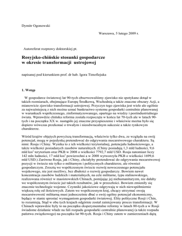 Dymitr Ogonowski Warszawa, 5 lutego 2009 r. Autoreferat rozprawy doktorskiej pt. Rosyjsko-chińskie stosunki gospodarcze w okresie transformacji ustrojowej napisanej pod kierunkiem prof. dr hab. Igora Timofiejuka 1. Wstęp W gospodarce światowej lat 90-tych obserwowaliśmy zjawisko nie spotykane dotąd w takich rozmiarach, obejmujące Europę Środkową, Wschodnią a także znaczne obszary Azji, a mianowicie zjawisko transformacji ustrojowej. Przyczyn tego zjawiska jest wiele ale ogólnie za najważniejszą z nich można uznać bankructwo systemu gospodarki centralnie planowanej w warunkach współczesnego, zinformatyzowanego, opartego na wiedzy i postindustrialnego świata. Wprawdzie chińska reforma została rozpoczęta w końcu lat 70-tych ale w latach 90tych i na początku XX w. nastąpiło jej znaczne przyspieszenie i właściwie można było się dopiero wówczas przekonać o trwałym i nieodwracalnym sukcesie a także rynkowym charakterze. Wśród krajów objętych powyższą transformacją, właściwie tylko dwa, ze względu na swój potencjał, mogą w pojedynkę pretendować do odgrywania mocarstwowego charakteru. Są nimi: Rosja i Chiny. Wynika to z ich wielkości terytorialnej, potencjału ludnościowego, a także wielkości posiadanych zasobów naturalnych. (Chiny posiadają 1,3 mld ludności, 9,6 mld km2 terytorium oraz PKB w 2008 o wielkości 7792,7 mld USD. Rosja natomiast liczy 142 mln ludności, 17 mld km2 powierzchni a w 2008 wytworzyła PKB o wielkości 1699,6 mld USD.) Zarówno Rosja, jak i Chiny, chciałyby pretendować do odgrywania mocarstwowej pozycji w świecie nie tylko o militarnym i politycznych charakterze, ale również gospodarczym. Zresztą we współczesnym świecie rozwój nowoczesnego potencjału wojskowego, nie jest możliwy, bez dbałości o rozwój gospodarczy. Bowiem nawet koncentracja zasobów ludzkich i materialnych, na cele militarne, typu stalinowskiego, realizowana również w maoistowskich Chinach, pomijając jej niehumanitaryzm, nie dałaby we współczesnym świecie już takich rezultatów, jak w przeszłości. Bowiem zmieniły się znacznie technologie wojenne. Czynniki jakościowe odgrywają w nich niewspółmiernie większą rolę od ilościowych. Zatem we współczesnym kraj, chcący utrzymać swoją mocarstwowość militarną musi jednocześnie dbać o swój ogólny potencjał ekonomiczny, będący w stanie sprostać wymaganiom gospodarki światowej. Elity polityczne Rosji i Chin, to rozumieją. Stąd w obu tych krajach odgórnie został zainicjowany proces transformacji. W Chinach wprawdzie były to na początku eksperymentalne reformy w latach 80-tych a w Rosji świadome działanie władz na fali rozpadu gospodarki centralnie planowanej (a także rozpadu państwa związkowego) na początku lat 90-tych. Rosja i Chiny zatem w zamierzeniach dążą do budowy gospodarek mogących podołać współczesnym wyzwaniom świata, co pozwoliłoby im zachować mocarstwowe pozycje. Rodzi się tu jednak wiele pytań. Na ile sprzyjające temu celowi, warunki geograficzne i demograficzne, zostaną wykorzystane? Przebudowa systemu gospodarczego jest bowiem procesem bardzo trudnym i związanym z ogromnymi kosztami społecznymi. Rosja i Chiny są krajami sąsiednimi. Zatem ciekawym zagadnieniem jest również to, jak transformacja systemowa, wraz z innymi czynnikami, wpływa na skalę i jakość wzajemnych powiązań. Na ile przebudowa struktur gospodarczych obu krajów sprzyja wzrostowi wzajemnych powiązań handlowych i inwestycyjnych? Można też odpowiedzieć na pytanie – dlaczego współpraca Rosji i Chin, pomimo jej odbudowy na początku XXI w., jest niewielka jak na kraje sąsiednie, w stosunku do ich potencjału? Również bardzo ciekawym zagadnieniem jest przyszły charakter rosyjsko-chińskiej współpracy gospodarczej, w tym to czy Rosja, wbrew swoim zamierzeniom, dla Chin będzie również surowcowym zapleczem? I czy czynnikiem hamującym w tym względzie jest jedynie możliwe wyczerpanie się rosyjskich surowców energetycznych w pierwszej połowie obecnego wieku? Oczywiście nowe poszukiwania geologiczne są prowadzone. Jednak Rosja, jeżeli nie zdąży poprawić innowacyjności swojej gospodarki, to prawdopodobnie będzie na marginesie gospodarki światowej. Bowiem przy obecnym tempie eksploatacji, jej wykryte zasoby surowców energetycznych, praktycznie wyczerpią się w połowie obecnego wieku. W pracy doktorskiej podjąłem próbę odpowiedzi na powyższe pytania badawcze, związane zarówno z transformacją ustrojową Rosji i Chin, jak i też na jej wpływem na relacje wzajemne. Oczywiście miałem na celu analizę pod kątem spraw ekonomicznych. Jednak są to kraje, w których czynniki instytucjonalne a w szczególności polityczne, mają kluczowe zagadnienie dla gospodarki, o wiele większe niż ma to miejsce w Stanach Zjednoczonych czy UE. Zatem praca dla wyjaśnienia zagadnień ekonomicznych, musiała silnie wkraczać w badanie sfery politycznej, kulturalnej i społecznej. Głównym celem pracy jest wykazanie, iż mimo zamierzonym celom, w stosunkach z Chinami, Rosja również staje się głównie źródłem zaopatrzenia w surowce, nie tylko energetyczne, oraz importerem tanich dóbr konsumpcyjnych. Na początku lat 90-tych nie było wiadomo, jaki charakter będzie miała odbudowywana po dziesięcioleciach przerwy, współpraca gospodarcza pomiędzy obu krajami. Rosja miała w planach być partnerem dominującym, a przynajmniej równorzędnym. Uważała, że umożliwi jej to posiadany kapitał ludzki, dzięki któremu o wiele łatwiej niż Chiny dostosuje się do wymagań współczesnej gospodarki światowej. W rzeczywistości okazało się, że gospodarka Rosji po kilkunastu latach transformacji, nadal wykazuje się znikomą innowacyjnością. Posiada w związku z tym niewiele branż zaawansowanych technologicznie, w których może być konkurencyjna. Podstawową gałęzią jest tu oczywiście przemysł zbrojeniowy. W tej dzie