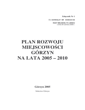 Zał cznik Nr 1 Do UCHWAŁAY NR XXXIII/231/05 RADY MIEJSKIEJ W LUBSKU z dnia 29 czerwca 2005 r. PLAN ROZWOJU MIEJSCOWO CI GÓRZYN NA LATA 2005 – 2010 Górzyn 2005 Sołectwo Górzyn 2 SPIS TRE CI: I. CHARAKTERYSTYKA MIEJSCOWO CI GÓRZYN 3 II. ANALIZA ZASOBÓW 9 III. OCENA MOCNYCH I SŁABYCH STRON MIEJSCOWO CI 25 IV. PLAN ROZWOJU WSI 26 V. 35 OPIS PLANOWANEGO PRZEDSI WZIECIA VI. SZACUNKOWY KOSZTORYS PLANOWANEGO PRZEDSI WZI CIA 36 VII. HARMONOGRAM PLANOWANEGO PRZEDSI WZI CIA 37 3 I. CHARAKTERYSTYKA MIEJSCOWOSCI GÓRZYN 1.RYS HISTORYCZNY Górzyn to najwi ksza w gminie Lubsko wie , licz ca 188 numerów i około 1000 mieszka ców. Poło ona jest na trasie Krosno Odrza skie-Lubsko- ary, mi dzy Równin Lubusk na południu, a Pagórkami Kaniowskimi na północy. Do najbli szego miasta Lubska jest 4 km. Jest to wie o szczególnej tradycji historycznej, która wi e si z przybyciem na te tereny Łu yczan, a nast pnie osiedleniem si po II wojnie wiatowej Ko ciuszkowców. Nie da si ustali dokładnie, kiedy została zało ona wie Górzyn. Mogło to nast pi w VI-VII wieku n.e., kiedy to na naszym terenie osiedlili si Łu yczanie, zajmuj c ziemie opuszczone przez poprzednich mieszka ców, o nie ustalonej narodowo ci. Łu yczanie byli pierwszymi mieszka cami, których rodowód mo na ustali bezbł dnie. Na to wskazuj pewne ródła niemieckie z XX wieku. Na przykład w przewodniku po mie cie Lubsku, wydanym w roku 1923napisano: „Na północ od Lubska w „zak tku łu yckim” le trzy wioski: Górzyn, Grabków i D browa. Wszystkie trzy były niegdy łu yckimi, jak potwierdzaj to ju nazwy (niemieckie G hren, Grabkow, Dubrau)”. Nie wiadomo jaka była łu ycka nazwa wsi Górzyn. Niemieckie nazwy spotykane w literaturze L: Gerow, Geren, Geran, i G hren, jak podkre laj ródła niemieckie, pochodz od łu yckiego słowa „gora” i mog by tłumaczone jako „górska wie ”. To znaczenie odpowiada zupełnie poło eniu Górzyna, gdy wioska przylega jak było wspomniane do do wysokiego ła cucha wzgórz, pagórków od zachodu. Górzyn le y na terenie historycznych wschodnich Dolnych Łu yc, których podbój w X wieku zapocz tkował niemieck kolonizacj . Łu yczanie górzy scy oraz cały teren Łu yc otrzymali na wiele stuleci s siedztwo niemieckie. Jednocze nie rosło znaczenie wsi, na co mo e wskazywa fakt, e przynajmniej w XIV, a najpó niej w XV wieku Górzyn posiada ju ko ciół. Wykaz ko ciołów z 1945 roku potwierdza ten fakt. Parafia w Górzynie płaci roczn danin biskupowi w Mi ni w wysoko ci 6 marek srebra. To oznaczało, e parafia była bogat . W tym czasie Górzyn jest wsi o posiadanie której warto zabiega . Jeden z pierwszych znanych dokumentów mówi, e wie w roku 1482 była przedmiotem sporu pomi dzy margrabi brandenburskim Johannem, a ksi ciem aga skim Janem. Spór ostatecznie zako czył si zwyci stwem tego pierwszego, zawarciem pokoju w Kamie cu Z bkowickim na mocy którego Lubsko oraz oczywi cie Górzyn, a tak e całe ksi stwo kro nie skie przeszło pod władanie Brandenburgii. W ten sposób wie z reszt okalaj cych j ziem utworzyła charakterystyczny klin terytorialny id cy na południe od Krosna a po Lubsko. Tak ustalona granica mi dzy Brandenburgi , a Łu ycami przetrwała do 1815 roku, a jako granica administracyjna powiatu kro nie skiego, a do połowy XX wieku. Pi lat pó niej w roku 1487 Górzyn kupił rycerz Zygmunt von Rothenberg, a w 1490 roku jego owdowiała ona otrzymała wie na mocy zapisu margrabiego. W 1500 roku wła cicielami s Marcin i Jan Schlichtyngowie. Z pó niejszych dokumentów wynika, e od 1663 wie przechodzi na własno rodu szlacheckiego Gablenzów, znanego ju w XIV wieku. Ostatni z tej rodziny zmarł w roku 1774. Górzyn przeszedł nast pnie w r ce Blombergów, a w roku 1818 został sprzedany miejscowym chłopom i podzielony pomi dzy nich. W 1841 roku rozebrano pałac do fundamentów. Z zabytków pozostała jedynie dwukondygnacyjna wie a murowana z kamienia pochodz ca z XV wieku oraz obok niej XIX wieczna dzwonnica i pochodz ce z tego wieku budynki szkolne, a tak e dom z XVIII wieku. XVIII stulecie w dziejach Górzyna było bogate w burzliwe wydarzenia. Pierwszym wydarzeniem, które weszło do historii walki Serbów Łu yckich o j zyk narodowy, był spór o 4 pastora, który rozpocz ł si na pocz tku wieku z powodu obsadzenia stanowiska proboszcza parafii na miejsce zmarłego. Wła ciciel wsi, pan von Gablenz, obsadzi wakuj ce miejsce pastorem (po reformacji parafia była ewangelicka) nazwiskiem Titius, który przedtem przez 20 lat był proboszczem w Lutolu koło Lubska. Ludno Łu ycka parafii w Górzynie nie chciała zgodzi si na niego, gdy on nie znał ich j zyka, chocia w Lutolu, wsi łu yckiej, miał okazj nauczy si go w ci gu 20 lat. Spór pomi dzy wła cicielem wsi a Łu yczanami trwał ponad 2 lata i zako czył si jesieni 1709 roku. Jak wynika z korespondencji urz dowej w tej sprawie, wielk rol odegrał pastor łu yckiego pochodzenia Marcin Lehman z Saksonii. Był on sercem i dusz po stronie zbuntowanych rodaków i doprowadził spraw do tego, e zainteresował si ni król pruski Fryderyk I. Stanowcza postawa ludno ci łu yckiej, a w zwi zku z tym króla sprawiła, e pan von Gablenz i władze ko cielne przyj ły na stanowisko wikarego studenta teologii nazwiskiem Hancke, znaj cego dobrze j zyk łu ycki. To oznaczało, e yczeniu, a eby w ko ciele parafialnym w Górzynie odprawiano nabo e stwa po łu ycku dla ludno ci słowia skiej oraz w tym j zyku prowadzono prac duszpastersk , stało si zado . Drugim wielkim wydarzeniem w yciu wsi, jeszcze szlacheckiej, był po ar w czerwcu 1763 roku. Pastw płomieni padł ko ciół, plebania, organistówka oraz 70 gospodarstw. Ko ciół, jak podaj ródła, miał by odbudowany w 1764 roku. Trzecim wydarzeniem i to powa nym był spór wsi z dziedzicem w ko cu XVIII wieku. Sprawa ta jest znana bardzo fragmentarycznie. Chodziło o to, e dziedzic postanowił odł czy od gruntów górzy skich, grunta znajduj ce si na północ na tere