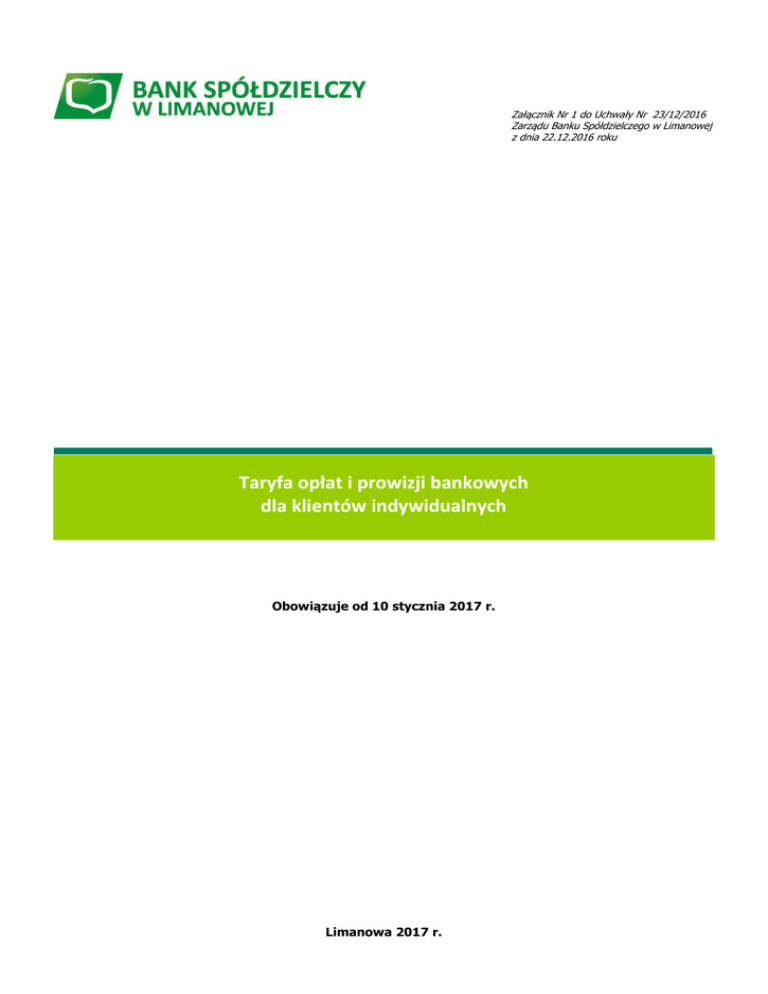 Taryfa opłat i prowizji - Bank Spółdzielczy w Limanowej