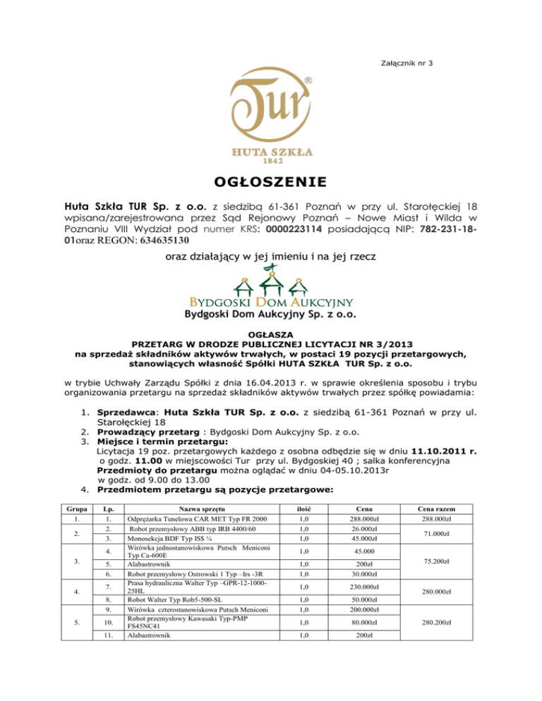 Załącznik nr 3 OGŁOSZENIE Huta Szkła TUR Sp. z o.o. z siedzibą 61-361 Poznań w przy ul. Starołęckiej 18 wpisana/zarejestrowana przez Sąd Rejonowy Poznań – Nowe Miast i Wilda w Poznaniu VIII Wydział pod numer KRS: 0000223114 posiadającą NIP: 782-231-1801oraz REGON: 634635130 oraz działający w jej imieniu i na jej rzecz Bydgoski Dom Aukcyjny Sp. z o.o. OGŁASZA PRZETARG W DRODZE PUBLICZNEJ LICYTACJI NR 3/2013 na sprzedaż składników aktywów trwałych, w postaci 19 pozycji przetargowych, stanowiących własność Spółki HUTA SZKŁA TUR Sp. z o.o. w trybie Uchwały Zarządu Spółki z dnia 16.04.2013 r. w sprawie określenia sposobu i trybu organizowania przetargu na sprzedaż składników aktywów trwałych przez spółkę powiadamia: 1. Sprzedawca: Huta Szkła TUR Sp. z o.o. z siedzibą 61-361 Poznań w przy ul. Starołęckiej 18 2. Prowadzący przetarg : Bydgoski Dom Aukcyjny Sp. z o.o. 3. Miejsce i termin przetargu: Licytacja 19 poz. przetargowych każdego z osobna odbędzie się w dniu 11.10.2011 r. o godz. 11.00 w miejscowości Tur przy ul. Bydgoskiej 40 ; salka konferencyjna Przedmioty do przetargu można oglądać w dniu 04-05.10.2013r w godz. od 9.00 do 13.00 4. Przedmiotem przetargu są pozycje przetargowe: Grupa 1. 2. Lp. 1. 2. 3. 4. 3. 4. 5. 6. 7. 8. 9. 5. 10. 11. Nazwa sprzętu Odprężarka Tunelowa CAR MET Typ FR 2000 Robot przemysłowy ABB typ IRB 4400/60 Monosekcja BDF Typ IS$ ¼ Wirówka jednostanowiskowa Putsch Meniconi Typ Ca-600E Alabastrownik Robot przemysłowy Ostrowski 1 Typ –Irs -3R Prasa hydrauliczna Walter Typ –GPR-12-100025HL Robot Walter Typ Rob5-500-SL Wirówka czterostanowiskowa Putsch Meniconi Robot przemysłowy Kawasaki Typ-PMP FS45NC41 Alabastrownik ilość 1,0 1,0 1,0 Cena 288.000zł 26.000zł 45.000zł 1,0 45.000 1,0 1,0 200zł 30.000zł 1,0 230.000zł 1,0 1,0 50.000zł 200.000zł 1,0 80.000zł 1,0 200zł Cena razem 288.000zł 71.000zł 75.200zł 280.000zł 280.200zł Grupa Lp. 12. 13. 6. 14. 7. 15. 8. 16. 9. 17. 10. 18. 11. 19. 20. 12. 21. 22. 23. 24. 25. 13. 14. 26. 15. 16. 17. 18. 19. 27. 28. 29. 30. 31. Nazwa sprzętu Robot przemysłowy Ostrowski 2 Typ –Irs -3R Prasa pneumatyczna ,,Kutzschera” Typ RPH 6 Ziębniczy osuszacz sprężonego powietrza Typ Donaltson Zbiornik sprężonego powietrza Wiertarka dwuwrzecionowa do szkła Batisti Typ TG Dwustanowiskowa wiertarka do szkła Batisti Typ TG /A2/01 D5-13527 Wiertarka ręczna do szkła Batisti Typ Tg1/22/04D4-2-411 Urządzenie do uszlachetniania wewnętrznego z neutralizatorem Typ –UV Dokumentacja oraz oprzyrządowanie wanny projektu Bedgoni Poziomomierz do pomiaru poziomu szkła Mieszadła do szkła Typ Bedgoni Palniki do wanny małe Typ Bedgoni Palniki do wanny duże Typ –Bedgoni Palniki do wanny typ Kromschoder Wentylator mały odcinający wanny Typ VcXM452/2N4A132S/RD Wentylatory małe przepływowe Typ WB 315 Wentylator do palników Typ Wicenza Bech Szafy sterownicze wanny Formy na wirówkę Formy do produkcji ręcznej ilość 1,0 1,0 Cena 28.000zł 1500zł 1,0 3500zł 2,0 1000zł 1,0 24.000zł 24.000zł 1,0 10.000zł 10.000zł 1,0 4000zł 4000zł 1,0 3500zł 3500zł 1,0 16000zł 1,0 6,0 3,0 4,0 3,0 3500zł 600zł 1300zł 3500zł 13500zł 20.100zł 1,0 350zł 350zł 1,0 2,0 1,0 245.0 689,0 350zł 2000zł 40.000zł 150.000zł 240 000zł 350zł 2000zł 40.000zł 150.000zł 240.000zł Cena razem 29.500zł 4.500zł 18.300zł 5. UWAGA: Pozycje licytowane będą w grupach 6. Kwota wadium. Wadium należy wpłacać odrębnie na każdą grupę towarową wyspecyfikowaną w tabeli, podając: nazwę oraz nr grupy. - postąpienie według wskazań tabeli. 7. Wadium należy wnieść w gotówce na rachunek bankowy BZWBK nr konta: 65 1090 1072 0000 0001 1461 2210 z dopiskiem „Przetarg TUR” w terminie do 09 października 2013r. ( zarachowanych na koncie bankowym w podanym terminie). Wadium przepada na rzecz Sprzedającego, jeżeli żaden z uczestników przetargu nie zaoferuje ceny wywoławczej, Wadium złożone przez oferentów, których oferty nie zostaną przyjęte, zostanie zwrócone bezpośrednio po dokonaniu wyboru oferty, Wadium złożone przez nabywcę zostanie zarachowane na poczet ceny. Wadium przepada na rzecz Sprzedającego, jeżeli oferent, którego oferta zostanie przyjęta, uchyli się od zawarcia umowy. 8. Warunkiem uczestnictwa w przetargu jest: Wpłacenie wadium, Akceptacja warunków przetargu, zapoznanie się ze stanem technicznym mienia oraz jego akceptacja. Przedłożenie Licytatorowi: dowodu tożsamości, a przypadku podmiotu gospodarczego aktualnego odpisu z KRS lub Ewidencji Działalności Gospodarczej oraz upoważnienia do reprezentowania przedsiębiorstwa w przetargu, oświadczenie czy oferent występuje w imieniu współmałżonka (dotyczy osób fizycznych pozostających we współwłasności małżeńskiej), 9. Do przeprowadzenia przetargu wystarczy uczestnictwo jednego licytanta i zaoferowanie ceny nabycia w wysokości równej cenie wywoławczej. 10. Nabywca jest obowiązany zapłacić cenę nabycia w terminie nie dłuższym niż do 7 dni, tj. do dnia 18.10.2013 r., w przeciwnym razie traci prawa wynikające z przybicia oraz wadium. 11. O wyborze oferty zadecyduje najwyższa zaoferowana cena. 12. Sprzedający nie odpowiada za wady ukryte sprzedawanych przedmiotów, wyłącza swoją odpowiedzialność z tytułu gwarancji i rękojmi za ich wady fizyczne oraz nie ponosi kosztów przybycia oferentów. 13. Obwieszczenie oraz pełna treść ogłoszenia wraz z regulaminem dostępne są na stronie internetowej www.hs-tur.eu lub www.bydgoskidomaukcyjny.pl 14. Dodatkowych informacji wraz z okazaniem przedmiotu przetargu udziela, Pan Bartosz Nowakowski telefon 0048 504 016 702 oraz Pan Józef Kłosowski tel 0048 698 853 411 HUTA SZKŁA TUR Sp. z o.o. w miejscowości TUR, ul. Bydgoska 40 , 89-200 Szubin 15. SPRZEDAJĄCY ZASTRZEGA SOBIE PRAWO ODSTĄPIENIA OD PRZETARGU W KAŻDYM CZASIE BEZ PODANIA PRZYCZYNY