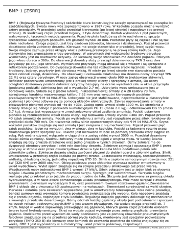 BMP-1 [ZSRR] BMP 1 (Bojewaja Maszyna Piechoty) radzieckie biura konstrukcyjne zaczęły opracowywać na początku lat sześćdziesiątych. Światu nowy wóz zaprezentowano w 1967 roku. W kadłubie pojazdu można wyróżnić cztery przedziały. W przedniej części przedział kierowania (po lewej stronie) i napędowy (po prawej stronie). W środkowej części przedział bojowy, z tyłu desantowy. Kadłub wykonano z płyt pancernych, walcowanych, łączonych metodą spawania. Przednie płyty kadłuba są silnie nachylone co sprzyja rykoszetowi uderzających pocisków. Ich grubość wynosi 30 mm. Pozostałe płyty są cięższe i nie są tak silnie nachylone. Załoga pojazdu jest trzy osobowa (dowódca, kierowca i działonowy). Pojazd przewozi dodatkowo ośmiu żołnierzy desantu. Kierowca ma swoje stanowisko w przedniej, lewej części wozu. Swoje miejsce zajmuje przez okrągły właz z pokrywą przekręcaną na prawą stronę kadłuba. Jego stanowisko jest wyposażone w trzy peryskopy. W warunkach złej widoczności środkowy peryskop wymieniany jest na noktowizor aktywny. Za kierowcą swoje stanowisko ma dowódca pojazdu. Pokrywa jego włazu obraca o 360o. Do obserwacji dowódcy służy przyrząd dzienno-nocny TKN 3 oraz dwa peryskopy po obu jego stronach. Wymienione przyrządy mogą obracać się z włazem i są sprzężone z reflektorem podczerwieni. Do dyspozycji dowódca ma też rozbudowane środki łączności. Przedział środkowy, bojowy, przykryty jest obrotową wieżą. W wieży po lewej stronie swe stanowisko posiada trzeci członek załogi, działonowy. Do obserwacji i celowania działonowy ma dzienno-nocny przyrząd TPN 22 M1 oraz cztery peryskopy. W nocy zasięg obserwacji wynosi około 900 m (noktowizor aktywny). Reflektor podczerwieni umieszczony jest z prawej strony wierzy i sprzężony z armatą. Do oceny odległości działonowy posiada dalmierz optyczny bazujący na ocenie wysokości celu w oknie przyrządu (podstawą podziałki dalmierza jest cel o wysokości 2.7 m)..Uzbrojenie wozu umieszczone jest w obrotowej wieży. Składa się z gładko lufowej, niskociśnieniowej armaty 2 A 28 kalibru 73 mm, sprzężonego karabinu maszynowego kalibru 7.62 mm oraz wyrzutni kierowanych pocisków przeciwpancernych 9 M 14 MALUTKA. Uzbrojenie nie jest stabilizowane, naprowadzanie w płaszczyźnie poziomej i pionowej odbywa się za pomocą układów elektrycznych. Zakres naprowadzania armaty w płaszczyźnie pionowej wynosi: od -4o do +33o. Zasięg ognia wynosi około 1300 m. Do strzelania z armaty stosuje się naboje z pociskami kumulacyjnymi PG 15 (masa 2.6 kg) i odłamkowymi OG 15 (masa 3.7 kg). Armata jest wyposażona w zmechanizowany układ zasilania amunicją. Pociski ustawione pionowo są rozmieszczone wokół kosza wieży. Kąt ładowania armaty wynosi +30o 30'. Pojazd przewozi 40 sztuk amunicji do armaty. Pocisk po wystrzeleniu z armaty jest rozpędzane przez silnik rakietowy do prędkości około 700 m/s. Do niszczenia celów silnie opancerzonych służy ppk 9 M 14 MALUTKA. Szyna wyrzutni pocisków znajduje się nad armatą i jest związana z nią mechanicznie. Pojazd przewozi pięć sztuk pocisków: jeden na wyrzutni, dwa w wierzy, dwa w kadłubie. Pociski są ładowane ręcznie przez działonowego przez specjalny luk. Rakieta jest kierowana w locie za pomocą przewodu który ciągnie za sobą. Ppk można używać wyłącznie w ciągu dnia a zasięg rakiet wynosi 3000 m. Przedział desantowy mieści ośmiu żołnierzy. Siedmiu żołnierzy może prowadzić ogień z wnętrza wozu. W każdej ścianie znajdują się trzy gniazda strzeleckie oraz jedno gniazdo w tylnich drzwiach. Ósmy żołnierz ma do dyspozycji obrotowy peryskop i pełni role dowódcy desantu. Żołnierze zajmują i opuszczają BMP 1 przez pokrywy w stropie oraz przez dwuskrzydłowe drzwi w tyle kadłuba które dodatkowo pełnio role zbiorników paliwa. Żołnierze desantu siedzą zwróceni plecami do siebie i oparci o zbiorniki paliwa. Silnik umieszczono w przedniej części kadłuba po prawej stronie. Zastosowano wolnossącą, sześciocylindrową, widlastą, chłodzoną cieczą, jednostkę napędową UTD 20. Silnik o zapłonie samoczynnym rozwija moc 221 kW (320 KM) przy 2600 obr/min. Obieg powietrza przez chłodnice wymusza eżektor wmontowany w układ wydechowy. Wylot spalin znajduje się na stropie przedziału silnikowego tuż przed wierzą. Współczynnik mocy jednostkowej BMP 1 wynosi 17 kW/t. Silnik połączony jest w jeden blok ze skrzynią biegów i dwoma planetarnymi mechanizmami skrętu. Sprzęgło jest wielotarczowe. Skrzynia biegów realizuje pięć przełożeń przy jeździe do przodu i jedno do tyłu. Skrzynia jest sterowana za pomocą układu hydraulicznego, a w razie awarii pomocniczego układu pneumatycznego. Wóz może skręcać z dwoma promieniami: pierwszym wynoszącym 9 m, oraz promieniem równym rozstawowi gąsienic.Zawieszenie BMP 1 składa się z dwunastu kół zawieszonych na wahaczach. Elementami sprężystymi są wałki skrętne. Pierwsza i ostatnia para zawieszeń wyposażona jest w amortyzatory teleskopowe. Koła nośne posiadają bandaż gumowy oraz wewnątrz komorę powietrzną zwiększającą siłę wyporu. Koła napędowe znajdują się z przodu pojazdu, napinające z tyłu kadłuba. Regulacja napięcia gąsienicy dokonuje się mechanicznie z wewnątrz przedziału desantowego. Górny odcinek każdej gąsienicy ukryty jest pod osłonami i spoczywa na trzech rolkach podtrzymujących.BMP 1 jest wozem pływającym. Na wodzie osiąga prędkość ok. 7 km/h. Napęd w wodzie zapewniają przewijające się gąsienice, których górna część przykryta osłonami tworzy tunel hydrodynamiczny. Skręt na wodzie pojazd wykonuje przez zmianę prędkości przewijania gąsienic. Dodatkowo przed wjazdem do wody podnoszony jest za pomocą siłowników pneumatycznych falochron znajdujący się na przedniej górnej płycie kadłuba, montowany jest specjalny podwyższony peryskop (TNPO 350 B) dl