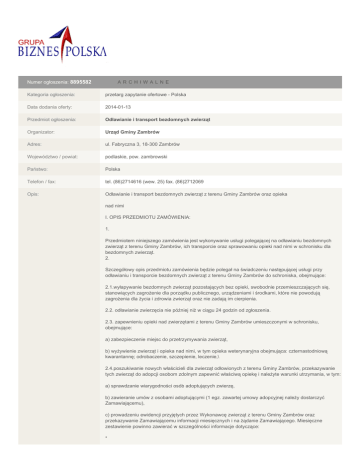 Numer ogłoszenia: 8895582 A RCHI WA L N E Kategoria ogłoszenia: przetarg zapytanie ofertowe - Polska Data dodania oferty: 2014-01-13 Przedmiot ogłoszenia: Odławianie i transport bezdomnych zwierząt Organizator: Urząd Gminy Zambrów Adres: ul. Fabryczna 3, 18-300 Zambrów Województwo / powiat: podlaskie, pow. zambrowski Państwo: Polska Telefon / fax: tel. (86)2714616 (wew. 25) fax. (86)2712069 Opis: Odławianie i transport bezdomnych zwierząt z terenu Gminy Zambrów oraz opieka nad nimi I. OPIS PRZEDMIOTU ZAMÓWIENIA: 1. Przedmiotem niniejszego zamówienia jest wykonywanie usługi polegającej na odławianiu bezdomnych zwierząt z terenu Gminy Zambrów, ich transporcie oraz sprawowaniu opieki nad nimi w schronisku dla bezdomnych zwierząt. 2. Szczegółowy opis przedmiotu zamówienia będzie polegał na świadczeniu następującej usługi przy odławianiu i transporcie bezdomnych zwierząt z terenu Gminy Zambrów do schroniska, obejmujące: 2.1.wyłapywanie bezdomnych zwierząt pozostających bez opieki, swobodnie przemieszczających się, stanowiących zagrożenie dla porządku publicznego, urządzeniami i środkami, które nie powodują zagrożenia dla życia i zdrowia zwierząt oraz nie zadają im cierpienia. 2.2. odławianie zwierzęcia nie później niż w ciągu 24 godzin od zgłoszenia. 2.3. zapewnieniu opieki nad zwierzętami z terenu Gminy Zambrów umieszczonymi w schronisku, obejmujące: a) zabezpieczenie miejsc do przetrzymywania zwierząt, b) wyżywienie zwierząt i opieka nad nimi, w tym opieka weterynaryjna obejmująca: czternastodniową kwarantannę; odrobaczenie, szczepienie, leczenie,\ 2.4.poszukiwanie nowych właścicieli dla zwierząt odłowionych z terenu Gminy Zambrów, przekazywanie tych zwierząt do adopcji osobom zdolnym zapewnić właściwą opiekę i należyte warunki utrzymania, w tym: a) sprawdzanie wiarygodności osób adoptujących zwierzę, b) zawieranie umów z osobami adoptującymi (1 egz. zawartej umowy adopcyjnej należy dostarczyć Zamawiającemu), c) prowadzeniu ewidencji przyjętych przez Wykonawcę zwierząt z terenu Gminy Zambrów oraz przekazywanie Zamawiającemu informacji miesięcznych i na żądanie Zamawiającego. Miesięczne zestawienie powinno zawierać w szczególności informacje dotyczące: * ilości odłowionych oraz przewiezionych do schroniska zwierząt wraz z podaniem dat oraz miejsc ich odłowienia, * ilości zwierząt oddanych do adopcji i poddanych eutanazji. 2.6. współpracy z Zamawiającym w zakresie Programu opieki nad zwierzętami bezdomnymi oraz zapobiegania bezdomności zwierząt na terenie Gminy Zambrów na rok 2014. Miejsce i termin składania ofert: SPOSÓB ZŁOŻENIA OFERTY: 1.Miejsce i termin składania ofert oraz określenie ich formy: Pisemne oferty złożone wg wzoru stanowiącego zał. Nr 1 do niniejszego zaproszenia, winny być złożone do dnia 17.01.2014 r. do godz. 9:00 w siedzibie Urzędu Gminy Zambrów w zamkniętych kopertach opisanych lub opieczętowanych w sposób umożliwiający identyfikację składającego ofertę. Ponadto koperta winna być zaadresowana oraz opisana w następujący sposób: Urząd Gminy Zambrów ul. Fabryczna 3 18-300 Zambrów „Oferta na odławianie i transport bezdomnych zwierząt z terenu Gminy Zambrów oraz opieka nad nimi” Nie otwierać do dnia.17.01.2014r. do godz. 9:15 Wykonawca ma prawo złożyć tylko jedną ofertę. Oferta winna być podpisana oryginalnie przez osobę uprawnioną. 2. Konsekwencje złożenia oferty niezgodnie z ww. wymogami ponosi Wykonawca ( np. potraktowanie oferty jako zwykłej korespondencji i nie dostarczenie jej na miejsce składania ofert w terminie określonym w punkcie 1. Oferty, które wpłyną do Urzędu Gminy Zambrów po terminie określonym w pkt 1 nie będą rozpatrywane. Termin składania: 2014-01-17 Wymagania: I. OPIS PRZEDMIOTU ZAMÓWIENIA: 1. Przedmiotem niniejszego zamówienia jest wykonywanie usługi polegającej na odławianiu bezdomnych zwierząt z terenu Gminy Zambrów, ich transporcie oraz sprawowaniu opieki nad nimi w schronisku dla bezdomnych zwierząt. 2. Szczegółowy opis przedmiotu zamówienia będzie polegał na świadczeniu następującej usługi przy odławianiu i transporcie bezdomnych zwierząt z terenu Gminy Zambrów do schroniska, obejmujące: 2.1.wyłapywanie bezdomnych zwierząt pozostających bez opieki, swobodnie przemieszczających się, stanowiących zagrożenie dla porządku publicznego, urządzeniami i środkami, które nie powodują zagrożenia dla życia i zdrowia zwierząt oraz nie zadają im cierpienia. 2.2. odławianie zwierzęcia nie później niż w ciągu 24 godzin od zgłoszenia. 2.3. zapewnieniu opieki nad zwierzętami z terenu Gminy Zambrów umieszczonymi w schronisku, obejmujące: a) zabezpieczenie miejsc do przetrzymywania zwierząt, b) wyżywienie zwierząt i opieka nad nimi, w tym opieka weterynaryjna obejmująca: czternastodniową kwarantannę; odrobaczenie, szczepienie, leczenie,\ 2.4.poszukiwanie nowych właścicieli dla zwierząt odłowionych z terenu Gminy Zambrów, przekazywanie tych zwierząt do adopcji osobom zdolnym zapewnić właściwą opiekę i należyte warunki utrzymania, w tym: a) sprawdzanie wiarygodności osób adoptujących zwierzę, b) zawieranie umów z osobami adoptującymi (1 egz. zawartej umowy adopcyjnej należy dostarczyć Zamawiającemu), c) prowadzeniu ewidencji przyjętych przez Wykonawcę zwierząt z terenu Gminy Zambrów oraz przekazywanie Zamawiającemu informacji miesięcznych i na żądanie Zamawiającego. Miesięczne zestawienie powinno zawierać w szczególności informacje dotyczące: * ilości odłowionych oraz przewiezionych do schroniska zwierząt wraz z podaniem dat oraz miejsc ich odłowienia, * ilości zwierząt oddanych do adopcji i poddanych eutanazji. 2.6. współpracy z Zamawiającym w zakresie Programu opieki nad zwierzętami bezdomnymi oraz zapobiegania bezdomności zwierząt na terenie Gminy Zambrów na rok 2014. WARUNKI WYMAGANE OD WYKONAWCÓ
