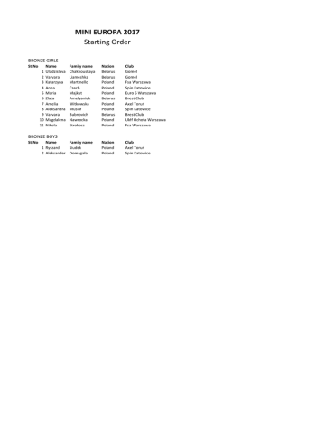 MINIEUROPA2017 StartingOrder BRONZEGIRLS St.No 1 2 3 4 5 6 7 8 9 10 11 Name Uladzislava Varvara Katarzyna Anna Maria Zlata Amelia Aleksandra Varvara Magdalena Nikola Familyname Chakhouskaya Liameshka Martinello Czech Majkut Amelyaniuk Witkowska Musiał Bubnovich Nawrocka Strokosz Nation Belarus Belarus Poland Poland Poland Belarus Poland Poland Belarus Poland Poland Club Gomel Gomel FsaWarszawa SpinKatowice Euro6Warszawa BrestClub AxelToruń SpinKatowice BrestClub UkłfOchotaWarszawa FsaWarszawa Nation Poland Poland Club AxelToruń SpinKatowice BRONZEBOYS St.No Name Familyname 1 Ryszard Siudek 2 Aleksander Domagała MINIEUROPA2017 StartingOrder SILVERGIRLS St.No 1 2 3 4 5 6 7 8 9 10 11 12 13 14 15 16 17 18 19 20 21 22 23 24 25 26 27 28 29 30 31 32 33 34 35 36 37 38 39 40 41 42 43 44 45 46 47 48 49 50 Name Sonia Hanna Karolina Mariya Pola Aleksandra Julia Milena Nadia Veranika Alina Krystyna Zuzanna Małgorzata Daniela Martyna Bożena Amelia Ksenija Weronika SofijaPaula Palina Viktoriya Sofie Karolina Patrycja Maria Sofiya Aurlia Hanna Zofia Dorota Agne Julia Zuzanna Julia Karyna Natalia Jagna Weronika Aleksandra Sofie Marcelina Marharyta Wiktoria Gabija Alina Alesandra Emilia Angelika Familyname Simaniuksztys Udavenka Witt Zahorskaya Kwiatkowska Łada Zukowska Nosel Dworzycka Simanovich Halauko Jaworska Dąbrowska Grotska Nisnevich Rutkowska Szymańska Szymańska Morozova Ferlin Rinke Shcharbakova Dytsevich Malkova Mikulska Nowińska Kędziora Sadounikava Antczak Kalinka Bochenek Konieczna Ivanovaite Maślak Nowak Ostojska Roslikava Naryshkina Maślak Piotrkowska Stryjewska Hermann Olender Yermalinskaya Wiśniewska Pociute Balakhonauva Mayer Szwechowicz Khanenia Nation Club Poland GksStoczniowiecGdańsk Belarus Gomel Poland GksStoczniowiecGdańsk Belarus Gomel Poland UkłfOchotaWarszawa Poland GksStoczniowiecGdańsk Poland MkłŁódź Poland GksStoczniowiecGdańsk Poland Euro6Warszawa Belarus Gomel Belarus Gomel Poland KłfLajkonikKraków Poland SpinKatowice Poland SpinKatowice Belarus BrestClub Poland AxelToruń Poland PiruetteOpole Poland UkłfOchotaWarszawa Lithuania BaltuAiniai Poland PiruetteOpole Latvia Slidotprieks Belarus Gomel Belarus Pruzhany CzechRepublic KrasobruslarskyKlubPardubice Poland PiruetteOpole Poland MkłŁódź Poland AxelToruń Belarus Gomel Poland MkłŁódź Belarus BrestClub Poland FsaWarszawa Poland GksStoczniowiecGdańsk Lithuania BaltuAiniai Poland PiruetteOpole Poland AxelToruń Poland Euro6Warszawa Belarus Gomel Russia Pirouette Poland PiruetteOpole Poland UkłfOchotaWarszawa Poland GksStoczniowiecGdańsk Poland FsaWarszawa Poland GksStoczniowiecGdańsk Belarus Gomel Poland MkłŁódź Lithuania BaltuAiniai Belarus Gomel Russia Pirouette Poland AxelToruń Belarus Gomel Familyname Kroo Janicki Szymański Klimin Osiński Klimuk Nation Latvia Poland Poland Poland Poland Belarus SILVERBOYS St.No 1 2 3 4 5 6 Name Mihaels Jakub Antoni Pavel Maciej Matvei Club Slidotprieks GksStoczniowiecGdańsk UkłfOchotaWarszawa MkłŁódź AxelToruń BrestClub MINIEUROPA2017 StartingOrder GOLDGIRLS St.No 1 2 3 4 5 6 7 8 9 10 11 12 13 14 15 16 17 18 19 20 21 22 23 24 25 26 27 28 29 30 31 32 33 34 Name Matylda Yulya Anna Ulyana Natalia Natalia Clara Yana Zlata Natalia Sylwia Linda Jagoda Barbara Nina Lizaveta Barbara Malina Marta Palina Karolina Maja Iwona Julia Maria Zofia Julia Megija Julia Minny Nadia Alicja Lukrecija Zuzanna Familyname Stanaszek Biazdolnaya Naryshkina Khadarovich Rosa Kołodziejczyk Lund Dziadkova Halaveychuk Raczkowska Pielak Dzerve Klisowska Martinello Wiśniewska Balonikava Gertruda Ramashova Pórecka Fedchanka Warec Krzysiak Drelich Polniuk Jankowska Grzegorzewska Raclaf Smate Gierszewska Persson Główczewska Rejment Eidukeviciute Wnuk Nation Poland Belarus Russia Belarus Poland Poland Danmark Belarus Belarus Poland Poland Latvia Poland Poland Poland Belarus Poland Belarus Poland Belarus Poland Poland Poland Poland Poland Poland Poland Latvia Poland Sweden Poland Poland Lithuania Poland Club Euro6Warszawa Gomel Pirouette Pruzhany Euro6Warszawa SzóstkaElbląg HerningSkojtelobForening Gomel Pruzhany PiruetteOpole Euro6Warszawa Slidotprieks PiruetteOpole FsaWarszawa FsaWarszawa Gomel FsaWarszawa Pruzhany GksStoczniowiecGdańsk Gomel Euro6Warszawa GksStoczniowiecGdańsk PiruetteOpole Euro6Warszawa SzóstkaElbląg MkłŁódź GksStoczniowiecGdańsk Slidotprieks SzóstkaElbląg MariestadsKonstakningsklubb GksStoczniowiecGdańsk AxelToruń BaltuAiniai SzóstkaElbląg Familyname Hebda Pauliczek Nation Poland Poland Club FsaWarszawa KłfLajkonikKraków GOLDBOYS St.No Name 1 Jakub 2 Mikołaj MINIEUROPA2017 StartingOrder NOVICEADVANCEDGIRLS St.No 1 2 3 4 5 6 7 8 9 10 11 12 13 14 15 16 17 18 19 20 21 22 23 24 25 26 27 28 29 30 31 32 33 34 35 36 37 38 39 40 41 42 43 44 45 46 47 48 49 50 51 52 53 Name Paula Paulina Marta SelmaLykke Emma Aleksandra Agne Julia Dinara Paulina MartaKrista Gabriele Paulina Martyna Emilia Antonina Keita Aleksandra Ebba Maja Caroline Tatiana Ellinor Sonia Line Ellen Pernilla Natalia Olga Hanna Polina Angelika Karina Mikalay Lauriane Kamila Maria Clara Bella Olivia Aleksandra Yulyana Marta Oliwia Sarah Gabriela Amelia Lidia Kseniya Gabriela Katryna Salome Kamila Familyname Nation Piechowicz Poland Markowicz Poland Jówko Poland Larsen Danmark Elmgren Sweden Vivien France Steponaviciute Lithuania Krzyżanowska Poland Rudaleviciute Lithuania Gucwa Poland Zitare Latvia Valentinaviciute Lithuania Hryniewicz Poland Pałubicka Poland Halman Poland Adamowicz Poland Maizite Latvia Antonik Poland Fredriksson Sweden Sokołowska Poland Sandberd Sweden Kasprzyk Poland Eklund Sweden Salminoja Sweden GunderagerJensenDanmark Salmonsson Sweden Bergman Sweden Lerka Poland Wróblewska Poland Mikulich Belarus Grigoreva Russia Knap Poland Golant Russia Kazloy Belarus Pellegris France Chmielewska Poland Kudła Poland Rogestam Sweden Engelson Sweden Modig Sweden Wiśniarowska Poland Lashkevich Belarus Sundelin Sweden Strokosz Poland Rosvall Sweden Pauliczek Pol