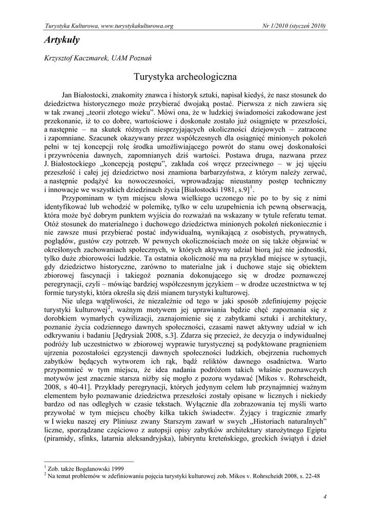 Turystyka Kulturowa, www.turystykakulturowa.org Nr 1/2010 (styczeń 2010) Artykuły Krzysztof Kaczmarek, UAM Poznań Turystyka archeologiczna Jan Białostocki, znakomity znawca i historyk sztuki, napisał kiedyś, że nasz stosunek do dziedzictwa historycznego może przybierać dwojaką postać. Pierwsza z nich zawiera się w tak zwanej „teorii złotego wieku”. Mówi ona, że w ludzkiej świadomości zakodowane jest przekonanie, iż to co dobre, wartościowe i doskonałe zostało już osiągnięte w przeszłości, a następnie – na skutek różnych niesprzyjających okoliczności dziejowych – zatracone i zapomniane. Szacunek okazywany przez współczesnych dla osiągnięć minionych pokoleń pełni w tej koncepcji rolę środka umożliwiającego powrót do stanu owej doskonałości i przywrócenia dawnych, zapomnianych dziś wartości. Postawa druga, nazwana przez J. Białostockiego „koncepcją postępu”, zakłada coś wręcz przeciwnego – w jej ujęciu przeszłość i całej jej dziedzictwo nosi znamiona barbarzyństwa, z którym należy zerwać, a następnie podążyć ku nowoczesności, wprowadzając nieustanny postęp techniczny i innowacje we wszystkich dziedzinach życia [Białostocki 1981, s.9] 1 . Przypominam w tym miejscu słowa wielkiego uczonego nie po to by się z nimi identyfikować lub wchodzić w polemikę, tylko w celu uzupełnienia ich pewną obserwacją, która może być dobrym punktem wyjścia do rozważań na wskazany w tytule referatu temat. Otóż stosunek do materialnego i duchowego dziedzictwa minionych pokoleń niekoniecznie i nie zawsze musi przybierać postać indywidualną, wynikającą z osobistych, prywatnych, poglądów, gustów czy potrzeb. W pewnych okolicznościach może on się także objawiać w określonych zachowaniach społecznych, w których aktywny udział biorą już nie jednostki, tylko duże zbiorowości ludzkie. Ta ostatnia okoliczność ma na przykład miejsce w sytuacji, gdy dziedzictwo historyczne, zarówno to materialne jak i duchowe staje się obiektem zbiorowej fascynacji i takiegoż poznania dokonującego się w drodze poznawczej peregrynacji, czyli – mówiąc bardziej współczesnym językiem – w drodze uczestnictwa w tej formie turystyki, która określa się dziś mianem turystyki kulturowej. Nie ulega wątpliwości, że niezależnie od tego w jaki sposób zdefiniujemy pojęcie turystyki kulturowej 2 , ważnym motywem jej uprawiania będzie chęć zapoznania się z dorobkiem wymarłych cywilizacji, zaznajomienie się z zabytkami sztuki i architektury, poznanie życia codziennego dawnych społeczności, czasami nawet aktywny udział w ich odkrywaniu i badaniu [Jędrysiak 2008, s.3]. Zdarza się przecież, że decyzja o indywidualnej podróży lub uczestnictwo w zbiorowej wyprawie turystycznej są podyktowane pragnieniem ujrzenia pozostałości egzystencji dawnych społeczności ludzkich, obejrzenia ruchomych zabytków będących wytworem ich rąk, bądź reliktów dawnego osadnictwa. Warto przypomnieć w tym miejscu, że idea nadania podróżom takich właśnie poznawczych motywów jest znacznie starsza niżby się mogło z pozoru wydawać [Mikos v. Rohrscheidt, 2008, s 40-41]. Przykłady peregrynacji, których jedynym celem lub przynajmniej ważnym elementem było poznawanie dziedzictwa przeszłości zostały opisane w licznych i niekiedy bardzo od nas odległych w czasie tekstach. Wyłącznie dla zobrazowania tej myśli warto przywołać w tym miejscu choćby kilka takich świadectw. Żyjący i tragicznie zmarły w I wieku naszej ery Pliniusz zwany Starszym zawarł w swych „Historiach naturalnych” liczne, sporządzane częściowo z autopsji opisy zabytków architektury starożytnego Egiptu (piramidy, sfinks, latarnia aleksandryjska), labiryntu kreteńskiego, greckich świątyń i dzieł 1 2 Zob. także Bogdanowski 1999 Na temat problemów w zdefiniowaniu pojęcia turystyki kulturowej zob. Mikos v. Rohrscheidt 2008, s. 22-48 4 Turystyka Kulturowa, www.turystykakulturowa.org Nr 1/2010 (styczeń 2010) 3 architektów rzymskich . Piszący kilkadziesiąt lat później grecki geograf Pauzaniasz pozostawił po sobie imponujący, składający się z 10 ksiąg, przewodnik po dziejach i zabytkach starożytnej Hellady 4 . Ciekawość otaczającego świata, dążenie do jego poznawania i odkrywania materialnych śladów życia z minionych epok nie była także obca ludziom średniowiecza. Wilhelm z Rubruk, dominikanin, uczestnik wyprawy, która w połowie XIII wieku dotarła do Mongolii, bystry obserwator i człowiek obdarzony darem wielkiego zainteresowania otaczającym go światem opisuje w swej relacji, jak to po drodze do wielkiego chana on i jego towarzysze mogli podziwiać pozostałości miast i umocnień wystawionych w dawnych wiekach przez Aleksandra Wielkiego w celu powstrzymania hord barbarzyńców nadciągających ku Europie z Azji 5 . Obszerną relację z podróży pozostawił także żyjący 200 lat później Mikołaj Popplau, mieszczanin wrocławski, nobilitowany na rycerza przez samego cesarza Fryderyka III. Pod koniec XV wieku odbył on długą podróż przez całą Europę i dotarł aż do sanktuarium św. Jakuba w Compostelli. Stamtąd Mikołaj odbył specjalną wycieczkę do położonej na atlantyckim wybrzeżu Finisterre, tylko po to, by obejrzeć tam pozostałości statku, którym rzekomo miała ongiś podróżować sama Najświętsza Maryja Panna 6 . Swoje wrażenia z długich, trwających mniej więcej ćwierć wieku wędrówek opisał również arabski podróżnik Ibn Battuta. Ten urodzony na początku XIV wieku w Tangerze gorliwy muzułmanin wyruszył w 1325 roku w tradycyjną pielgrzymkę do Mekki. Po odwiedzeniu świętych miejsc islamu podróżował przez następne 25 lat, docierając do południowej Rusi, Persji, Indii, Cejlonu, Sardynii i Hiszpanii. Owszem, wiele pozostawionych przezeń opisów starożytnych ośrodków i ich zabytków może dziś razić naiwnością wyobrażeń autora o okolic