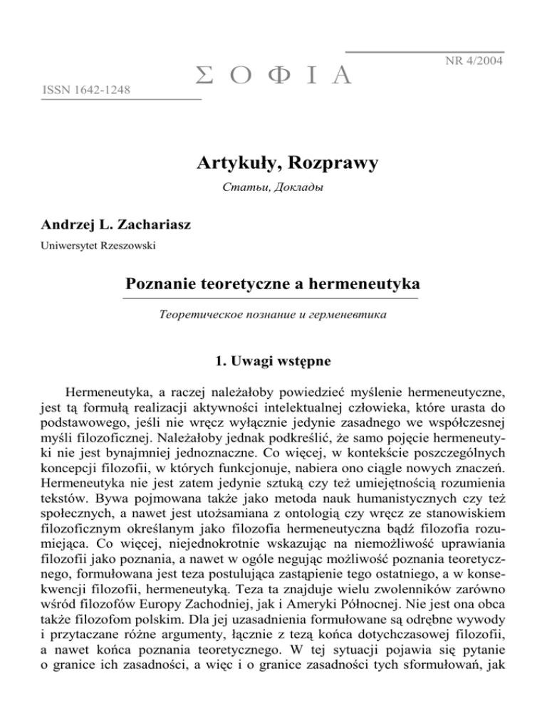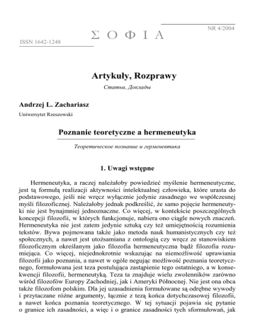 Poznanie teoretyczne a hermeneutyka Σ Ο Φ Ι Α 27 NR 4/2004 ISSN 1642-1248 Artykuły, Rozprawy Статьи, Доклады Andrzej L. Zachariasz Uniwersytet Rzeszowski Poznanie teoretyczne a hermeneutyka Теоретическое познание и герменевтика 1. Uwagi wstępne Hermeneutyka, a raczej naleŜałoby powiedzieć myślenie hermeneutyczne, jest tą formułą realizacji aktywności intelektualnej człowieka, które urasta do podstawowego, jeśli nie wręcz wyłącznie jedynie zasadnego we współczesnej myśli filozoficznej. NaleŜałoby jednak podkreślić, Ŝe samo pojęcie hermeneutyki nie jest bynajmniej jednoznaczne. Co więcej, w kontekście poszczególnych koncepcji filozofii, w których funkcjonuje, nabiera ono ciągle nowych znaczeń. Hermeneutyka nie jest zatem jedynie sztuką czy teŜ umiejętnością rozumienia tekstów. Bywa pojmowana takŜe jako metoda nauk humanistycznych czy teŜ społecznych, a nawet jest utoŜsamiana z ontologią czy wręcz ze stanowiskiem filozoficznym określanym jako filozofia hermeneutyczna bądź filozofia rozumiejąca. Co więcej, niejednokrotnie wskazując na niemoŜliwość uprawiania filozofii jako poznania, a nawet w ogóle negując moŜliwość poznania teoretycznego, formułowana jest teza postulująca zastąpienie tego ostatniego, a w konsekwencji filozofii, hermeneutyką. Teza ta znajduje wielu zwolenników zarówno wśród filozofów Europy Zachodniej, jak i Ameryki Północnej. Nie jest ona obca takŜe filozofom polskim. Dla jej uzasadnienia formułowane są odrębne wywody i przytaczane róŜne argumenty, łącznie z tezą końca dotychczasowej filozofii, a nawet końca poznania teoretycznego. W tej sytuacji pojawia się pytanie o granice ich zasadności, a więc i o granice zasadności tych sformułowań, jak 28 Andrzej L. Zachariasz i zasadność formułowanych na ich rzecz argumentów. W tych uwagach ograniczę się jednak jedynie do analizy samego pojęcia rozumienia, a więc hermeneutyki jako umiejętności rozumienia w kontekście filozofii jako poznania teoretycznego. Przedmiotem uwag nie będą zatem poszczególne stanowiska tzw. filozofii hermeneutycznej, a jedynie pytanie o to: czy odwołanie się do rozumienia oznacza negację czy teŜ raczej moŜe być i jest warunkiem filozofii jako poznania teoretycznego? Hermeneutyka jest tu zatem rozumiana jako operacje rozumienia i interpretacji, a więc jako praktyka badawcza, a nie jako teoria. Są to zatem pytania o relacje, jakie zachodzą między wyróŜnionymi tu pojęciami i odpowiadającymi im dziedzinami, a mianowicie: poznaniem teoretycznym, czy teŜ nawet samym poznaniem, a filozofią, przede wszystkim zaś między tymi dziedzinami a hermeneutyką. Zdając sobie sprawę z wielości wiązanych z samymi tymi pojęciami znaczeń, nie naleŜy po tego rodzaju objaśnieniach spodziewać się jakiegoś jednoznacznego rozstrzygnięcia pojawiających się tu kwestii. Tego rodzaju wypowiedź naleŜy uznać co najwyŜej za jedną z kolejnych w dyskusji nad statusem samej filozofii i relacjami, jakie zachodzą czy teŜ mogą zachodzić między filozofią a hermeneutyką. Niemniej, aby móc sformułować jakiekolwiek odpowiedzi, naleŜałoby najpierw podjąć próbę choćby naszkicowania tradycji i statusu tych dwóch sposobów myślenia, aby następnie rozwaŜyć ich relacje do tego, co określam tu poznaniem teoretycznym. Przejdę zatem w pierwszej kolejności do określenia myślenia hermeneutycznego. 2. Dwie tradycje: myślenie hermeneutyczne i poznanie teoretyczne Jeśli problematyka poznania zajmowała od samego początku poczesne miejsce, to naleŜałoby zauwaŜyć, iŜ hermeneutyka w dziejach myślenia filozoficznego pojawiła się stosunkowo późno. Właściwie moŜna by stwierdzić, Ŝe przez wiele stuleci między tym, co tradycyjnie określano pojęciem hermeneutyka, a filozofią jako myśleniem teoretycznym, zachodziła zasadnicza róŜnica. Hermeneutyka była pojmowana jako odrębny, a nawet konkurencyjny wobec poznania teoretycznego sposób myślenia. Kontakty i zbieŜności między tymi dziedzinami miały raczej charakter okazjonalny. Do takich zbieŜności przypadkowych naleŜy niewątpliwie uŜycie na określenie jednej z rozpraw Arystotelesa pojęcia hermeneutyka1. Pomijając juŜ okoliczność, iŜ samo to pojęcie nie zostało wprowadzone przez Arystotelesa, naleŜałoby podkreślić, Ŝe współczesne 1 Kazimierz Leśniak, tłumacz i autor wstępu do polskiego wydania tej rozprawy, pisze: „Tytuł tego pisma nie pochodzi od Arystotelesa ani teŜ w Ŝadnym z zachowanych dzieł nie ma o nim wzmianki” TenŜe, Wstęp, Hermeneutyka, [w:] Arystoteles, Kategorie i Hermeneutyka z dodatkiem Isagogi Porfiriusza, Warszawa 1975, s. XVI. Poznanie teoretyczne a hermeneutyka 29 tzw. myślenie hermeneutyczne nie wydaje się takŜe nawiązywać to treści tego pisma ani teŜ poczynionych tam ustaleń. W kontekście analiz filozoficznych moŜna by wymienić takŜe znane zdanie Kanta, które tenŜe wypowiedział pod adresem filozofii Platona: „Ŝe nie jest niczym niezwykłym, zarówno w prostej rozmowie, jak i w pismach, dzięki porównaniu myśli, które pewien autor wypowiada o swoim przedmiocie, rozumieć go nawet lepiej, niŜ on sam siebie rozumiał, nie określiwszy dostatecznie swego pojęcia i wskutek tego czasami mówiąc, a takŜe myśląc coś wbrew własnej intencji”2. Pojęcia hermeneutyka, które wydaje się być szczególnie bliskie współczesnemu jego rozumieniu, w odniesieniu do myśli Platona, uŜywał równieŜ F. D. E. Schleiermacher. Ten to bowiem filozof odwoływał się do hermeneutyki jako narzędzia (metody) pomocnego w tłumaczeniu na język niemiecki dzieł myśliciela staroŜytnego. Czym zatem była hermeneutyka w swych bogatych, bowiem sięgających czasów myślenia przedfilozoficznego, dziejach? Podejmując próbę jej określenia, na tyle na ile pozwalają ramy tej publikacji, naleŜałoby zauwaŜyć, Ŝe w swoich po