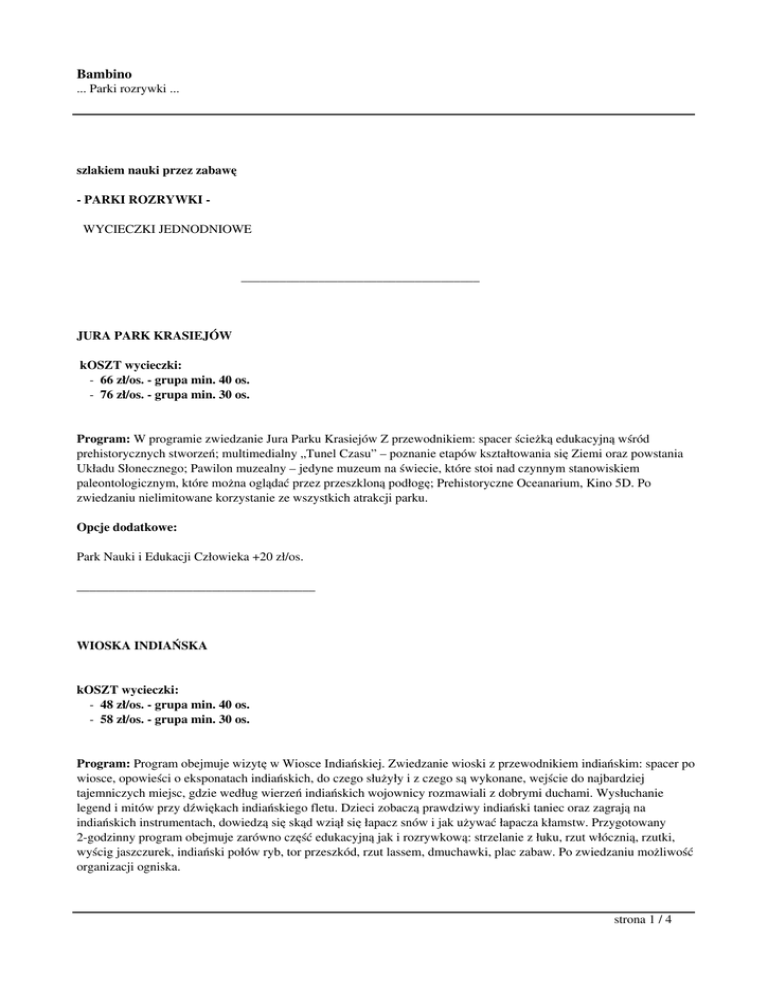 Bambino ... Parki rozrywki ... szlakiem nauki przez zabawę - PARKI ROZRYWKI WYCIECZKI JEDNODNIOWE _____________________________________ JURA PARK KRASIEJÓW kOSZT wycieczki: - 66 zł/os. - grupa min. 40 os. - 76 zł/os. - grupa min. 30 os. Program: W programie zwiedzanie Jura Parku Krasiejów Z przewodnikiem: spacer ścieżką edukacyjną wśród prehistorycznych stworzeń; multimedialny „Tunel Czasu” – poznanie etapów kształtowania się Ziemi oraz powstania Układu Słonecznego; Pawilon muzealny – jedyne muzeum na świecie, które stoi nad czynnym stanowiskiem paleontologicznym, które można oglądać przez przeszkloną podłogę; Prehistoryczne Oceanarium, Kino 5D. Po zwiedzaniu nielimitowane korzystanie ze wszystkich atrakcji parku. Opcje dodatkowe: Park Nauki i Edukacji Człowieka +20 zł/os. _____________________________________ WIOSKA INDIAŃSKA kOSZT wycieczki: - 48 zł/os. - grupa min. 40 os. - 58 zł/os. - grupa min. 30 os. Program: Program obejmuje wizytę w Wiosce Indiańskiej. Zwiedzanie wioski z przewodnikiem indiańskim: spacer po wiosce, opowieści o eksponatach indiańskich, do czego służyły i z czego są wykonane, wejście do najbardziej tajemniczych miejsc, gdzie według wierzeń indiańskich wojownicy rozmawiali z dobrymi duchami. Wysłuchanie legend i mitów przy dźwiękach indiańskiego fletu. Dzieci zobaczą prawdziwy indiański taniec oraz zagrają na indiańskich instrumentach, dowiedzą się skąd wziął się łapacz snów i jak używać łapacza kłamstw. Przygotowany 2-godzinny program obejmuje zarówno część edukacyjną jak i rozrywkową: strzelanie z łuku, rzut włócznią, rzutki, wyścig jaszczurek, indiański połów ryb, tor przeszkód, rzut lassem, dmuchawki, plac zabaw. Po zwiedzaniu możliwość organizacji ogniska. strona 1 / 4 Bambino ... Parki rozrywki ... Opcje dodatkowe: Ognisko z kiełbaskami +8 zł/os. _____________________________________ dream park ochaby kOSZT wycieczki: - 64/72 zł/os. - grupa min. 40 os. - 74/82 zł/os. - grupa min. 30 os. Program: Program obejmuje zwiedzanie Dream Parku w Ochabach. To park rozrywki i edukacji, w którego skład wchodzi Park Dinozaurów i Park Miniatur. Podczas zwiedzania z przewodnikiem dzieci dowiedzą się o dziejach naszej planety, życiu i przyczynach wyginięcia dinozaurów oraz zobaczą najciekawsze budowle z całego świata i historie z nimi związane. Po zwiedzaniu nielimitowane korzystanie z atrakcji parku: Oceanarium Prehistoryczne, Dom do góry nogami, wystawa krokodyli, wystawa lemurów i zwierząt tropikalnych, Kino 2d, Kino 6d, Park Linowy, Eurobungee, Fglopark i wieleinnych atrakcji. Powrót w godzinach popołudniowych. ATRAKCJE PAKIETU MAX DREAM: Przewodnik, Park Miniatur, Park Dinozaurów, Dom do góry nogami, Oceanarium prehistoryczne, wystawa krokodyli, wystawa lemurów, wystawa zwierząt tropikalnych, Park Linowy, Eurobungee, Kino 2D, Kino 6D, Place zabaw, Dmuchańce, Figlopark - Małpi gaj dla najmłodszych. _____________________________________ miasteczko twinpigs kOSZT wycieczki: - 68 zł/os. - grupa min. 40 os. - 78 zł/os. - grupa min. 30 os. Program: W programie wycieczki wizyta w Miasteczku Twinpigs: zwiedzanie miasteczka z przewodnikiem; udział w licznych pokazach: iluzjonista – pokaz iluzji i sztuczek, inscenizacja napadu na bank, gorączka złota, pojedynek rewolwerowców; nielimitowane korzystanie ze wszystkich atrakcji parku: Tajemnicze Podziemie – przejażdżka wgłąb opuszczonej kopalni, Planetarium – Kula Parowa – Kino 3D, Kino 5D, Strzelnica Desperados i Texas, Karuzela Trapera, Karuzela Whisky, Jolly Jumpers, Koło młyńskie, Family Coaster; plac zręcznościowy, Wioska Indiańska. _____________________________________ strona 2 / 4 Bambino ... Parki rozrywki ... dinozatorland kOSZT wycieczki: - 55/65/72 zł/os. - grupa min. 40 os. - 65/75/82 zł/os. - grupa min. 30 os. Program: Zwiedzanie Parku Ruchomych Dinozaurów z przewodnikiem ścieżką edukacyjną wśród naturalnej wielkości dinozaurów. Kolejnym punktem zwiedzania jest muzeum szkieletów i skamieniałości. Po zwiedzaniu zabawa na terenie lunaparku – nielimitowany pobyt oraz seans w Kinie 5D. Opcjonalnie zwiedzanie Parku Mitologicznego, Parku Owadów lub Parku Bajek i Wodnych Stworzeń. _____________________________________ energylandia kOSZT wycieczki: - 65/85 zł/os. - grupa min. 40 os. - 75/95 zł/os. - grupa min. 30 os. Program: Pobyt w pierwszym Parku Rozrywki w Polsce z ponad 30 nowoczesnymi atrakcjami dla dzieci w każdej grupie wiekowej. _____________________________________ gród w byczynie kOSZT wycieczki: - 79 zł/os. - grupa min. 40 os. - 90 zł/os. - grupa min. 30 os. Program: Średniowieczna przygoda. W programie pobyt w średniowiecznym grodzie rycerskim z warsztatami: łucznictwo, tkactwo, garncarstwo, czerpanie papieru, pisanie gęsim piórem, wyrób świec, wybijanie monet oraz atrakcjami takimi jak: rzut toporem, włócznią i nożem, rzut do jaja, średniowieczne kręgle, oraz udział w pokazach walk rycerskich i katowskich. Dodatkowo możliwość organizacji ogniska. Możliwa wycieczka 2-dniowa: noclegi w stylizowanych średniowiecznych komnatach, posiłki w karczmie rycerskiej, warsztaty nocne, noc z duchami, szukanie skarbu Templariuszy. _____________________________________ park miniatur / park średniowieczny strona 3 / 4 Bambino ... Parki rozrywki ... kOSZT wycieczki: park miniatur + wadowice: - 69 zł/os. - grupa min. 40 os. - 79 zł/os. - grupa min. 30 os. park miniatur + średniowieczna warownia + wadowice: - 74 zł/os. - grupa min. 40 os. - 84 zł/os. - grupa min. 30 os. Program: Program wycieczki obejmuje zwiedzanie: Wadowice: Dom Rodzinny Ojca Świętego, Bazylika NMP, spacer po rynku, możliwość zakupu „papieskich kremówek”. Park Miniatur „Świat Marzeń”: Zwiedzanie z przewodnikiem. To miejsce spotkania z modelami najsławniejszych cudów architektonicznych z całego świata, takimi jak: Świątynia Akropolu, Colosseum, Krzywa Wież