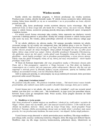 Wiedza ucznia Każda szkoła ma określony program, w którym przekazuje się wiedzę uczniom. Przekazywana wiedza, określa kierunki nauki. W szkoła Jezusa uczniowie także zdobywają wiedzę, którą Jezus określił: ja się na to narodziłem i na to przyszedłem na świat, abyście poznali prawdę. Prawda, jaką Jezus przekazuje swoim uczniom dotyczy życia wiecznego. Bóg tak umiłował świat, że Syna swego dał, aby każdy kto w Niego wierzy, ma życie wieczne. Dzięki nauce w szkole Jezusa, uczniowie poznają prawdę dotyczącą niektórych spraw związanych z ludzkim życiem. Co więcej uczeń Jezusa otrzymuje taką wiedzę, która zapewnia mu duchowy rozwój i pozwala z nadzieją patrzeć w przyszłość. Każdy kto zostaje uczniem w szkole Jezusa przez całe życie się uczy. Bo wiedza, jakiej potrzebuje człowiek od Jezusa dotyczy całego jego życia. W tej szkole zdobywa się zdrową naukę. Od samego początku istnienia tej szkoły, zwracano uwagę, by tej wiedzy nie zastępować inną. Jak pięknie pisze o tym św. Paweł w liście do Galatów: Nadziwić się nie mogę, że od Tego, który was łaską Chrystusa powołał, tak szybko chcecie przejść do innej Ewangelii. Innej jednak Ewangelii nie ma: są tylko jacyś ludzie, którzy sieją wśród was zamęt i którzy chcieliby przekręcić Ewangelię Chrystusową. Ale gdybyśmy nawet my lub anioł z nieba głosił wam Ewangelię różną od tej, którą wam głosiliśmy - niech będzie przeklęty! Już to przedtem powiedzieliśmy, a teraz jeszcze mówię: Gdyby wam kto głosił Ewangelię różną od tej, którą [od nas] otrzymaliście - niech będzie przeklęty! /Gal.1.6-9/ W liście do Kolosan dopowiada: Jak więc przejęliście naukę o Chrystusie Jezusie jako Panu, tak w Nim postępujcie: zapuśćcie w Niego korzenie i na Nim dalej się budujcie, i umacniajcie się w wierze, jak was nauczono, pełni wdzięczności. Baczcie, aby kto was nie zagarnął w niewolę przez tę filozofię będącą czczym oszustwem, opartą na ludzkiej tylko tradycji, na żywiołach świata, a nie na Chrystusie./Kol.2.6-8/ Jeśli ta nauka jest prawdą, to zatrzymajmy się na jej niektórych treściach, które powinien przyswoić sobie uczeń Chrystusa. 1. „Solą ziemi i światłem świata” Wy jesteście solą dla ziemi... Wy jesteście światłem świata…. Tak niech świeci wasze światło przed ludźmi, aby widzieli wasze dobre uczynki i chwalili Ojca waszego, który jest w niebie. Uczeń Jezusa jest w tej szkole, aby stać się „solą i światłem”, czyli ma wyrazić przed ludźmi, tym kim jest i co sobie ceni… Ma świadomość, że jego życie jest potrzebne innym, bowiem Jezus czyni go narzędziem łaski. Przez ucznia, Jezus pragnie docierać do ludzi i przyciągać ich ku Sobie. 2. Modlitwa w życiu ucznia Gdy Jezus przebywał w jakimś miejscu na modlitwie i skończył ją, rzekł jeden z uczniów do Niego: «Panie, naucz nas się modlić, jak i Jan nauczył swoich uczniów». A On rzekł do nich: «Kiedy się modlicie, mówcie: Ojcze, niech się święci Twoje imię; niech przyjdzie Twoje królestwo! Naszego chleba powszedniego dawaj nam na każdy dzień i przebacz nam nasze grzechy, bo i my przebaczamy każdemu, kto nam zawini; i nie dopuść, byśmy ulegli pokusie». Uczeń Jezusa swoją obecność w szkole potwierdza przez modlitwę. Dla niego modlitwa – jest relacją osób, szczerą i serdeczną rozmową z Bogiem, który dla niego jest dobrym Ojcem. Modlitwa staje się dla niego życiową koniecznością, pokarmem duszy, lekarstwem na 1 choroby. Modlitwa przybiera różne formy: uwielbienia, pochwalna, dziękczynienia, wstawiennicza, prosząca, przebłagalna. Modlitwie towarzyszy zaufanie i zawierzenie Bogu. 3. Etyka ucznia Słyszeliście, że powiedziano: Oko za oko i ząb za ząb! A Ja wam powiadam: Nie stawiajcie oporu złemu…. Słyszeliście, że powiedziano: Będziesz miłował swego bliźniego, a nieprzyjaciela swego będziesz nienawidził. A Ja wam powiadam: Miłujcie waszych nieprzyjaciół i módlcie się za tych, którzy was prześladują; tak będziecie synami Ojca waszego, który jest w niebie; ponieważ On sprawia, że słońce Jego wschodzi nad złymi i nad dobrymi, i On zsyła deszcz na sprawiedliwych i niesprawiedliwych…Bądźcie więc wy doskonali, jak doskonały jest Ojciec wasz niebieski. Uczeń Jezusa nie stosuje przemocy, ale ponad wszystko ceni sobie prawo miłość. Dobro widzi w przebaczeniu i miłowaniu tych, którzy źle mu czynią. Szuka doskonałości. Sens takiego postępowania znajduje w Mistrzu 4. Uczeń wobec choroby Stamtąd podążył Jezus dalej i przyszedł nad Jezioro Galilejskie. Wszedł na górę i tam siedział. I przyszły do Niego wielkie tłumy, mając z sobą chromych, ułomnych, niewidomych, niemych i wielu innych, i położyli ich u nóg Jego, a On ich uzdrowił. Tłumy zdumiewały się widząc, że niemi mówią, ułomni są zdrowi, chromi chodzą, niewidomi widzą. I wielbiły Boga Izraela. Uczeń Jezusa ma nauczyć się w szkole Jezusa patrzenia na chorobę i przyjmowania cierpień. Jest on świadomy, że wszelkie cierpienie samo w sobie jest złem. Chrystus uwalniał ludzi z chorób. To, co uświęca i zbawia ludzi cierpiących, to ich zachowanie i przeżywanie cierpienia. Uczeń Chrystusa wie, że ma być zatroskany o bliźnich znajdujących się w potrzebie. Są ludzie chorzy na ciele i na duszy. Niewidomi, głusi, niemi, chromi i ułomni – to objawy ludzkich chorób. Chorymi uczeń Jezusa się interesuje i udziela im pomocy na jaką go stać 5. Uczeń wobec śmierci A oto przyszedł człowiek, imieniem Jair, który był przełożonym synagogi. Upadł Jezusowi do nóg i prosił Go, żeby zaszedł do jego domu. Miał bowiem córkę jedynaczkę, liczącą około dwunastu lat, która była bliska śmierci…. Gdy Jezus tam szedł, tłumy napierały na Niego. A pewna kobieta od dwunastu lat cierpiała na upływ krwi; całe swe mienie wydała na lekarzy, a żade