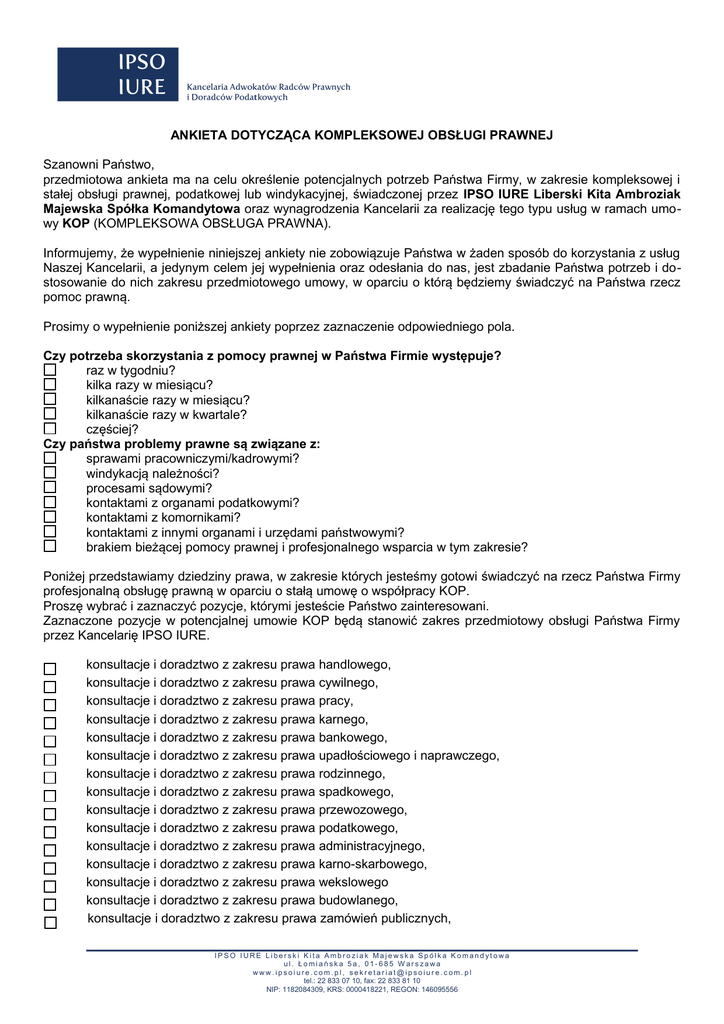 ANKIETA DOTYCZĄCA KOMPLEKSOWEJ OBSŁUGI PRAWNEJ Szanowni Państwo, przedmiotowa ankieta ma na celu określenie potencjalnych potrzeb Państwa Firmy, w zakresie kompleksowej i stałej obsługi prawnej, podatkowej lub windykacyjnej, świadczonej przez IPSO IURE Liberski Kita Ambroziak Majewska Spółka Komandytowa oraz wynagrodzenia Kancelarii za realizację tego typu usług w ramach umowy KOP (KOMPLEKSOWA OBSŁUGA PRAWNA). Informujemy, że wypełnienie niniejszej ankiety nie zobowiązuje Państwa w żaden sposób do korzystania z usług Naszej Kancelarii, a jedynym celem jej wypełnienia oraz odesłania do nas, jest zbadanie Państwa potrzeb i dostosowanie do nich zakresu przedmiotowego umowy, w oparciu o którą będziemy świadczyć na Państwa rzecz pomoc prawną. Prosimy o wypełnienie poniższej ankiety poprzez zaznaczenie odpowiedniego pola. Czy potrzeba skorzystania z pomocy prawnej w Państwa Firmie występuje? raz w tygodniu? kilka razy w miesiącu? kilkanaście razy w miesiącu? kilkanaście razy w kwartale? częściej? Czy państwa problemy prawne są związane z: sprawami pracowniczymi/kadrowymi? windykacją należności? procesami sądowymi? kontaktami z organami podatkowymi? kontaktami z komornikami? kontaktami z innymi organami i urzędami państwowymi? brakiem bieżącej pomocy prawnej i profesjonalnego wsparcia w tym zakresie? Poniżej przedstawiamy dziedziny prawa, w zakresie których jesteśmy gotowi świadczyć na rzecz Państwa Firmy profesjonalną obsługę prawną w oparciu o stałą umowę o współpracy KOP. Proszę wybrać i zaznaczyć pozycje, którymi jesteście Państwo zainteresowani. Zaznaczone pozycje w potencjalnej umowie KOP będą stanowić zakres przedmiotowy obsługi Państwa Firmy przez Kancelarię IPSO IURE. konsultacje i doradztwo z zakresu prawa handlowego, konsultacje i doradztwo z zakresu prawa cywilnego, konsultacje i doradztwo z zakresu prawa pracy, konsultacje i doradztwo z zakresu prawa karnego, konsultacje i doradztwo z zakresu prawa bankowego, konsultacje i doradztwo z zakresu prawa upadłościowego i naprawczego, konsultacje i doradztwo z zakresu prawa rodzinnego, konsultacje i doradztwo z zakresu prawa spadkowego, konsultacje i doradztwo z zakresu prawa przewozowego, konsultacje i doradztwo z zakresu prawa podatkowego, konsultacje i doradztwo z zakresu prawa administracyjnego, konsultacje i doradztwo z zakresu prawa karno-skarbowego, konsultacje i doradztwo z zakresu prawa wekslowego konsultacje i doradztwo z zakresu prawa budowlanego, konsultacje i doradztwo z zakresu prawa zamówień publicznych, IPSO IURE Liberski Kita Ambroziak Majewska Spółka Komandytowa ul. Łomiańska 5a, 01-685 W arszawa www.ipsoiure.com.pl, [email protected] tel.: 22 833 07 10, fax: 22 833 81 10 NIP: 1182084309, KRS: 0000418221, REGON: 146095556 sporządzenie pisemnych informacji prawnych dotyczących wyżej zaznaczonych obszarów prawa, sporządzenie pisemnych opinii prawnych dotyczących wyżej zaznaczonych obszarów prawa, konsultacje i doradztwo prawne dla osób zarządzających firmą Klienta w zakresie powyżej wskazanym, udzielanie konsultacji i wsparcia prawnego w zakresie prawa podatkowego, w szczególności udzielanie w formie telefonicznej oraz elektronicznej (e-mail) porad dotyczących bieżących aspektów podatkowych działalności Klienta, udzielania pisemnych odpowiedzi na zapytania z zakresu prawa podatkowego, sporządzania opinii i interpretacji z zakresu prawa podatkowego, przeprowadzanie analiz oraz opiniowanie umów, w tym handlowych pod względem obciążeń podatkowym i ubezpieczeń społecznych, udzielanie konsultacji z zakresu optymalizacji podatkowej, przygotowywanie wystąpień do organów podatkowych, uczestniczenie przy zawieraniu umów pomiędzy Klientem, a kontrahentami, reprezentowania Klienta przed organami podatkowymi w postępowaniu kontrolnym, reprezentowania Klienta przed organami podatkowymi w postępowaniu podatkowym oraz sądowym (WSA, NSA), udzielanie raz w tygodniu konsultacji podatkowych w siedzibie Klienta z udziałem doradcy podatkowego lub aplikanta, w dniu wcześniej ustalonym przez Strony, przeprowadzenie aktualizacji postanowień wewnętrznej instrukcji rozliczeń podatku VAT, przeprowadzenie okresowych audytów z zakresu wypełniania, przez jednostki organizacyjne Klienta, postanowień wewnętrznej instrukcji rozliczeń podatku VAT, przeprowadzenie u Klienta po zakończeniu każdego roku audytu podatkowego, przeprowadzenie u Klienta po zakończeniu każdego roku analizy funkcjonalnej z zakresu cen transferowych; występowanie w imieniu Klienta o zwrot podatku VAT zapłaconego poza granicami kraju, występowanie w imieniu Klienta w sprawie odzyskania podatku VAT z tytułu niezapłaconych faktur, sporządzania projektów umów handlowych wraz z propozycjami zabezpieczeń transakcji, sporządzania projektów umów o pracę, regulaminów wynagradzania, pracy i innych aktów normatywnych związanych z zatrudnieniem pracowników i współpracowników w przedsiębiorstwie Klienta, opiniowanie umów z zakresu prawa pracy, w tym zbiorowego prawa pracy i funkcjonujących u Klienta przepisów wewnątrzzakładowych oraz innych czynności prawnych podejmowanych celem nawiązania, zmiany lub rozwiązania stosunku pracy, w tym dotyczących zbiorowego prawa pracy oraz indywidualnych umów o pracę i współpracę, analiza i opiniowanie umów handlowych oraz innych aktów normatywnych związanych z działalnością Klienta w obrocie prawno-gospodarczym, przedstawiania oceny prawnej i potencjalnych rozstrzygnięć ewentualnych sporów, których stroną jest firma Klienta, wprowadzania koniecznych zmian w Krajowym Rejestrze Sądowym, Ewidencji Działalności Gospodarczej oraz innych rejestrach związanych z prowadzeniem działalności gospodarczej/przedsiębiorstwa przez Klienta, wprowadzania koniecznych zmian w umowie spółki Klienta, reprezentacja Klienta przed komornikami sądowymi i organami administracji publicznej, repreze