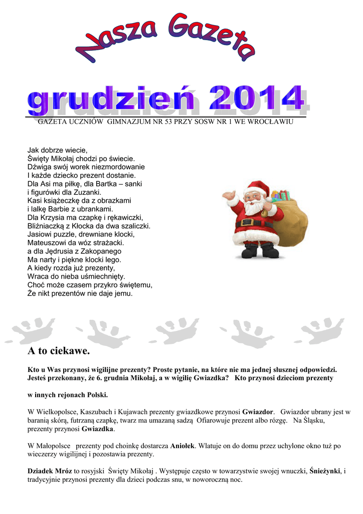 GAZETA UCZNIÓW GIMNAZJUM NR 53 PRZY SOSW NR 1 WE WROCŁAWIU Jak dobrze wiecie, Święty Mikołaj chodzi po świecie. Dźwiga swój worek niezmordowanie I każde dziecko prezent dostanie. Dla Asi ma piłkę, dla Bartka – sanki i figurówki dla Zuzanki. Kasi książeczkę da z obrazkami i lalkę Barbie z ubrankami. Dla Krzysia ma czapkę i rękawiczki, Bliźniaczką z Kłocka da dwa szaliczki. Jasiowi puzzle, drewniane klocki, Mateuszowi da wóz strażacki. a dla Jędrusia z Zakopanego Ma narty i piękne klocki lego. A kiedy rozda już prezenty, Wraca do nieba uśmiechnięty. Choć może czasem przykro świętemu, Że nikt prezentów nie daje jemu. A to ciekawe. Kto u Was przynosi wigilijne prezenty? Proste pytanie, na które nie ma jednej słusznej odpowiedzi. Jesteś przekonany, że 6. grudnia Mikołaj, a w wigilię Gwiazdka? Kto przynosi dzieciom prezenty w innych rejonach Polski. W Wielkopolsce, Kaszubach i Kujawach prezenty gwiazdkowe przynosi Gwiazdor. Gwiazdor ubrany jest w baranią skórą, futrzaną czapkę, twarz ma umazaną sadzą Ofiarowuje prezent albo rózgę. Na Śląsku, prezenty przynosi Gwiazdka. W Małopolsce prezenty pod choinkę dostarcza Aniołek. Wlatuje on do domu przez uchylone okno tuż po wieczerzy wigilijnej i pozostawia prezenty. Dziadek Mróz to rosyjski Święty Mikołaj . Występuje często w towarzystwie swojej wnuczki, Śnieżynki, i tradycyjnie przynosi prezenty dla dzieci podczas snu, w noworoczną noc. Prawdziwy Święty Mikołaj swoje święto obchodzi 6. grudnia i cała Polska twierdzi zgodnie: to on jest odpowiedzialny za niewielkie podarunki, znajdowane tego dnia w skarpecie czy bucie albo pod poduszką. CIEKAWOSTKI Święty Mikołaj Kochają go wszyscy dorośli i dzieci, bogaci i biedni, Ludzie z dużych miast i małych miasteczek. Święty Mikołaj odwiedza nas zazwyczaj 6 grudnia lub w wieczór wigilijny. Święty Mikołaj od dawna kojarzy się z tym co najlepsze w człowieku: dobrocią i wrażliwością na potrzeby innych Był biskupem Mirry – miasta leżącego w dzisiejszej Turcji. Żył na przełomie III – IV w. Przez całe swoje życie pomagał ludziom i rozdawała pieniądze potrzebującym. Kilkaset lat później zaczęto wierzyć, że każdego roku przybywa on do wszystkich domów z prezentami dla dzieci. Święty Mikołaj dziś to tłuściutki, miły staruszek o długiej, siwej brodzie, odziany w czerwony kożuch i czapkę z białym pomponem. Porusza się saniami, ciągniętymi przez zaprzęg reniferów, zaś do domów dostaje się przez komin To proste. Po ubraniu i wyglądzie. Oto jego krótki opis: Kurtka uszyta z czerwonego materiału wykończonego białym futerkiem ,zapinana jest na wielkie białe guziki, a rękawy ma z wywiniętymi białymi mankietami. Spodnie także czerwone. Głębokie, wpuszczane kieszenie po bokach żeby zmieściło się w nich bardzo dużo słodyczy (dlatego Święty Mikołaj ma je zwykle powypychane, głównie ciasteczkami od dzieci). W pasie spodnie są zapięte na wystającym okrąglutkim brzuchu (każdy prawdziwy Święty Mikołaj ma wystający brzuszek, każdy Święty Mikołaj to prawdziwy łakomczuszek, nie powstrzyma się przed zjedzeniem ciastek). Czapka także ma czerwony kolor i też wykończona białym futerkiem. Na czubku oczywiście biały pompon. Pas i buty: pas powinien być szeroki i czarny, buty wysokie z cholewami także czarne. Włosy, broda i wąsy muszą być długie i mieć biało srebrny kolor. Musi mieć naturalnie worek , w którym ma prezenty. Mikołaj bez reniferów ciągnących sanie nie zdążyłby w jedną noc . Potrzebuje szybkiego zaprzęgu , który ciągną: Kometek Błyskawiczny Fircyk Amorek Tancerz Pyszałek Złośnik Profesorek Rudolf Czerwononosy dziś w roli głównej Dziś poznamy jedno z najważniejszych zwierząt, które króluje na wigilijnym stole. Każdy z was zapewne domyśla się, że chodzi o...karpia. Karp – gatunek słodkowodnej ryby w naturalnych warunkach karp przebywa w wodach stojących lub wolno płynących są to stawy i jeziora. Ma dużą głowę z wysuwaną paszczą wyposażoną w cztery małe, krótkie wąsiki. Karp przybiera ciemnobrunatne i żółtobrunatne barwy w zależności od warunków środowiskowych. Jego pokarmem są drobne zwierzęta wodne, m.in. owady i ślimaki. Osiąga ponad 1 m długości i wagę 30 (maksymalnie 40) kg. Składniki: 150 g miodu, 1 szklanka cukru pudru, 2 jaja, 50 dag mąki, 80 g margaryny, przyprawa korzenna, 5 g sody. Miód, puder i jajka ucierać przez 10 minut. Mąkę, sodę i przyprawę dokładnie wymieszać, a następnie połączyć z utartymi wcześniej składnikami. Do powstałej masy wlać roztopioną i ostudzoną margarynę i dokładnie wymieszać. Smakosze mogą do piernikowego ciasta dodać orzechy. Z ciasta uformować kulę i pozostawić w lodówce na 1 dzień. Następnego dnia po rozwałkowaniu ciasta (nie za grube), wycinać foremkami pierniczki i piec przez 15 minut na blasze wysmarowanej margaryną. Po wyciągnięciu z piekarnika i ostudzeniu, pierniczki można ozdobić lukrem, cukrem pudrem lub czekoladą. Można je przygotować nawet miesiąc przed świętami. Dzieciaki! Zbliża się wielkimi krokami zima a z niż już niedługo ferie. W końcu będzie można jeździć na sankach, łyżwach, nartach, ślizgać się, rzucać śnieżkami. Pamiętajcie jednak o bezpieczeństwie podczas zabaw zimowych: Nie rzucajcie zbitym śniegiem w ludzi, zwierzęta –możecie wyrządzić im krzywdę! Nie rzucajcie zbitym śniegiem w przejeżdżające pojazdy, okna –możecie spowodować wypadek lub inne nieszczęśliwe zdarzenie! Na sankach, nartach zjeżdżajcie tylko w miejscach bezpiecznych, położonych z dala od jezdni! Nie doczepiajcie sanek do pojazdów –grozi to wypadkiem! Jazda na łyżwach to wspaniała zabawa, lecz tylko w miejscach bezpiecznych – specjalnie do tego celu przygotowanych lodowiskach! Zabawa na lodzie, jazda na łyżwach na zamarzniętym stawie, jeziorze lub innym zbiorniku wodnym j