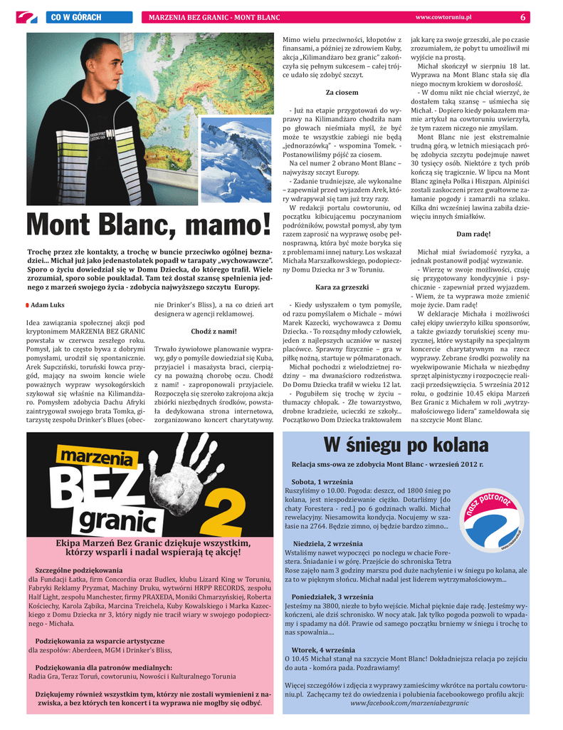 CO W GÓRACH MARZENIA BEZ GRANIC - MONT BLANC www.cowtoruniu.pl Mimo wielu przeciwności, kłopotów z finansami, a później ze zdrowiem Kuby, akcja „Kilimandżaro bez granic” zakończyła się pełnym sukcesem – całej trójce udało się zdobyć szczyt. Za ciosem Mont Blanc, mamo! Trochę przez złe kontakty, a trochę w buncie przeciwko ogólnej beznadziei... Michał już jako jedenastolatek popadł w tarapaty „wychowawcze”. Sporo o życiu dowiedział się w Domu Dziecka, do którego trafił. Wiele zrozumiał, sporo sobie poukładał. Tam też dostał szansę spełnienia jednego z marzeń swojego życia - zdobycia najwyższego szczytu Europy. Adam Luks Idea zawiązania społecznej akcji pod kryptonimem MARZENIA BEZ GRANIC powstała w czerwcu zeszłego roku. Pomysł, jak to często bywa z dobrymi pomysłami, urodził się spontanicznie. Arek Supcziński, toruński łowca przygód, mający na swoim koncie wiele poważnych wypraw wysokogórskich szykował się właśnie na Kilimandżaro. Pomysłem zdobycia Dachu Afryki zaintrygował swojego brata Tomka, gitarzystę zespołu Drinker’s Blues (obec- nie Drinker’s Bliss), a na co dzień art designera w agencji reklamowej. Chodź z nami! Trwało żywiołowe planowanie wyprawy, gdy o pomyśle dowiedział się Kuba, przyjaciel i masażysta braci, cierpiący na poważną chorobę oczu. Chodź z nami! - zaproponowali przyjaciele. Rozpoczęła się szeroko zakrojona akcja zbiórki niezbędnych środków, powstała dedykowana strona internetowa, zorganizowano koncert charytatywny. - Już na etapie przygotowań do wyprawy na Kilimandżaro chodziła nam po głowach nieśmiała myśl, że być może te wszystkie zabiegi nie będą „jednorazówką” - wspomina Tomek. Postanowiliśmy pójść za ciosem. Na cel numer 2 obrano Mont Blanc – najwyższy szczyt Europy. - Zadanie trudniejsze, ale wykonalne – zapewniał przed wyjazdem Arek, który wdrapywał się tam już trzy razy. W redakcji portalu cowtoruniu, od początku kibicującemu poczynaniom podróżników, powstał pomysł, aby tym razem zaprosić na wyprawę osobę pełnosprawną, która być może boryka się z problemami innej natury. Los wskazał Michała Marszałkowskiego, podopieczny Domu Dziecka nr 3 w Toruniu. Kara za grzeszki - Kiedy usłyszałem o tym pomyśle, od razu pomyślałem o Michale – mówi Marek Kazecki, wychowawca z Domu Dziecka. - To rozsądny młody człowiek, jeden z najlepszych uczniów w naszej placówce. Sprawny fizycznie – gra w piłkę nożną, startuje w półmaratonach. Michał pochodzi z wielodzietnej rodziny – ma dwanaścioro rodzeństwa. Do Domu Dziecka trafił w wieku 12 lat. - Pogubiłem się trochę w życiu – tłumaczy chłopak. - Złe towarzystwo, drobne kradzieże, ucieczki ze szkoły... Początkowo Dom Dziecka traktowałem 6 jak karę za swoje grzeszki, ale po czasie zrozumiałem, że pobyt tu umożliwił mi wyjście na prostą. Michał skończył w sierpniu 18 lat. Wyprawa na Mont Blanc stała się dla niego mocnym krokiem w dorosłość. - W domu nikt nie chciał wierzyć, że dostałem taką szansę – uśmiecha się Michał. - Dopiero kiedy pokazałem mamie artykuł na cowtoruniu uwierzyła, że tym razem niczego nie zmyślam. Mont Blanc nie jest ekstremalnie trudną górą, w letnich miesiącach próbę zdobycia szczytu podejmuje nawet 30 tysięcy osób. Niektóre z tych prób kończą się tragicznie. W lipcu na Mont Blanc zginęła Polka i Hiszpan. Alpiniści zostali zaskoczeni przez gwałtowne załamanie pogody i zamarzli na szlaku. Kilka dni wcześniej lawina zabiła dziewięciu innych śmiałków. Dam radę! Michał miał świadomość ryzyka, a jednak postanowił podjąć wyzwanie. - Wierzę w swoje możliwości, czuję się przygotowany kondycyjnie i psychicznie - zapewniał przed wyjazdem. - Wiem, że ta wyprawa może zmienić moje życie. Dam radę! W deklaracje Michała i możliwości całej ekipy uwierzyło kilku sponsorów, a także gwiazdy toruńskiej sceny muzycznej, które wystąpiły na specjalnym koncercie charytatywnym na rzecz wyprawy. Zebrane środki pozwoliły na wyekwipowanie Michała w niezbędny sprzęt alpinistyczny i rozpoczęcie realizacji przedsięwzięcia. 5 września 2012 roku, o godzinie 10.45 ekipa Marzeń Bez Granic z Michałem w roli „wytrzymałościowego lidera” zameldowała się na szczycie Mont Blanc. W śniegu po kolana Relacja sms-owa ze zdobycia Mont Blanc - wrzesień 2012 r. Ekipa Marzeń Bez Granic dziękuje wszystkim, którzy wsparli i nadal wspierają tę akcję! Szczególne podziękowania dla Fundacji Łatka, firm Concordia oraz Budlex, klubu Lizard King w Toruniu, Fabryki Reklamy Pryzmat, Machiny Druku, wytwórni HRPP RECORDS, zespołu Half Light, zespołu Manchester, firmy PRAXEDA, Moniki Chmarzyńskiej, Roberta Kościechy, Karola Ząbika, Marcina Treichela, Kuby Kowalskiego i Marka Kazeckiego z Domu Dziecka nr 3, który nigdy nie tracił wiary w swojego podopiecznego - Michała. Podziękowania za wsparcie artystyczne dla zespołów: Aberdeen, MGM i Drinker’s Bliss, Podziękowania dla patronów medialnych: Radia Gra, Teraz Toruń, cowtoruniu, Nowości i Kulturalnego Torunia Dziękujemy również wszystkim tym, którzy nie zostali wymienieni z nazwiska, a bez których ten koncert i ta wyprawa nie mogłby się odbyć. Sobota, 1 września Ruszyliśmy o 10.00. Pogoda: deszcz, od 1800 śnieg po kolana, jest niespodziewanie ciężko. Dotarliśmy [do chaty Forestera - red.] po 6 godzinach walki. Michał rewelacyjny. Niesamowita kondycja. Nocujemy w szałasie na 2764. Będzie zimno, oj będzie bardzo zimno... Niedziela, 2 września Wstaliśmy nawet wypoczęci po noclegu w chacie Forestera. Śniadanie i w górę. Przejście do schroniska Tetra Rose zajęło nam 3 godziny marszu pod duże nachylenie i w śniegu po kolana, ale za to w pięknym słońcu. Michał nadal jest liderem wytrzymałościowym... Poniedziałek, 3 września Jesteśmy na 3800, niezłe to było wejście. Michał p