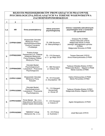 REJESTR PRZEDSIĘBIORCÓW PROWADZĄCYCH PRACOWNIĘ PSYCHOLOGICZNĄ DZIAŁAJĄCYCH NA TERENIE WOJEWÓDZTWA ZACHODNIOPOMORSKIEGO 1 2 3 4 5 L.p. NR firma przedsiębiorcy Adres pracowni psychologicznej imiona i nazwiska zatrudnionych psychologów wraz z numerami ich uprawnień Z-PP001/2005 Wojewódzki Ośrodek Medycyny Pracy Zachodniopomorskie Centrum Leczenia i Profilaktyki 70 -506 Szczecin Ul. Starzyńskiego 2 GraŜyna Piz Z-P005 Teresa Gierczak Z-P010 Małgorzata Kiezik Z-P025 Jadwiga Jędrzejewska-Lipnicka Z-P004 Małgorzata Woronko Z-P059 Polskie Koleje Państwowe S.A. Oddział Kolejowa Medycyna Pracy-Kolejowy Zakład Medycyny Pracy 70 - 215 Szczecin ul. 3 - go Maja 25/27 Teresa Gierczak Z-P010 Anna Wawrzynkowska Z-P009 71 - 682 Szczecin ul. Golisza 25a Tadeusz Wiesław Bratos Z-P001 Małgorzata Bratos – Stępień Z-P028 Marta Czerska Z-P085 1. 2. Z-PP002/2005 3. Z-PP004/2005 Ośrodek Badań Psychologicznych i Lekarskich - Pracownia Psychologiczna 4. Z-PP011/2005 Wojewódzki Ośrodek Medycyny Pracy Koszalin 75 - 613 Koszalin ul. Zwycięstwa 136 Z-PP012/2005 Ośrodek Badań Psychologicznych i Lekarskich - Pracownia Psychologiczna 73 - 110 Stargard Szczeciński ul. Okrzei 3F Tadeusz Wiesław Bratos Z-P001 Małgorzata Bratos–Stępień Z-P028 Z-PP015/2005 Porta Medyk Sp. z o.o. Niepubliczny Stoczniowy Zakład Opieki Zdrowotnej 71 - 610 Szczecin ul. Dubois 27 Agata Giergielewicz Z-P020 Z-PP016/2005 "MEDIKA" Usługi Medyczne Sp. z o.o. 72 - 010 Police ul. Kuźnicka 1 Józef Berczak Z-P015 5. 6. 7. Halina Wołoszyńska Z-P008 Marta Perzyńska Z-P062 1 Z-PP017/2005 Ośrodek Usług Psychologicznych Poradnia Badań Kierowców 71 - 063 Szczecin ul. Ks. Witolda 3/1A Zdzisław Kniaziuk Z-PO22 Małgorzata Kiezik Z-P025 GraŜyna Piz – Z-P005 Z-PP018/2005 Centrum Psychologii Dominika Markowska Pracownia Psychologiczna 73 - 110 Stargard Szczeciński ul. Czarnieckiego 25D Dominika Markowska Z-P029 10. Z-PP019/2005 Psychologiczna Pracownia Badań Kierowców Robert Zagrzejewski 78 - 400 Szczecinek ul. 28 Lutego 3 Robert Zagrzejewski Z-P032 8. 9. 11. Z-PP020/2005 Centrum Badań Lekarskich i Psychologicznych 12. Z-PP021/2005 Firma PSYCHO-TEST Karolina Święciaszek Liga Obrony Kraju Stowarzyszenie Warszawa 13. Z-PP022/2006 Ośrodek Szkolenia Zawodowego Kierowców w Gryficach 70 - 372 Szczecin ul. Boh. Warszawy 18/1 Katarzyna Bieńczak Z-P037 Kamila Bogulas Z-P038 78 - 100 Kołobrzeg ul. Szpitalna 2c/5 Karolina Święciaszek Z-P033 72 - 300 Gryfice ul. Kamieńska 42 Lucyna Derkowska Z-P045 Wioletta Witkowska 32/P 14. Z-PP024/2006 Pracownia Psychologiczna "ABS" Małgorzata Mazur 75-950 Koszalin ul. Szczecińska 1418 Małgorzata Mazur Z-P039 15. Z-PP026/2007 PROFI-MED Sp. z o.o. J. Klonek, A. Krawczyk 72-100 Goleniów ul. M. Konopnickiej 10A Magdalena Paszkowska Z-P041 2 Polski Związek Motorowy Okręgowy Zespół 16. Z-PP027/2007 Działalności Gospodarczej Sp. z o.o. w Poznaniu 78-600 Wałcz ul. Kołobrzeska 7 Katarzyna Wierzbińska Z-P046 17. Z-PP028/2007 Centrum Badań Psychologicznych Psychotest Anna Jekel 70-453 Szczecin Al. PapieŜa Jana Pawła II 36/8 Anna Jekel Z-P043 18. Z-PP030/2008 Firma Usługowo Handlowa Gabinet Psychologiczny Adam Fedeńczak 72-200 Nowogard ul. 700-lecia 17 Iwona Witek Z-P086 Marta Bogumił – Felbur Z-P087 Anna Bielida Z-P061 19. Z-PP031/2008 Liga Obrony Kraju Stowarzyszenie Warszawa Ośrodek Szkolenia Zawodowego Kierowców w Białogardzie 78-200 Białogard ul. Zwycięstwa 10 Ośrodek Nauki Jazdy s.c. 20. Z-PP032/2008 B. i J. Jakubowscy Z-PP34/2009 PSYCHOART STUDIO Małgorzata Wojtunik 22. Z-PP035/2009 PRACOWNIA BADAŃ PSYCHOLOGICZNYCH Anna Stanowska 21. Justyna Wesołowska Z-P081 72-400 Kamień Pomorski ul. Dworcowa 3 Anna Jekel Z-PO43 72-600 Świnoujście ul. Wyspiańskiego 29 Małgorzata Wojtunik – Z-P048 Ul. 3-ego Maja 25/27 70-215 Szczecin Anna Stanowska Z-P047 Ul. Tuwima 10 73-200 Choszczno 3 23. Z-PP036/2009 PRACOWNIA PSYCHOLOGICZNA „KONTAKT” Ewa Pałka Ul.28Lutego 60 78-400 Szczecinek 24. Z-PP037/2009 LIGA OBRONY KRAJU Stowarzyszenie Warszawa Ośrodek Szkolenia Zawodowego Kierowców w Gryfinie Ul. Szczecińska 24 74-100 Gryfino Katarzyna Smolarz Z-P083 Marta Bogumił – Felbur Z-P087 Iwona Witek Z-P086 25. Z-PP038/2010 WOJSKOWA SPECJALISTYCZNA PRZYCHODNIA LEKARSKA Ul. Zwycięstwa 204A 75-640 Koszalin Bogumiła Chomentowska –Hadyniak Z-P017 Ul. Malczewskiego 26 71-612 Szczecin Teresa Gierczak Z-P010 Anna Jekel Z-P043 Barbara Stawarz Z-P072 Medicover Sp. z o.o. 02-366 Warszawa, ul. 26. Z-PP040/2011 Bitwy Warszawskiej 1920 r., nr 18 27. Z-PP041/2011 Pracownia Badań Kierowców „Krzysztof” Al. śołnierza 27/9 73-110 Stargard Szczeciński www.psychologkaczmarska.stargard.pl 28. Z-PP043/2011 Pracownia Badań Psychologicznych „Gamma” Małgorzata Woronko Ul. Batalionów Chłopskich 86 Szczecin 29. Z-PP044/2011 AKSON LAB- Ireneusz Ślęzak Ul. H. Modrzejewskiej 4, lokal numer 3 75-729 Koszalin Ewa Pałka Z-P057 Agnieszka Kaczmarska Z-P036 Józef Berczak Z-P015 Agata Giergielewicz Z-P020 Robert Babiasz Z-P027 Małgorzata Woronko Z-P059 Ireneusz Ślęzak Z-P063 Halina Wołoszyńska Z-P008 Ul. Kupiecka 5A 78-100 Kołobrzeg 4 CENTRUM BADAŃ I USŁUG 30. Z-PP045/2011 PSYCHOLOGICZNYCH AS ANNA SŁONIOWSKA 31. Z-PP046/2011 „Auto-Reflex” Pracownia Psychologiczna UL. Koszalińska 9a Świdwin 78-300 Anna Słoniowska Z-P066 Ul. Bagienna 36c 70-772 Szczecin Monika Subocz Z-P070 Ul. Lipowa 7 78-520 Złocieniec Ewelina MęŜydło Z-P042 32 Z-PP047/2011 33 Z-PP048/2011 Przychodnia Portowa Sp. z o.o w Szczecinie 70 - 656 Szczecin ul. Energetyków 2 Barbara Regnowska Z-P016 Małgorzata Kiezik Z-P025 Z-PP050/2012 LIGA OBRONY KRAJU Stowarzyszenie Warszawa Ośrodek Szkolenia Zawodowego Kierowców w Dębnie 74-400 Dębno Mickiewicza 35 Katarzyna Psiuk 025/08F 35 Z-PP052/2012 Gabinet Psychologiczny Sylwia Milewska 36 Z-PP053/2012 Spółdzielnia Pracy Lekarzy Specjalistów „Medicus” 34 Gabinet Psychologiczny Ewelina Szczotkiewicz Centrum Medyczne FALCK Ul. Narutowicza 13