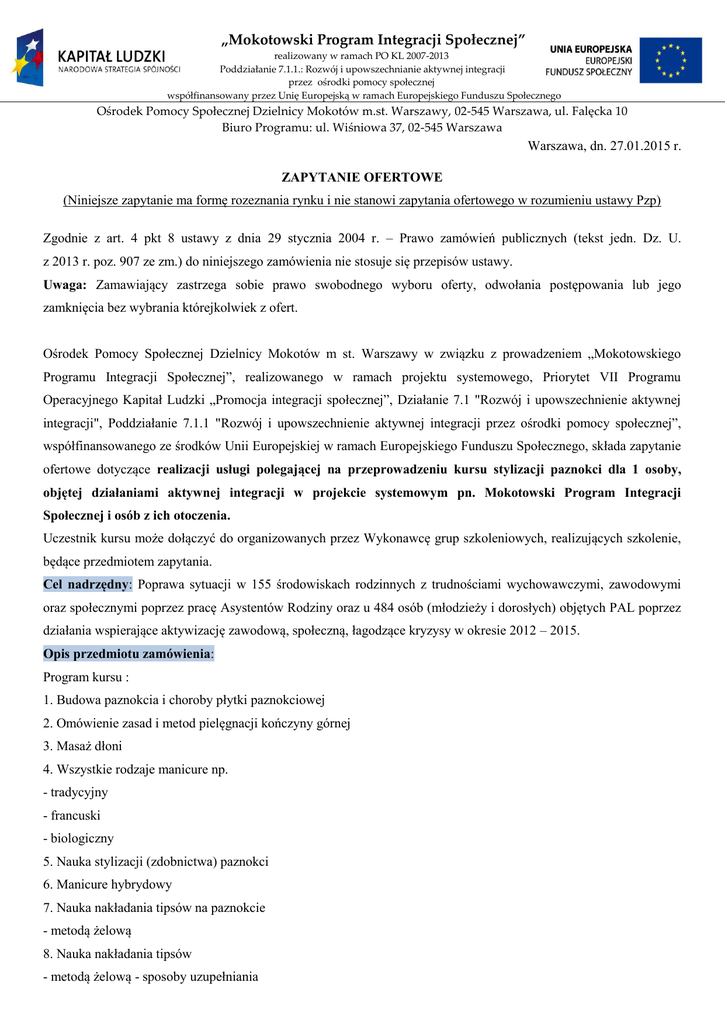 „Mokotowski Program Integracji Społecznej” realizowany w ramach PO KL 2007-2013 Poddziałanie 7.1.1.: Rozwój i upowszechnianie aktywnej integracji przez ośrodki pomocy społecznej współfinansowany przez Unię Europejską w ramach Europejskiego Funduszu Społecznego Ośrodek Pomocy Społecznej Dzielnicy Mokotów m.st. Warszawy, 02-545 Warszawa, ul. Falęcka 10 Biuro Programu: ul. Wiśniowa 37, 02-545 Warszawa Warszawa, dn. 27.01.2015 r. ZAPYTANIE OFERTOWE (Niniejsze zapytanie ma formę rozeznania rynku i nie stanowi zapytania ofertowego w rozumieniu ustawy Pzp) Zgodnie z art. 4 pkt 8 ustawy z dnia 29 stycznia 2004 r. – Prawo zamówień publicznych (tekst jedn. Dz. U. z 2013 r. poz. 907 ze zm.) do niniejszego zamówienia nie stosuje się przepisów ustawy. Uwaga: Zamawiający zastrzega sobie prawo swobodnego wyboru oferty, odwołania postępowania lub jego zamknięcia bez wybrania którejkolwiek z ofert. Ośrodek Pomocy Społecznej Dzielnicy Mokotów m st. Warszawy w związku z prowadzeniem „Mokotowskiego Programu Integracji Społecznej”, realizowanego w ramach projektu systemowego, Priorytet VII Programu Operacyjnego Kapitał Ludzki „Promocja integracji społecznej”, Działanie 7.1 "Rozwój i upowszechnienie aktywnej integracji", Poddziałanie 7.1.1 "Rozwój i upowszechnienie aktywnej integracji przez ośrodki pomocy społecznej”, współfinansowanego ze środków Unii Europejskiej w ramach Europejskiego Funduszu Społecznego, składa zapytanie ofertowe dotyczące realizacji usługi polegającej na przeprowadzeniu kursu stylizacji paznokci dla 1 osoby, objętej działaniami aktywnej integracji w projekcie systemowym pn. Mokotowski Program Integracji Społecznej i osób z ich otoczenia. Uczestnik kursu może dołączyć do organizowanych przez Wykonawcę grup szkoleniowych, realizujących szkolenie, będące przedmiotem zapytania. Cel nadrzędny: Poprawa sytuacji w 155 środowiskach rodzinnych z trudnościami wychowawczymi, zawodowymi oraz społecznymi poprzez pracę Asystentów Rodziny oraz u 484 osób (młodzieży i dorosłych) objętych PAL poprzez działania wspierające aktywizację zawodową, społeczną, łagodzące kryzysy w okresie 2012 – 2015. Opis przedmiotu zamówienia: Program kursu : 1. Budowa paznokcia i choroby płytki paznokciowej 2. Omówienie zasad i metod pielęgnacji kończyny górnej 3. Masaż dłoni 4. Wszystkie rodzaje manicure np. - tradycyjny - francuski - biologiczny 5. Nauka stylizacji (zdobnictwa) paznokci 6. Manicure hybrydowy 7. Nauka nakładania tipsów na paznokcie - metodą żelową 8. Nauka nakładania tipsów - metodą żelową - sposoby uzupełniania „Mokotowski Program Integracji Społecznej” realizowany w ramach PO KL 2007-2013 Poddziałanie 7.1.1.: Rozwój i upowszechnianie aktywnej integracji przez ośrodki pomocy społecznej współfinansowany przez Unię Europejską w ramach Europejskiego Funduszu Społecznego Ośrodek Pomocy Społecznej Dzielnicy Mokotów m.st. Warszawy, 02-545 Warszawa, ul. Falęcka 10 Biuro Programu: ul. Wiśniowa 37, 02-545 Warszawa Zajęcia będące przedmiotem zamówienia odbywać się będą: a) 2 – 3 razy w tygodniu (dopuszcza się możliwość realizacji kursu w weekendy) b) łącznie 40 h Jeżeli Uczestnik wyrazi wolę udziału w zajęciach z inną częstotliwością, niż podana w zapytaniu, dopuszcza się możliwość dokonania zmian za wiedzą i zgodą Zamawiającego. Wynagrodzenie Wykonawcy uzależnione jest od faktycznego uczestniczenia w zajęciach i złożonych podpisów na listach obecności. Cele wykonania przedmiotu zamówienia: Celem jest zdobycie wiedzy, umiejętności i kompetencji w zakresie przedmiotu zamówienia i zwiększenie szans na rynku pracy poprzez podniesienie kwalifikacji zawodowych, umożliwiających podjęcie pracy. Wymagania wobec zajęć i prowadzących: 1. Usługa realizowania na terenie m.st. Warszawy, 2. W czasie realizacji zajęć z Uczestnikiem i o ile zajdzie taka potrzeba, zapewniona będzie opieka dla jego dzieci (dodatkowe pomieszczenie, w którym w odpowiednich warunkach będą mogły przebywać dzieci, przybory do rysowania, gry, osoba do opieki). 3. Zapewnienie sali dydaktycznej, przystosowanej do prowadzenia zajęć, posiadającej niezbędny sprzęt i wyposażenie, zapewniające uczestnikom właściwe warunki udziału w szkoleniu. Określenie miejsca odbywania zajęć musi nastąpić co najmniej 5 dni roboczych przed dniem ich rozpoczęcia. 4. Wykonawca ma obowiązek przedłożyć wraz z ofertą szczegółowy program lub plan pracy w oparciu o który realizowane będzie zamówienie oraz wstępny harmonogram szkolenia. 5. Uczestnik szkolenia w dniu rozpoczęcia zajęć na kursie otrzyma na własność materiały biurowe (zeszyt i długopis) oraz materiały dydaktyczne (podręczniki, skrypty, inne materiały niezbędne do realizacji szkolenia) oraz harmonogram szkolenia. Materiały te należy uwzględnić w kalkulacji kosztów szkolenia. 6. Wykonawca działania musi posiadać wiedzę i udokumentowane dowodami doświadczenie w prowadzeniu zajęć zwłaszcza dla osób przeżywających trudności zawodowe, społeczne i wychowawcze (przede wszystkim klientów pomocy społecznej) z zakresu stanowiącego przedmiot zapytania – kurs stylizacji paznokci, czyli: w ciągu ostatnich 3 lat przed upływem terminu składania ofert, a jeżeli okres prowadzenia działalności jest krótszy - w tym okresie - wykonał lub wykonuje (dot. świadczeń okresowych lub ciągłych), co najmniej 2 tego rodzaju usługi – załącznik nr 2 7. Doświadczenie w pracy przy projektach współfinansowanych ze środków Unii Europejskiej; 8. Wysokie umiejętności interpersonalne; 9. Terminowość, sumienność, punktualność, dyspozycyjność. 10. Wydanie uczestnikowi zaświadczenia na druku Ministerstwa Edukacji Narodowej oraz certyfikatu ukończenia kursu. „Mokotowski Program Integracji Społecznej” realizowany w ramach PO KL 2007-2013 Poddziałanie 7.1.1.: Rozwój i upowszech