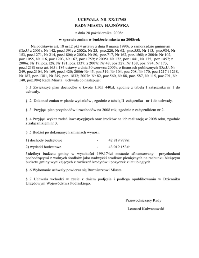 UCHWAŁA NR XX/117/08 RADY MIASTA HAJNÓWKA z dnia 28
