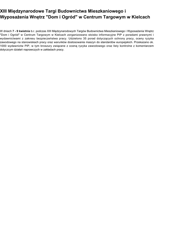 XIII Międzynarodowe Targi Budownictwa Mieszkaniowego i Wyposażenia Wnętrz "Dom i Ogród" w Centrum Targowym w Kielcach W dniach 7 - 9 kwietnia b.r. podczas XIII Międzynarodowych Targów Budownictwa Mieszkaniowego i Wyposażenia Wnętrz "Dom i Ogród" w Centrum Targowym w Kielcach zorganizowano stoisko informacyjne PIP z poradami prawnymi i wydawnictwami z zakresu bezpieczeństwa pracy. Udzielono 35 porad dotyczących ochrony pracy, oceny ryzyka zawodowego na stanowiskach pracy oraz warunków dostosowania maszyn do standardów europejskich. Przekazano ok. 1000 wydawnictw PIP, w tym broszury związane z oceną ryzyka zawodowego oraz listy kontrolne z komentarzem dotyczcym działań naprawczych w zakładach pracy.