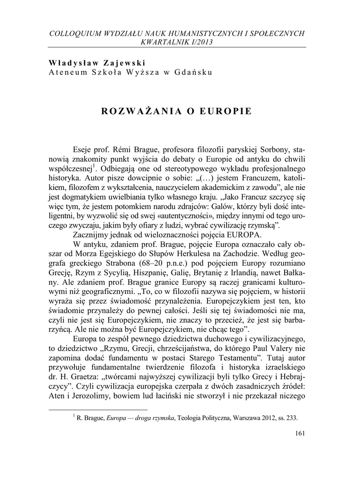 COLLOQUIUM WYDZIAŁU NAUK HUMANISTYCZNYCH I SPOŁECZNYCH KWARTALNIK I/2013 Władysław Zajewski Ateneum Szkoła W yższa w Gdańsku ROZWAŻANIA O EUROPIE Eseje prof. Rémi Brague, profesora filozofii paryskiej Sorbony, stanowią znakomity punkt wyjścia do debaty o Europie od antyku do chwili współczesnej1. Odbiegają one od stereotypowego wykładu profesjonalnego historyka. Autor pisze dowcipnie o sobie: „(…) jestem Francuzem, katolikiem, filozofem z wykształcenia, nauczycielem akademickim z zawodu”, ale nie jest dogmatykiem uwielbiania tylko własnego kraju. „Jako Francuz szczycę się więc tym, że jestem potomkiem narodu zdrajców: Galów, którzy byli dość inteligentni, by wyzwolić się od swej «autentyczności», między innymi od tego uroczego zwyczaju, jakim były ofiary z ludzi, wybrać cywilizację rzymską”. Zacznijmy jednak od wieloznaczności pojęcia EUROPA. W antyku, zdaniem prof. Brague, pojęcie Europa oznaczało cały obszar od Morza Egejskiego do Słupów Herkulesa na Zachodzie. Według geografa greckiego Strabona (68–20 p.n.e.) pod pojęciem Europy rozumiano Grecję, Rzym z Sycylią, Hiszpanię, Galię, Brytanię z Irlandią, nawet Bałkany. Ale zdaniem prof. Brague granice Europy są raczej granicami kulturowymi niż geograficznymi. „To, co w filozofii nazywa się pojęciem, w historii wyraża się przez świadomość przynależenia. Europejczykiem jest ten, kto świadomie przynależy do pewnej całości. Jeśli się tej świadomości nie ma, czyli nie jest się Europejczykiem, nie znaczy to przecież, że jest się barbarzyńcą. Ale nie można być Europejczykiem, nie chcąc tego”. Europa to zespół pewnego dziedzictwa duchowego i cywilizacyjnego, to dziedzictwo „Rzymu, Grecji, chrześcijaństwa, do którego Paul Valery nie zapomina dodać fundamentu w postaci Starego Testamentu”. Tutaj autor przywołuje fundamentalne twierdzenie filozofa i historyka izraelskiego dr. H. Graetza: „twórcami najwyższej cywilizacji byli tylko Grecy i Hebrajczycy”. Czyli cywilizacja europejska czerpała z dwóch zasadniczych źródeł: Aten i Jerozolimy, bowiem lud łaciński nie stworzył i nie przekazał niczego 1 R. Brague, Europa — droga rzymska, Teologia Polityczna, Warszawa 2012, ss. 233. 161 Władysław Zajewski nowego, tworzył tylko „ścisły porządek ukształtowanego społeczeństwa oraz rozwinięta sztukę wojny”. Cały sens tych esejów polega na tym, by pokazać czytelnikowi i przekonać go, jak doniosłe znaczenie miał fakt, że chrześcijaństwo wyłonione z judaizmu nie zatriumfowało w Europie z Jerozolimy, ale z Rzymu, była to „droga rzymska”, droga św. Piotra, i na tej drodze rzymskiej zbudowana została cywilizacja europejska. Bowiem to Rzymianie wynaleźli i pozostawili potomności prawo. To w Rzymie doszło do sformułowania podstawowych zasad prawa świata cywilizowanego: Żyć godnie (honeste vivere), nie szkodzić drugiemu(alterum non laedere), dać każdemu, co mu się należy (suum cuique tribuere). To wreszcie Rzymianie definiowali znakomicie pojęcia prawne i rozróżniali prawo naturalne(ius naturale), prawo powszechne (ius gentium) od prawa cywilnego (ius civile). Sedno wkładu rzymskiego polegało na tym, że prawo rzymskie regulowało transakcje handlowe obywateli i umożliwiało obieg dóbr kulturowych w obrębie imperium (sprzedaż – kupno). Wytworzyła się nieograniczona możliwość sprzedawania i kupowania dzieł sztuki greckiej i kopii rzymskich. Co oznacza być rzymskim Europejczykiem? Rzymski zajmuje miejsce pomiędzy „rozkwitem hellenizmu” a „barbarzyństwem” azjatyckim, to zapewniało pewne poczucie wyższości Greka wobec tego, co „barbarzyńskie”. Co Europa zawdzięcza Jerozolimie? Judaizm oznacza, według autora, całość doświadczeń ludu Izraela opisanych w Starym Testamencie przez licznych proroków oraz Prawo. Judaizm w niewielkim stopniu przyczynił się do stworzenia współczesnej Europy, choćby z tej tylko racji, że język hebrajski miał nikły zasięg w Europie. W średniowieczu Europa raczej fatalnie traktowała Żydów; lepiej im się wiodło w świecie muzułmańskim. Rozważania prof. Brague o wkładzie islamu do cywilizacji europejskiej wnosi nowe, pozytywne spojrzenie na dorobek intelektualistów islamskich. Czytelnik musi zdać sobie sprawę z faktu, że chrześcijaństwo było religią oddolną, zawojowało Imperium Rzymskie w ciągu kilku stuleci i wyparło religie pogańskie. Ten triumfalny, lecz nie bez nawrotów reakcji pogańskich, pochód rozpoczął się od Konstantyna Wielkiego (cesarz 306–337). Trudno nam dzisiaj wyobrazić sobie dalszą stagnację i trwanie Imperium Rzymskiego; dokonałoby się ogromne opóźnienie w rozwoju Europy, w rozwoju mnogości języków europejskich i kultur. Wszak inny historyk napisał sensownie: „Starożytność trwałaby do dzisiaj. Taka perspektywa sprawia, że myśl o rzymskiej Europie jest nie do zniesienia dla każdego europejskiego patrioty”2. 2 162 A. Demandt, Historia niebyła, Warszawa 1999, s. 104. COLLOQUIUM WNHiS Rozważania o Europie Prof. Brague nadaje zupełnie inny sens pojęciu „droga rzymska”. Nie chodzi tutaj o utrwalenie, kontynuowanie imperializmu rzymskiego. Chodzi o to, że Kościół stał się dziedzicem imperium rzymskiego oraz jego „rzymskiej struktury” i ta jego rzymska struktura jest fenomenem chrześcijańskiego Kościoła. Chrześcijanie mają swoich „Greków”, są nimi Żydzi i chrześcijanie, którzy tak się mają do Starego Przymierza, jak Rzymianie mieli się do antycznych Greków. Po prostu chrześcijanie są zaszczepieni na ludzie żydowskim. Słowa Chrystusa, że „zbawienie bierze początek od Żydów” (św. Jan), oznaczało, że chrześcijanie nie mogą odrzucić Starego Testamentu. Takie zakusy zaistniały w II wieku w poglądach Marcjona (100–160), ale zostały mądrze przez Kościół rzymski odrzucone. Pod pojęciem Rzymian autor esejów rozumie wszyst