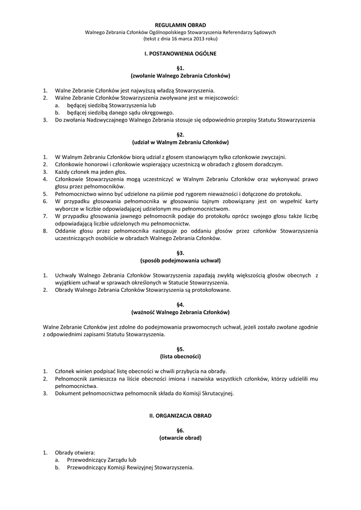 REGULAMIN OBRAD Walnego Zebrania Członków Ogólnopolskiego Stowarzyszenia Referendarzy Sądowych (tekst z dnia 16 marca 2013 roku) I. POSTANOWIENIA OGÓLNE §1. (zwołanie Walnego Zebrania Członków) 1. 2. 3. Walne Zebranie Członków jest najwyższą władzą Stowarzyszenia. Walne Zebranie Członków Stowarzyszenia zwoływane jest w miejscowości: a. będącej siedzibą Stowarzyszenia lub b. będącej siedzibą danego sądu okręgowego. Do zwołania Nadzwyczajnego Walnego Zebrania stosuje się odpowiednio przepisy Statutu Stowarzyszenia §2. (udział w Walnym Zebraniu Członków) 1. 2. 3. 4. 5. 6. 7. 8. W Walnym Zebraniu Członków biorą udział z głosem stanowiącym tylko członkowie zwyczajni. Członkowie honorowi i członkowie wspierający uczestniczą w obradach z głosem doradczym. Każdy członek ma jeden głos. Członkowie Stowarzyszenia mogą uczestniczyć w Walnym Zebraniu Członków oraz wykonywać prawo głosu przez pełnomocników. Pełnomocnictwo winno być udzielone na piśmie pod rygorem nieważności i dołączone do protokołu. W przypadku głosowania pełnomocnika w głosowaniu tajnym zobowiązany jest on wypełnić karty wyborcze w liczbie odpowiadającej udzielonym mu pełnomocnictwom. W przypadku głosowania jawnego pełnomocnik podaje do protokołu oprócz swojego głosu także liczbę odpowiadającą liczbie udzielonych mu pełnomocnictw. Oddanie głosu przez pełnomocnika następuje po oddaniu głosów przez członków Stowarzyszenia uczestniczących osobiście w obradach Walnego Zebrania Członków. §3. (sposób podejmowania uchwał) 1. 2. Uchwały Walnego Zebrania Członków Stowarzyszenia zapadają zwykłą większością głosów obecnych z wyjątkiem uchwał w sprawach określonych w Statucie Stowarzyszenia. Obrady Walnego Zebrania Członków Stowarzyszenia są protokołowane. §4. (ważność Walnego Zebrania Członków) Walne Zebranie Członków jest zdolne do podejmowania prawomocnych uchwał, jeżeli zostało zwołane zgodnie z odpowiednimi zapisami Statutu Stowarzyszenia. §5. (lista obecności) 1. 2. 3. Członek winien podpisać listę obecności w chwili przybycia na obrady. Pełnomocnik zamieszcza na liście obecności imiona i nazwiska wszystkich członków, którzy udzielili mu pełnomocnictwa. Dokument pełnomocnictwa pełnomocnik składa do Komisji Skrutacyjnej. II. ORGANIZACJA OBRAD §6. (otwarcie obrad) 1. Obrady otwiera: a. Przewodniczący Zarządu lub b. Przewodniczący Komisji Rewizyjnej Stowarzyszenia. 2. 3. Otwierający obrady zarządza wybór Przewodniczącego Zebrania i Protokolanta. Przewodniczący Zebrania kieruje obradami Walnego Zebrania Członków. §7. (wybór Komisji Skrutacyjnej) 1. 2. 3. 4. Przewodniczący Zebrania zarządza wybór dwu lub trzyosobowej Komisji Skrutacyjnej. Komisja Skrutacyjna czuwa nad: a. prawidłowością przebiegu obrad Walnego Zebrania, b. prawidłowością przeprowadzanego głosowania, c. prawidłowością wpisu na listę obecności, d. dokonuje zliczenia osób obecnych na zebraniu i uczestniczących w obradach przez pełnomocników, e. kontroluje liczbę oddanych głosów, f. stwierdza prawidłowość podjętych uchwał. Komisja Skrutacyjna dokonuje wyboru ze swego grona przewodniczącego, jego zastępcy i sekretarza. Z podjętych czynności Komisja Skrutacyjna sporządza protokół podpisany przez wszystkich członków i składa go po zakończeniu obrad Przewodniczącemu Walnego Zebrania, który dołącza go do protokołu Walnego Zebrania. §8. (porządek obrad) 1. 2. Po dokonaniu wyboru Komisji Skrutacyjnej Przewodniczący poddaje pod głosowanie zaproponowany porządek obrad. Walne Zebranie może skreślić z porządku obrad poszczególne sprawy lub odroczyć ich rozpoznanie do następnego Walnego Zebrania a także zmienić kolejność rozpatrywania spraw w porządku obrad. §9. (dyskusja i uchwały) 1. 2. 3. 4. 5. Po przedstawieniu sprawy zamieszczonej w porządku obrad Przewodniczący otwiera dyskusję udzielając głosu w kolejności zgłoszenia. Członkom Zarządu i Komisji Rewizyjnej Stowarzyszenia przysługuje prawo zabrania głosu w każdej sprawie z porządku obrad poza kolejnością wyznaczoną przez Przewodniczącego. Przewodniczący ma prawo: a. zwrócić uwagę zabierającemu głos, jeżeli odbiega od tematu dyskusji, b. nie stosującemu się do uwag Przewodniczący może odebrać głos. W sprawach formalnych Przewodniczący udziela głosu poza kolejnością. Za wniosek formalny uważa się wniosek w przedmiocie: a. obradowania i głosowania, b. głosowania bez przeprowadzania dyskusji, c. przerwania dyskusji, d. przerwy w dyskusji, e. zarządzenia przerwy w obradach, f. kolejności i sposobu uchwalania wniosków. §10. (głosowanie nad wnioskami i uchwałami) 1. 2. 3. 4. 5. 6. Po zamknięciu dyskusji Przewodniczący poddaje pod głosowanie wnioski i projekty uchwał. W głosowaniu oblicza się ilość oddanych głosów za, przeciw i wstrzymujących się. Przy ustalaniu większości bierze się pod uwagę jedynie głosy oddane za i przeciw. Obliczenia oddanych głosów i sporządzenie wyników głosowania dokonuje Komisja Skrutacyjna i przedstawia je Przewodniczącemu Zebrania. Wyniki głosowania ogłasza Przewodniczący Zebrania. Głosowanie nad uchwałami i wnioskami jest jawne z wyjątkiem głosowania nad wyborem i odwołaniem członków Zarządu i Komisji Rewizyjnej Stowarzyszenia, które to głosowanie jest tajne. Przyjęcie rezygnacji członka władz Stowarzyszenia odbywa się w głosowaniu jawnym. 2 7. 8. 9. Wnioski i uchwały uważa się za przyjęte, jeżeli zostały przegłosowane zwykłą większością głosów obecnych z wyjątkiem uchwał w sprawach określonych w Statucie Stowarzyszenia. Teksty podjętych uchwał podpisuje Przewodniczący i protokolant Zebrania. Głosowanie nad udzieleniem absolutorium dla władz Stowarzyszenia lub dla poszczególnych członków władz Stowarzyszenia odbywa się oddzielnie dla Zarządu Stowarzyszenia i oddzielnie dla Komisji Rewizyjnej 