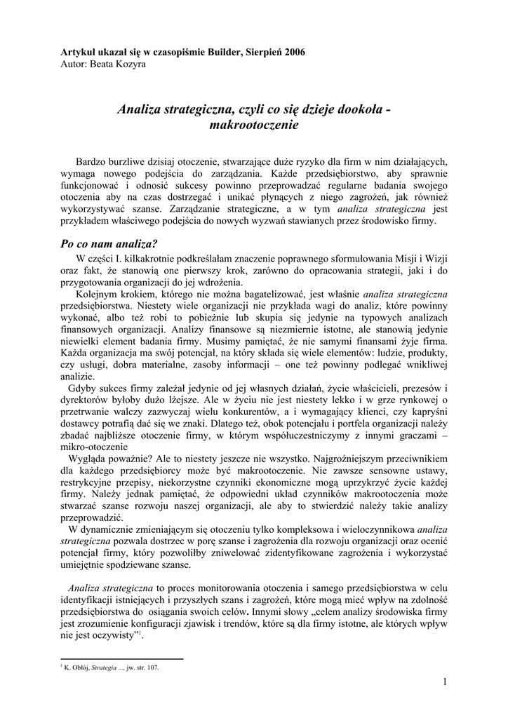 Artykuł ukazał się w czasopiśmie Builder, Sierpień 2006 Autor: Beata Kozyra Analiza strategiczna, czyli co się dzieje dookoła makrootoczenie Bardzo burzliwe dzisiaj otoczenie, stwarzające duże ryzyko dla firm w nim działających, wymaga nowego podejścia do zarządzania. Każde przedsiębiorstwo, aby sprawnie funkcjonować i odnosić sukcesy powinno przeprowadzać regularne badania swojego otoczenia aby na czas dostrzegać i unikać płynących z niego zagrożeń, jak również wykorzystywać szanse. Zarządzanie strategiczne, a w tym analiza strategiczna jest przykładem właściwego podejścia do nowych wyzwań stawianych przez środowisko firmy. Po co nam analiza? W części I. kilkakrotnie podkreślałam znaczenie poprawnego sformułowania Misji i Wizji oraz fakt, że stanowią one pierwszy krok, zarówno do opracowania strategii, jaki i do przygotowania organizacji do jej wdrożenia. Kolejnym krokiem, którego nie można bagatelizować, jest właśnie analiza strategiczna przedsiębiorstwa. Niestety wiele organizacji nie przykłada wagi do analiz, które powinny wykonać, albo też robi to pobieżnie lub skupia się jedynie na typowych analizach finansowych organizacji. Analizy finansowe są niezmiernie istotne, ale stanowią jedynie niewielki element badania firmy. Musimy pamiętać, że nie samymi finansami żyje firma. Każda organizacja ma swój potencjał, na który składa się wiele elementów: ludzie, produkty, czy usługi, dobra materialne, zasoby informacji – one też powinny podlegać wnikliwej analizie. Gdyby sukces firmy zależał jedynie od jej własnych działań, życie właścicieli, prezesów i dyrektorów byłoby dużo lżejsze. Ale w życiu nie jest niestety lekko i w grze rynkowej o przetrwanie walczy zazwyczaj wielu konkurentów, a i wymagający klienci, czy kapryśni dostawcy potrafią dać się we znaki. Dlatego też, obok potencjału i portfela organizacji należy zbadać najbliższe otoczenie firmy, w którym współuczestniczymy z innymi graczami – mikro-otoczenie Wygląda poważnie? Ale to niestety jeszcze nie wszystko. Najgroźniejszym przeciwnikiem dla każdego przedsiębiorcy może być makrootoczenie. Nie zawsze sensowne ustawy, restrykcyjne przepisy, niekorzystne czynniki ekonomiczne mogą uprzykrzyć życie każdej firmy. Należy jednak pamiętać, że odpowiedni układ czynników makrootoczenia może stwarzać szanse rozwoju naszej organizacji, ale aby to stwierdzić należy takie analizy przeprowadzić. W dynamicznie zmieniającym się otoczeniu tylko kompleksowa i wieloczynnikowa analiza strategiczna pozwala dostrzec w porę szanse i zagrożenia dla rozwoju organizacji oraz ocenić potencjał firmy, który pozwoliłby zniwelować zidentyfikowane zagrożenia i wykorzystać umiejętnie spodziewane szanse. Analiza strategiczna to proces monitorowania otoczenia i samego przedsiębiorstwa w celu identyfikacji istniejących i przyszłych szans i zagrożeń, które mogą mieć wpływ na zdolność przedsiębiorstwa do osiągania swoich celów. Innymi słowy „celem analizy środowiska firmy jest zrozumienie konfiguracji zjawisk i trendów, które są dla firmy istotne, ale których wpływ nie jest oczywisty”1. 1 K. Obłój, Strategia ..., jw. str. 107. 1 Obszary analizy strategicznej Wyróżniamy 3 podstawowe obszary analizy strategicznej: makrootoczenie, mikrootoczenie, zwane również otoczeniem konkurencyjnym lub sektorowym. Trzeci obszar, który powinien podlegać dokładnej analizie to sama organizacja. W niniejszym artykule skupimy się na pierwszym obszarze: makrootoczeniu. Pozostałe obszary zostaną omówione w kolejnych częściach. R y s u n e k 1 . O b s za r y a n a lizy s t r a t e g ic zn e j . Technologiczne Ekonomiczne Konkurencja Mikrootoczenie Społeczne demograficzne Właściciele Związki zawodowe Dostawcy FIRMA Sojusznicy strategiczni Odbiorcy Polityczno prawne Makrootoczenie Międzynarodowe Ź r ó d ł o: Beata Kozyra na podstawie, G. Giereszewska, M. Romanowska, Analiza strategiczna przedsiębiorstwa s. 33. Makrootoczenie Makrootoczenie to zespół warunków funkcjonowania przedsiębiorstwa wynikający z tego, że działa ono w określonym kraju czy regionie, w określonym układzie politycznym, ekonomicznym, czy społecznym. Cechą makrootoczenia jest to, że w sposób istotny określa ono możliwości działania i rozwoju przedsiębiorstw, stanowiąc tym samym obiektywne ograniczenia funkcjonowania biznesu2. Obiektywne, ponieważ są one takie same dla wszystkich przedsiębiorstw, a co więcej przedsiębiorstwa nie mają praktycznie wpływu na te czynniki. Jednak jeśli chodzi o oddziaływanie tych czynników na organizacje, tylko pozornie może wydawać się, że jest ono jednakowe dla wszystkich podmiotów działających w tym samym czasie i na tym samym terenie. W rzeczywistości otoczenie, chociaż takie samo dla wszystkich firm działających np. w Polsce, tworzy niejednakowe warunki działania, zależnie od branży, wielkości przedsiębiorstwa, regionu, itd. Dla jednej firmy może być szansą rozwojową, dla innej istotnym zagrożeniem lub możne nie wywoływać żadnego wpływu. Dlatego też każdy przedsiębiorca powinien obserwować swoje otoczenie ze punktu widzenia własnej organizacji. 2 G. Giereszewska, M. Romanowska, Analiza Strategiczna Przedsiębiorstwa, Warszawa 1995, str. 35 i 44 i dalsze 2 Narzędzia analizy strategicznej makrootoczenia Podstawowymi i względnie prostymi narzędziami do badania czynników makrootoczenia są analiza PEST oraz Scenariusze stanów otoczenia. Pozwalają one znaleźć odpowiedź na następujące pytania: które czynniki są lub mogą być szansami rozwoju firmy? Które czynniki są lub mogą zagrażać rozwojowi firmy? Jak długo te trendy mogą się utrzymywać? Analiza PEST3 Jest podstawowym narzędziem do opisu makrośrodowiska. Powyższa metoda, której nazwa pochodzi od pierwszych liter badanych czynników: P - polityczno - prawnych, E ekonomicznych, S - s