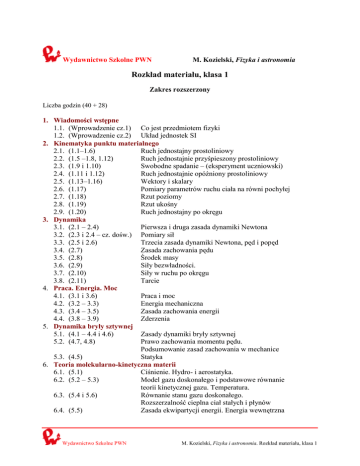Wydawnictwo Szkolne PWN M. Kozielski, Fizyka i astronomia Rozkład materiału, klasa 1 Zakres rozszerzony Liczba godzin (40 + 28) 1. Wiadomości wstępne 1.1. (Wprowadzenie cz.1) Co jest przedmiotem fizyki 1.2. (Wprowadzenie cz.2) Układ jednostek SI 2. Kinematyka punktu materialnego 2.1. (1.1–1.6) Ruch jednostajny prostoliniowy 2.2. (1.5 –1.8, 1.12) Ruch jednostajnie przyśpieszony prostoliniowy 2.3. (1.9 i 1.10) Swobodne spadanie – (eksperyment uczniowski) 2.4. (1.11 i 1.12) Ruch jednostajnie opóźniony prostoliniowy 2.5. (1.13–1.16) Wektory i skalary 2.6. (1.17) Pomiary parametrów ruchu ciała na równi pochyłej 2.7. (1.18) Rzut poziomy 2.8. (1.19) Rzut ukośny 2.9. (1.20) Ruch jednostajny po okręgu 3. Dynamika 3.1. (2.1 – 2.4) Pierwsza i druga zasada dynamiki Newtona 3.2. (2.3 i 2.4 – cz. dośw.) Pomiary sił 3.3. (2.5 i 2.6) Trzecia zasada dynamiki Newtona, pęd i popęd 3.4. (2.7) Zasada zachowania pędu 3.5. (2.8) Środek masy 3.6. (2.9) Siły bezwładności. 3.7. (2.10) Siły w ruchu po okręgu 3.8. (2.11) Tarcie 4. Praca. Energia. Moc 4.1. (3.1 i 3.6) Praca i moc 4.2. (3.2 – 3.3) Energia mechaniczna 4.3. (3.4 – 3.5) Zasada zachowania energii 4.4. (3.8 – 3.9) Zderzenia 5. Dynamika bryły sztywnej 5.1. (4.1 – 4.4 i 4.6) Zasady dynamiki bryły sztywnej 5.2. (4.7, 4.8) Prawo zachowania momentu pędu. Podsumowanie zasad zachowania w mechanice 5.3. (4.5) Statyka 6. Teoria molekularno-kinetyczna materii 6.1. (5.1) Ciśnienie. Hydro- i aerostatyka. 6.2. (5.2 – 5.3) Model gazu doskonałego i podstawowe równanie teorii kinetycznej gazu. Temperatura. 6.3. (5.4 i 5.6) Równanie stanu gazu doskonałego. Rozszerzalność cieplna ciał stałych i płynów 6.4. (5.5) Zasada ekwipartycji energii. Energia wewnętrzna Wydawnictwo Szkolne PWN M. Kozielski, Fizyka i astronomia. Rozkład materiału, klasa 1 7. Termodynamika 7.1. (6.1 i 6.2) Zerowa i I zasada termodynamiki 7.2. (6.3 cz.1) Izoprocesy gazu doskonałego – proces izochoryczny i proces izobaryczny 7.3. (6.3 cz.2) Izoprocesy gazu doskonałego – proces izotermiczny i proces adiabatyczny 7.4. (6.4 i 6.5) II zasada termodynamiki 7.5. (6.6) Cykl Carnota i Silniki cieplne 7.6. (6.7 – 6.9) Entropia 8. Stany skupienia materii 8.1 (7.1 i 7.2) Struktura ciał stałych 8.2. (7.3) Zjawisko włoskowatości. Napięcie powierzchniowe. Menisk 8.3. (7.4 i 7.5) Przemiany fazowe. Zjawisko parowania 9. Dynamika płynów 9.1. (8.1 – 8.5) Dynamika płynów — cz. 1 9.2. (8.6 i 8.7) Dynamika płynów — cz. 2 Na rozkład materiału nauczania znaczny wpływ ma przydział godzin na fizykę w całym cyklu kształcenia. MoŜe on być róŜny w róŜnych szkołach. Właściwy przydział godzin to 3 godziny tygodniowo w zakresie rozszerzonym nauczania fizyki oraz 2 godziny w zakresie podstawowym. JednakŜe nie we wszystkich szkołach będzie to realne. Dlatego podziału materiału nauczania dokonano przy załoŜeniu, Ŝe w kaŜdej klasie zostaną przydzielone na nauczanie fizyki 2 godziny tygodniowo w zakresie rozszerzonym i 1 godzina w zakresie podstawowym. Taki rozkład materiału jest moŜliwy przy uwzględnieniu zwiększonego wysiłku uczniów polegającego na rozwiązywaniu zadań w domu. Materiał został podzielony według powyŜszej specyfikacji. Zaproponowano liczbę godzin lekcyjnych. Pierwsza liczba oznacza liczbę lekcji ujętych w wykazie, a druga – liczbę godzin lekcyjnych przeznaczonych na lekcje pomocnicze: podsumowujące dany dział, ćwiczenia rachunkowe i dodatkowe doświadczenia, sprawdziany, itp. Przy podziale godzin przyjęto, Ŝe w pierwszej klasie w roku szkolnym są 34 tygodnie zajęć (formalnie w roku szkolnym jest 37 do 38 tygodni nauki, jednakŜe część godzin wypada ze względu na wycieczki, zajęcia nadzwyczajne, itp.). Przedstawiony podział materiału nauczania naleŜy traktować jako przykładową propozycję. Nauczyciel moŜe dokonać modyfikacji w zaleŜności od konkretnych warunków występujących w określonej szkole. Wydawnictwo Szkolne PWN M. Kozielski, Fizyka i astronomia. Rozkład materiału, klasa 1