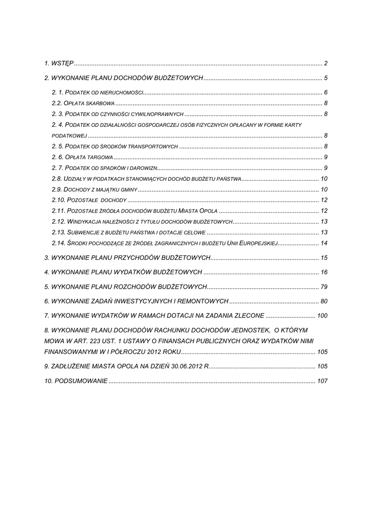 1. WSTĘP ................................................................................................................................................ 2 2. WYKONANIE PLANU DOCHODÓW BUDśETOWYCH ..................................................................... 5 2. 1. PODATEK OD NIERUCHOMOŚCI........................................................................................................ 6 2.2. OPŁATA SKARBOWA ........................................................................................................................ 8 2. 3. PODATEK OD CZYNNOŚCI CYWILNOPRAWNYCH ................................................................................ 8 2. 4. PODATEK OD DZIAŁALNOŚCI GOSPODARCZEJ OSÓB FIZYCZNYCH OPŁACANY W FORMIE KARTY PODATKOWEJ ........................................................................................................................................ 8 2. 5. PODATEK OD ŚRODKÓW TRANSPORTOWYCH ................................................................................... 8 2. 6. OPŁATA TARGOWA ......................................................................................................................... 9 2. 7. PODATEK OD SPADKÓW I DAROWIZN................................................................................................ 9 2.8. UDZIAŁY W PODATKACH STANOWIĄCYCH DOCHÓD BUDśETU PAŃSTWA ............................................. 10 2.9. DOCHODY Z MAJĄTKU GMINY ......................................................................................................... 10 2.10. POZOSTAŁE DOCHODY ............................................................................................................... 12 2.11. POZOSTAŁE ŹRÓDŁA DOCHODÓW BUDśETU MIASTA OPOLA .......................................................... 12 2.12. WINDYKACJA NALEśNOŚCI Z TYTUŁU DOCHODÓW BUDśETOWYCH .................................................. 13 2.13. SUBWENCJE Z BUDśETU PAŃSTWA I DOTACJE CELOWE ................................................................. 13 2.14. ŚRODKI POCHODZĄCE ZE ŹRÓDEŁ ZAGRANICZNYCH I BUDśETU UNII EUROPEJSKIEJ ........................ 14 3. WYKONANIE PLANU PRZYCHODÓW BUDśETOWYCH............................................................... 15 4. WYKONANIE PLANU WYDATKÓW BUDśETOWYCH ................................................................... 16 5. WYKONANIE PLANU ROZCHODÓW BUDśETOWYCH................................................................. 79 6. WYKONANIE ZADAŃ INWESTYCYJNYCH I REMONTOWYCH .................................................... 80 7. WYKONANIE WYDATKÓW W RAMACH DOTACJI NA ZADANIA ZLECONE ............................. 100 8. WYKONANIE PLANU DOCHODÓW RACHUNKU DOCHODÓW JEDNOSTEK, O KTÓRYM MOWA W ART. 223 UST. 1 USTAWY O FINANSACH PUBLICZNYCH ORAZ WYDATKÓW NIMI FINANSOWANYMI W I PÓŁROCZU 2012 ROKU.............................................................................. 105 9. ZADŁUśENIE MIASTA OPOLA NA DZIEŃ 30.06.2012 R.............................................................. 105 10. PODSUMOWANIE ........................................................................................................................ 107 Informacja o przebiegu wykonania budŜetu miasta Opola za I półrocze 2012 r. 1. WSTĘP Zgodnie z art. 266 ust. 1 z dnia 27 sierpnia 2009 roku o finansach publicznych (Dz. U. Nr 157, poz. 1240 z późn. zm.), Prezydent Miasta Opola przedstawia Radzie Miasta Opola oraz Regionalnej Izbie Obrachunkowej w Opolu informację o przebiegu wykonania budŜetu miasta Opola za I półrocze 2012 roku, zawierającą m.in. część opisową, a takŜe część tabelaryczną, sporządzoną w szczegółowości załączników do uchwały budŜetowej. Część opisowa obejmuje omówienie zmian w planie budŜetu dokonane przez Radę Miasta Opola oraz Prezydenta Miasta Opola w okresie pierwszego półrocza, wykonanie dochodów, przychodów, wydatków i rozchodów budŜetu z uzasadnieniem pozycji, w których wskaźnik wykonania znacząco odbiega od wskaźnika upływu czasu, a takŜe stan zadłuŜenia miasta Opola na dzień 30.06.2012 r. Podstawą gospodarki finansowej miasta Opola w I półroczu 2012 roku była uchwała Rady Miasta Opola Nr XX/299/11 z dnia 16 grudnia 2011 r. w sprawie uchwalenia budŜetu miasta Opola na 2012 rok. W ramach uchwalonego budŜetu ustalono: Dochody w tym: - dochody bieŜące - dochody majątkowe 603.841.695 zł Wydatki w tym: - wydatki bieŜące - wydatki majątkowe 637.195.931 zł 523.126.160 zł 80.715.535 zł 507.070.068 zł 130.125.863 zł Przychody 78.308.208 zł Rozchody 44.953.972 zł Deficyt budŜetu 33.354.236 zł W okresie I półrocza 2012 roku dokonano zmian w planie budŜetu miasta Opola uchwałami Rady Miasta Opola (w ilości 5) oraz zarządzeniami Prezydenta Miasta Opola (w łącznej ilości 37). Zarządzenia Prezydenta Miasta Opola dotyczyły: • zmian w planie dochodów i wydatków budŜetu miasta Opola na 2012 rok związanych ze zmianą kwot dotacji celowych na zadania zlecone przez administrację rządową, na zadania własne oraz na zadania realizowane na podstawie porozumień – w ilości 11; • zmian w planie dochodów i wydatków budŜetu miasta Opola na 2012 r. związanych ze zwrotem dotacji otrzymanych z budŜetu państwa – w ilości 4; • rozdysponowania rezerwy budŜetowej w planie budŜetu miasta Opola na 2012 rok – w ilości 5; • dokonania zmian w planie wydatków budŜetu miasta Opola na 2012 rok w ramach tego samego działu – w ilości 17. Szczegółowe zestawienie uchwał Rady Miasta Opola oraz zarządzeń Prezydenta Miasta Opola przedstawia poniŜsza tabela: 2 Informacja o przebiegu wykonania budŜetu miasta Opola za I półrocze 2012 r. L.p. Zarządzenie / uchwała z dnia w sprawie dokonania zmian w planie wydatków budŜetu miasta Opola na 2012 rok w ramach tego samego działu dokonania zmian w planie wydatków budŜetu miasta Opola na 2012 rok w ram