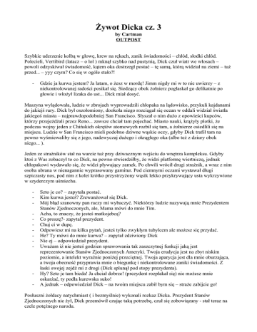 Żywot Dicka cz. 3 by Cartman OUTPOST Szybkie uderzenie kolbą w głowę, krew na rękach, zanik świadomości – chłód, słodki chłód. Polecieli, Vertibird (latacz – o lol ) mknął szybko nad pustynią, Dick czuł wiatr we włosach – powoli odzyskiwał świadomość, kątem oka dostrzegł postać – tę samą, którą widział na ziemi – tuż przed... – yyy czym? Co się w ogóle stało?! - Gdzie ja kurwa jestem? Ja latam, o żesz w mordę! Jimm nigdy mi w to nie uwierzy – z niekontrolowanej radości posikał się. Siedzący obok żołnierz pogłaskał go delikatnie po głowie i włożył lizaka do ust... Dick miał dosyć. Maszyna wylądowała, ludzie w zbrojach wyprowadzili chłopaka na lądowisko, przykuli kajdanami do jakiejś rury. Dick był oszołomiony, dookoła niego rozciągał się ocean w oddali widział światła jakiegoś miasta – najprawdopodobniej San Francisco. Słyszał o nim dużo z opowieści kupców, którzy przejeżdżali przez Reno... zawsze chciał tam pojechać. Miasto nauki, krążyły plotki, że podczas wojny jeden z Chińskich okrętów atomowych rozbił się tam, a żołnierze osiedlili się na miejscu. Ludzie w San Francisco mieli podobno dziwne wąskie oczy, gdyby Dick trafił tam na pewno wyśmiewaliby się z jego, nadzwyczaj dużego i okrągłego oka (albo też z dziury obok niego... ). Jeden ze strażników stał na warcie tuż przy dziwacznym wejściu do wnętrza kompleksu. Gdyby ktoś z Was zobaczył to co Dick, na pewno stwierdziłby, że widzi platformę wiertniczą, jednak chłopakowi wydawało się, że widzi pływający zamek. Po chwili wrócił drugi strażnik, a wraz z nim osoba ubrana w nienagannie wyprasowany garnitur. Pod ciemnymi oczami wystawał długi szpiczasty nos, pod nim z kolei krótko przystrzyżony wąsik lekko przykrywający usta wykrzywione w szyderczym uśmiechu. - - Szto je co? – zapytała postać. Kim kurwa jesteś? Zrewanżował się Dick. Mój błąd szanowny pan raczy mi wybaczyć. Niektórzy ludzie nazywają mnie Prezydentem Stanów Zjednoczonych, ale, Mama mówi do mnie Tim. Acha, to znaczy, że jesteś matkojebcą? Co proszę?- zapytał prezydent. Chuj ci w dupę. Odpowiesz mi na kilka pytań, jesteś tylko zwykłym tubylcem ale możesz się przydać. He? Ty mówi do mnie kurwa? – zapytał zdziwiony Dick Nie ej – odpowiedział prezydent. Uważam iż nie jesteś godzien sprawowania tak zaszczytnej funkcji jaką jest reprezentowanie Stanów Zjednoczonych Ameryki. Twoja erudycja jest na zbyt niskim poziomie, a intelekt wyraźnie poniżej przeciętnej. Twoja aparycja jest dla mnie oburzająca, a twoja obecność przyprawia mnie o biegunkę i niekontrolowane zaniki świadomości. Z łaski swojej zejdź mi z drogi (Dick splunął pod stopy prezydenta). Hy? Szto je tam bieda! Ja chciał dobrze! (prezydent rozpłakał się) nie możesz mnie oskarżać, ty podła kurewska suko! A jednak – odpowiedział Dick – na twoim miejscu zabił bym się – straże zabijcie go! Posłuszni żołdacy natychmiast ( i bezmyślnie) wykonali rozkaz Dicka. Prezydent Stanów Zjednoczonych nie żył, Dick przemówił czując taką potrzebę, czuł się zobowiązany - stał teraz na czele potężnego narodu. - Gdybym był waszym prezydentem, aczkolwiek nie jestem nakazałbym eksterminację wszystkich istot zamieszkujących stały kontynent, począwszy od zakładników przetrzymywanych w bazie. (Dick mścił się za krzywdy z dzieciństwa) A i jeszcze jedno, przynieście mi jeta, rotguta i dziwkę – tylko żywą! – mam dosyć trupów i brahminów, w końcu też mi się coś należy od życia, co nie kurwa?! * hszzzt* Tak jest panie prezydencie! – odpowiedział jeden z żołdaków. Nagle rozległ się huk, stalowe drzwi broniące wejścia do fortecy rozsypały się w pył. Na dziedziniec wybiegła postać. - Halt kurwa! To ja - Hans Von Krankenhaus! Na pewno pamiętasz mnie z opowieści Mikensztackich, które mama czytała ci przed zaśnięciem. Ni chuja, a może kurwa - nie pamiętam. Pierdol się, kto tu dowodzi? * hszzzt* - To zależy kto pyta – odpowiedział pilot Vertibirda. (latacza – o lol ) Jestem Wielki Klaus Von Krankenhaus! Dowodziłem wojskami próbującymi podbić Mikstat za czasów Wielkiej Wojny, ale ten pojeb Hetman rozpierdolił mi armię i zamknął w komorze kriogenicznej na tej pierdolonej platformie. A tak w ogóle to dowodzę frontem wyzwolenia Jerozolimy! Drżyj przed moim majestatem! Wszyscy zaczęli drżeć. (żołnierze spanikowali) - * hszzt* - Dowodzi nami Prezydent Dick! Co do kurwy nędzy? Pojebało was, ja nawet kurwa nie potrafię czytać! To nie istotne! Przejmuję kontrolę nad Enklawą! – powiedział Klaus – Wywieźcie „starego” prezydenta na Golgotę – myślę, że widok z pala mu się spodoba – buehehehehhehehe. * hszzzt * Sir, jest Sir! Dick po raz kolejny oberwał kolbą karabinu gausussa w głowę, tradycyjnie stracił przytomność a po policzkach litrami ściekała mu krew. Dotarli na miejsce. Golgota – to bardzo ponure miejsce, gangsterzy z Nowego reno wywozili tutaj swoich klientów... na wieczny spoczynek. Był to płaski teren usiany wzdłuż i w szerz grobami... przez środek tego przedziwnego miejsca przechodziła droga, stał tam drogowskaz jedna ze strzałek wskazywała w prawo był tam napis: „Nowe Reno” , druga skierowana w dół głosiła: „Piekło”... Dla Dicka przygotowano dogodne miejsce, północna część cmentarza była zaciszna, wokół było tylko kilka świeżych grobów, niektóre z nich rozkopały wilki – wszędzie leżały ludzkie szczątki – ale nie to było najgorsze. Tuż przy „znaku drogowym” w ziemię powbijano szereg pali... na każdym z nich nabito ludzkie ciało! Pomiędzy dorosłymi na mniejszych palach zwisały bezwładnie ciała dzieci... gałki oczne wydziobane przez ptaki, skóra odchodząca od kości... płyny ustrojowe ściekające po palach, ludzkie szczątki... odłamki kości, poodrywane kończyny. Tuta