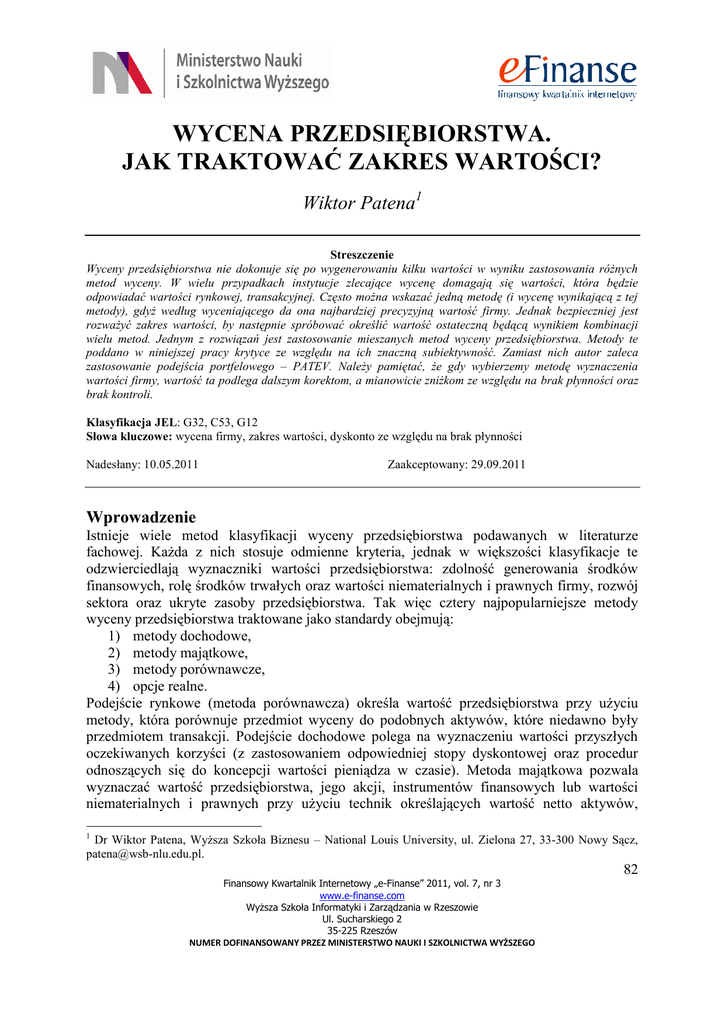 WYCENA PRZEDSIĘBIORSTWA. JAK TRAKTOWAĆ ZAKRES WARTOŚCI? Wiktor Patena1 Streszczenie Wyceny przedsiębiorstwa nie dokonuje się po wygenerowaniu kilku wartości w wyniku zastosowania różnych metod wyceny. W wielu przypadkach instytucje zlecające wycenę domagają się wartości, która będzie odpowiadać wartości rynkowej, transakcyjnej. Często można wskazać jedną metodę (i wycenę wynikającą z tej metody), gdyż według wyceniającego da ona najbardziej precyzyjną wartość firmy. Jednak bezpieczniej jest rozważyć zakres wartości, by następnie spróbować określić wartość ostateczną będącą wynikiem kombinacji wielu metod. Jednym z rozwiązań jest zastosowanie mieszanych metod wyceny przedsiębiorstwa. Metody te poddano w niniejszej pracy krytyce ze względu na ich znaczną subiektywność. Zamiast nich autor zaleca zastosowanie podejścia portfelowego – PATEV. Należy pamiętać, że gdy wybierzemy metodę wyznaczenia wartości firmy, wartość ta podlega dalszym korektom, a mianowicie zniżkom ze względu na brak płynności oraz brak kontroli. Klasyfikacja JEL: G32, C53, G12 Słowa kluczowe: wycena firmy, zakres wartości, dyskonto ze względu na brak płynności Nadesłany: 10.05.2011 Zaakceptowany: 29.09.2011 Wprowadzenie Istnieje wiele metod klasyfikacji wyceny przedsiębiorstwa podawanych w literaturze fachowej. Każda z nich stosuje odmienne kryteria, jednak w większości klasyfikacje te odzwierciedlają wyznaczniki wartości przedsiębiorstwa: zdolność generowania środków finansowych, rolę środków trwałych oraz wartości niematerialnych i prawnych firmy, rozwój sektora oraz ukryte zasoby przedsiębiorstwa. Tak więc cztery najpopularniejsze metody wyceny przedsiębiorstwa traktowane jako standardy obejmują: 1) metody dochodowe, 2) metody majątkowe, 3) metody porównawcze, 4) opcje realne. Podejście rynkowe (metoda porównawcza) określa wartość przedsiębiorstwa przy użyciu metody, która porównuje przedmiot wyceny do podobnych aktywów, które niedawno były przedmiotem transakcji. Podejście dochodowe polega na wyznaczeniu wartości przyszłych oczekiwanych korzyści (z zastosowaniem odpowiedniej stopy dyskontowej oraz procedur odnoszących się do koncepcji wartości pieniądza w czasie). Metoda majątkowa pozwala wyznaczać wartość przedsiębiorstwa, jego akcji, instrumentów finansowych lub wartości niematerialnych i prawnych przy użyciu technik określających wartość netto aktywów, 1 Dr Wiktor Patena, Wyższa Szkoła Biznesu – National Louis University, ul. Zielona 27, 33-300 Nowy Sącz, [email protected]. 82 Finansowy Kwartalnik Internetowy „e-Finanse” 2011, vol. 7, nr 3 www.e-finanse.com Wyższa Szkoła Informatyki i Zarządzania w Rzeszowie Ul. Sucharskiego 2 35-225 Rzeszów NUMER DOFINANSOWANY PRZEZ MINISTERSTWO NAUKI I SZKOLNICTWA WYŻSZEGO dostosowując wartości księgowe do wartości rynkowych. Wreszcie, podejście oparte na realnych opcjach jest próbą wyceny ukrytych zasobów oraz potencjału przedsiębiorstwa, które mogą się zmaterializować w określonym czasie w przyszłości. Metody te wymagają innych danych wejściowych, innych założeń oraz odmiennego podejścia do prognozowanego okresu. W wyniku zastosowania kilku metod wyceny – z jednej strony – dysponujemy pewnym zakresem wartości, z drugiej zaś – musimy podjąć decyzję dotyczącą wartości ostatecznej wycenianego przedsiębiorstwa. Istniejące standardy wyceny zawierają jedynie sugestie dotyczące sposobu postępowania. Poniżej przedstawiamy przegląd wskazówek zawartych w amerykańskich standardach opracowanych przez NACVA (National Association of Certified Valuation Analysts), ASA (American Society of Appraisers) i IBA (Institute of Business Appraisers). Standardy ASA sugerują, że: „użyte metody wyceny powinny być wynikiem profesjonalnej oceny osoby dokonującej wyceny. Wyboru należy dokonać, biorąc pod uwagę, która metoda jest koncepcyjnie najbardziej odpowiednia oraz które dane są najłatwiej dostępne i najbardziej wiarygodne”. Standardy te wspominają, że metody oparte na aktywach nie powinny być nigdy używane jako jedyne. Decyzja dotycząca wyboru metody, na której oparty będzie wynik końcowy, powinna wynikać z oceny osoby dokonującej wyceny, a nie z założonego z góry wzoru. W przypadku użycia kilku metod osoba dokonująca wyceny jest zobligowana do podania uzasadnienia wag użytych przy obliczaniu średniej ważonej. Na przykład osoba wyceniająca powinna opierać się na standardach wyceny, celu wyceny, specyfice przedsiębiorstwa (np. czy przedsiębiorstwo posiada środki nieobrotowe znacznej wartości), jakości danych użytych do wyceny. Standardy IBA mówią, że osoba dokonująca wyceny powinna podać, jakie metody rozważono, oraz podstawę ich odrzucenia czy też wyboru. Według tych standardów wolno natomiast podać zakres wartości, szczególnie w przypadku zastosowania kilku metod. Według standardów AICPA należy rozważyć trzy metody – osoba dokonująca wyceny powinna użyć odpowiednich metod wyceny w zależności od przedmiotu wyceny. Osoba dokonująca wyceny powinna skorelować wyniki uzyskane przy użyciu różnych metod, aby ocenić wiarygodność wyników w zakresie jakości i dostępności informacji. Konieczne jest również określenie, czy wartość ostateczna będzie wynikiem jednej metody, czy też ich kombinacji. Standardy NACVA wspominają również trzy kategorie metod lub ich kombinacje. Osoba dokonująca wyceny powinna kierować się własnym profesjonalnym osądem przy wyborze jednej lub wielu metod, które najtrafniej wyznaczą wartość przedsiębiorstwa. Jednocześnie należy zaznaczyć, czy kombinacja wyników uzyskanych z dwóch różnych metod jest konieczna dla określenia wartości przedsiębiorstwa. Jak więc widzimy, często rozwiązaniem jest podanie całego zakresu wartości (rysunek 1). Metody wyceny generują kilka wartości, pozostałe w
