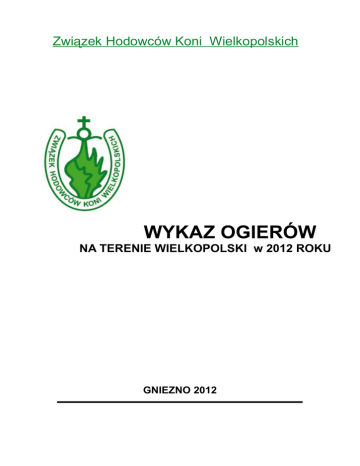 Związek Hodowców Koni Wielkopolskich WYKAZ OGIERÓW NA TERENIE WIELKOPOLSKI w 2012 ROKU GNIEZNO 2012 OBJAŚNIENIA SKRÓTÓW xx............................................... oo............................................... xx oo........................................... xo............................................... bad.wirt....................................... baw............................................. bwp............................................ hafl............................................. hes.............................................. han.............................................. hol............................................... m................................................. kn................................................ mk................................................ KWPN ........................................ pełna krew angielska czysta krew arabska czysta krew anglo-arabska półkrew anglo-arabska konie badeńsko wirtenberskie bawarski koń gorącokrwisty belgijski koń gorącokrwisty haflinger konie heskie konie hanowerskie konie holsztynskie małopolska konik polski mały koń królewska holenderska księga stadna koni gorącokrwistych sf ................................................ selle francaise śl................................................. śląska trk................................................ konie trakeńskie wlkp............................................ wielkopolska z.................................................. zimnokrwista br................................................. brudno c................................................... ciemno gn................................................. gniada izab............................................... izabelowata j.................................................... jasno kaszt............................................. kasztanowata mysz............................................. myszata sk.................................................. skaro 1328.............................................. (przykładowo) liczba przed nazwą konia oznacza numer ewidencyjny. 164-198-21.................................... wymiary: wysokość-obwód klatki piersiowejobwód nadpęcia pkt.................................................. ilość punktów bonitacyjnych NN................................................. niewiadomego pochodzenia po................................................... po ogierze od................................................... od klaczy PR12………………………………… Punkt Rozpłodowy w sezonie 2012 PR12T/S/W…………………………. T- og. sztumski, S - og. sokólski, W– użytek własny 2 3 3 KATEGORYZACJA OGIERÓW Kategoryzacja przewiduje ocenianie każdego ogiera na podstawie punktów hodowlanych otrzymanych za ocenę jego potomstwa oraz na podstawie wartości użytkowej potwierdzonej w Mistrzostwach Polski Młodych Koni lub w sporcie jeździeckim. Wyniki sportowe, na podstawie których można zmienić kategorie ogierów, muszą być oficjalnymi wynikami sportowymi, potwierdzonymi przez Polski Związek Jeździecki. Każda zmiana kategorii wymaga weryfikacji wymiarów i bonitacji. Nowym zasadom kategoryzacji podlegają ogiery wpisywane do ksiąg od 2004 roku. Ogiery wpisane do ksiąg przed 2004 rokiem mogą być poddane nowym zasadom kategoryzacji na wniosek właścicieli. Kategorie ogierów są podzielone na dwie grupy: -Kategorie ogierów szlachetnych -Kategorie ogierów zimnokrwistych. Kategorie ogierów szlachetnych (Ras :małopolskiej, wielkopolskiej, polski koń szlachetny półkrwi) KATEGORIA C Ogiery, które odpowiadają warunkom eksterierowym i rodowodowym oraz ukończyły z wynikiem pozytywnym próby dzielności w ZT lub uzyskały określone wyniki w alternatywnych próbach dzielności mogą być używane w rozrodzie w kategorii C. Ogiery kat. C mogą być używane w rozrodzie maksymalnie do 9 roku życia włącznie. Nie uzyskanie w tym okresie kat. B powoduje wycofanie ogiera z rozrodu. KATEGORIA B Ogiery z kat. C, w wieku 4 - 9 lat mogą uzyskać kat. B, na podstawie decyzji Komisji Księgi Stadnej, jeżeli potwierdziły swoją wartość użytkową w Mistrzostwach Polski Młodych Koni lub w sporcie jeździeckim. Ogiery, które nie ukończyły ZT, a uzyskały prawo wpisu do ksiąg stadnych na podstawie alternatywnych prób dzielności, otrzymują przy wpisie do księgi kategorię B, jeżeli spełnią warunki wymienione w ust. 1 (MPMK, sport jeździecki). Ogiery, które uzyskały kat. B na podstawie wyników określonych (MPMK, sport jeździecki) winny w okresie posiadania kat. C oraz do 4 sezonów po otrzymaniu kategorii B uzyskać min. 20 pkt. hodowlanych. Nie spełnienie tego warunku powoduje wycofanie ogiera z rozrodu. Ogiery kat. C, które nie spełniły wymagań określonych w ust. 1 (MPMK, sport jeździecki), mogą otrzymać kat. B, jeżeli do 9 roku życia włącznie uzyskały minimum 35 pkt. hodowlanych za potomstwo. Ogiery te winny w okresie posiadania kat. C oraz do 4 sezonów po otrzymaniu kategorii B uzyskać min. 70 pkt. hodowlanych za potomstwo. Nie spełnienie tego warunku powoduje wycofanie ogiera z rozrodu. Ogiery, które w próbach dzielności po 100-dniowym treningu osiągnęły wynik równy lub wyższy od 125 punktów indeksowych i uzyskały min. 81 punktów za ocenę pokroju, otrzymują kategorię B. 4 4 Jeżeli ogier nie spełni jednego z powyższych warunków, to w wieku 7 lat przechodzi do kat. C. KATEGORIA A Ogiery mogą uzyskać kat. A jeżeli uzyskały: minimum 200 pkt. hodowlanych za potomstwo wpisane do ksiąg lub 2. 100 pkt. hodowlanych za potomstwo wpisane do ksiąg oraz osiągnęły następujące wyniki w sporcie jeździeckim (w całej karierze): a. skoki przez przeszkody -10 razy miejsca 1-3 w konkursach 140 cm i wyższych na ZOO lub miejsca 1-6 na zawodach międzynarodowych rangi CSI, CSIO i wyższych b. ujeżdżenie - 10 razy wynik min. 66 % w klasie CC na zawodach Z