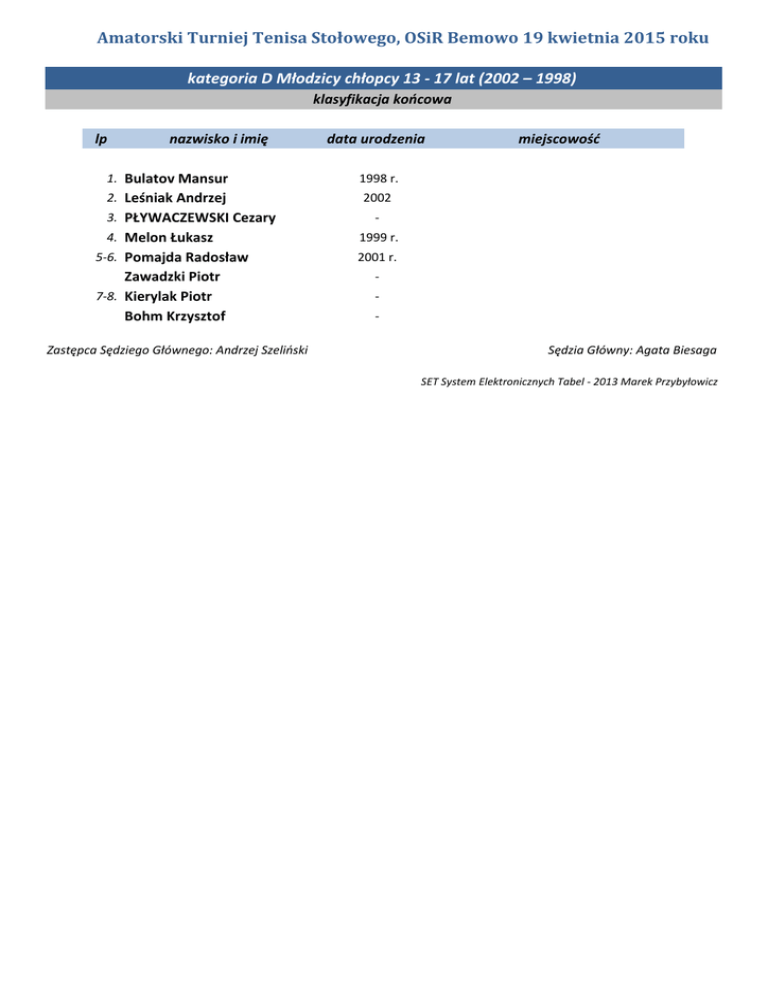 Amatorski Turniej Tenisa Stołowego, OSiR Bemowo 19 kwietnia 2015 roku kategoria D Młodzicy chłopcy 13 - 17 lat (2002 – 1998) klasyfikacja końcowa lp nazwisko i imię data urodzenia 1. Bulatov Mansur 1998 r. 2. Leśniak Andrzej 2002 3. PŁYWACZEWSKI Cezary 4. Melon Łukasz 5-6. Pomajda Radosław Zawadzki Piotr 7-8. Kierylak Piotr Bohm Krzysztof Zastępca Sędziego Głównego: Andrzej Szeliński miejscowość 1999 r. 2001 r. Sędzia Główny: Agata Biesaga SET System Elektronicznych Tabel - 2013 Marek Przybyłowicz Amatorski Turniej Tenisa Stołowego, OSiR Bemowo 19 kwietnia 2015 roku kategoria D Młodzicy chłopcy 13 - 17 lat (2002 – 1998) turniej główny (gry do 3 wygranych setów) 1/4 finału 1 1/2 finału Melon Łukasz 2 A 8 finał 2 miejsce 3:0 (5,9,11) PŁYWACZEWSKI Cezary PŁYWACZEWSKI Cezary 1 5 Leśniak Andrzej 4 Kierylak Piotr 3 Zawadzki Piotr B C 6 Bulatov Mansur 7 Pomajda Radosław 2 Bohm Krzysztof 2 3:0 (8,3,8) Leśniak Andrzej Leśniak Andrzej 1 3:0 (5,4,3) 2 3:0 (6,5,11) Bulatov Mansur 2 3:0 (0,6,2) Bulatov Mansur 2 D zwycięzca 1 miejsce Bulatov Mansur 1 3:0 (8,2,9) Pomajda Radosław 1 3:0 (4,3,5) Amatorski Turniej Tenisa Stołowego, OSiR Bemowo 19 kwietnia 2015 roku kategoria D Młodzicy chłopcy 13 - 17 lat (2002 – 1998) turniej pocieszenia (gry do 3 wygranych setów) 7-8 miejsce A Melon Łukasz B Kierylak Piotr 5-6 miejsce 1 3:0 (4,3,7) Melon Łukasz 2 C Zawadzki Piotr D Bohm Krzysztof 4 miejsce 3 miejsce 1 3:0 (5,8,9) Melon Łukasz 2 3:0 (2,7,8) PŁYWACZEWSKI Cezary Pomajda Radosław 1 3:0 (4,6,9) Zawadzki Piotr 1 PŁYWACZEWSKI Cezary Zastępca Sędziego Głównego: Andrzej Szeliński PŁYWACZEWSKI Cezary 2 3:1 (8,-10,6,3) Sędzia Główny: Agata Biesaga SET System Elektronicznych Tabel - 2013 Marek Przybyłowicz
