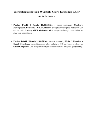 Weryfikacja spotkań Wydziału Gier i Ewidencji ZZPN do 26.08.2016 r. Puchar Polski I Runda 21.08.2016r. - mecz pomiędzy Merkury Nowogródek Pomorski - GKS Golenice, zweryfikowano jako walkower 0:3 na korzyść drużyny GKS Golenice. Gra nieuprawnionego zawodnika w drużynie gospodarzy. Puchar Polski I Runda 21.08.2016r. - mecz pomiędzy Unia II Żalęcino Orzeł Grzędzice, zweryfikowano jako walkower 0:5 na korzyść drużyny Orzeł Grzędzice. Gra nieuprawnionych zawodników w drużynie gospodarzy.